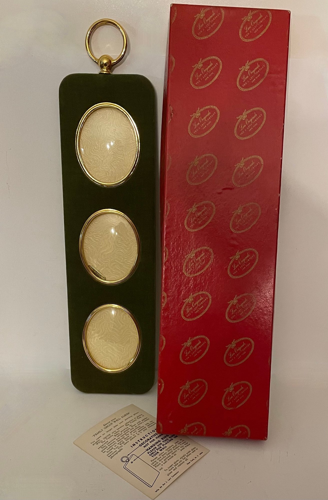 A very fine triple hanging frame by J. Levi Co. of NYC. It's gold plated and in the original box and never used.