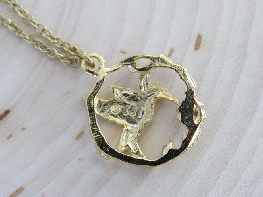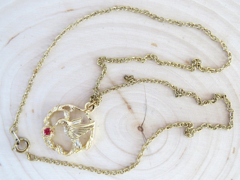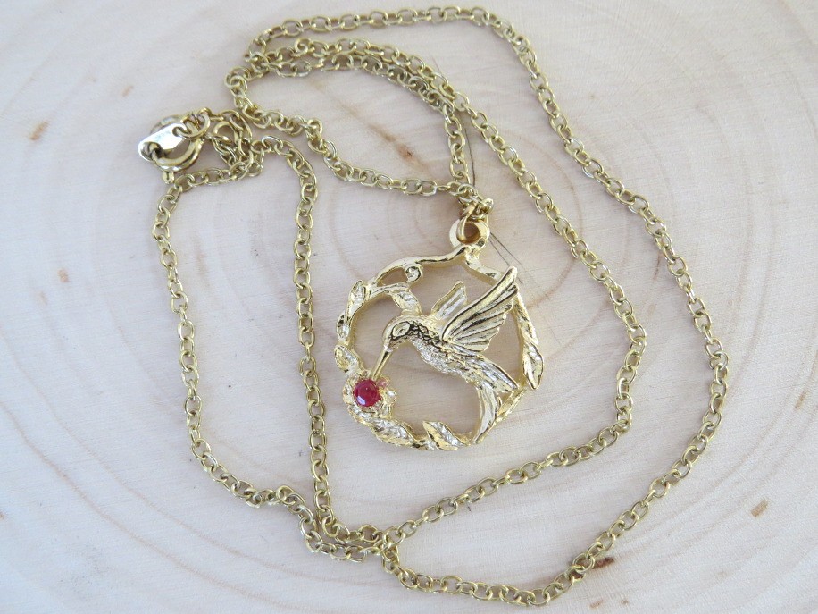 This vintage JJI necklace features a delicate hummingbird pendant adorned with a glass ruby accent, exuding charm and timeless elegance. The pendant is encircled with a leaf design and measures approximately 1" long and 3/4" wide on an 18" chain with working spring ring clasp. It is signed on the back "© JJI".