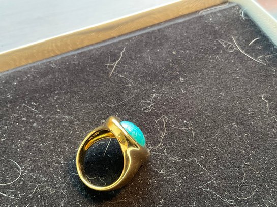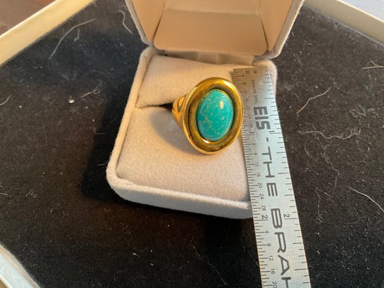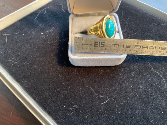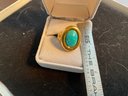 Center Stone: Features a smooth, oval-cut turquoise cabochon with a vibrant blue-green hue.