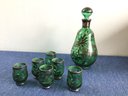 VINTAGE Green Glass Decanter And Cups Set Sterling Trimmed?