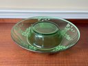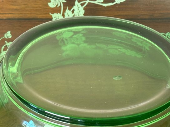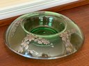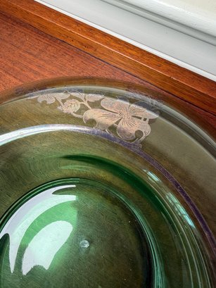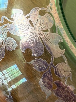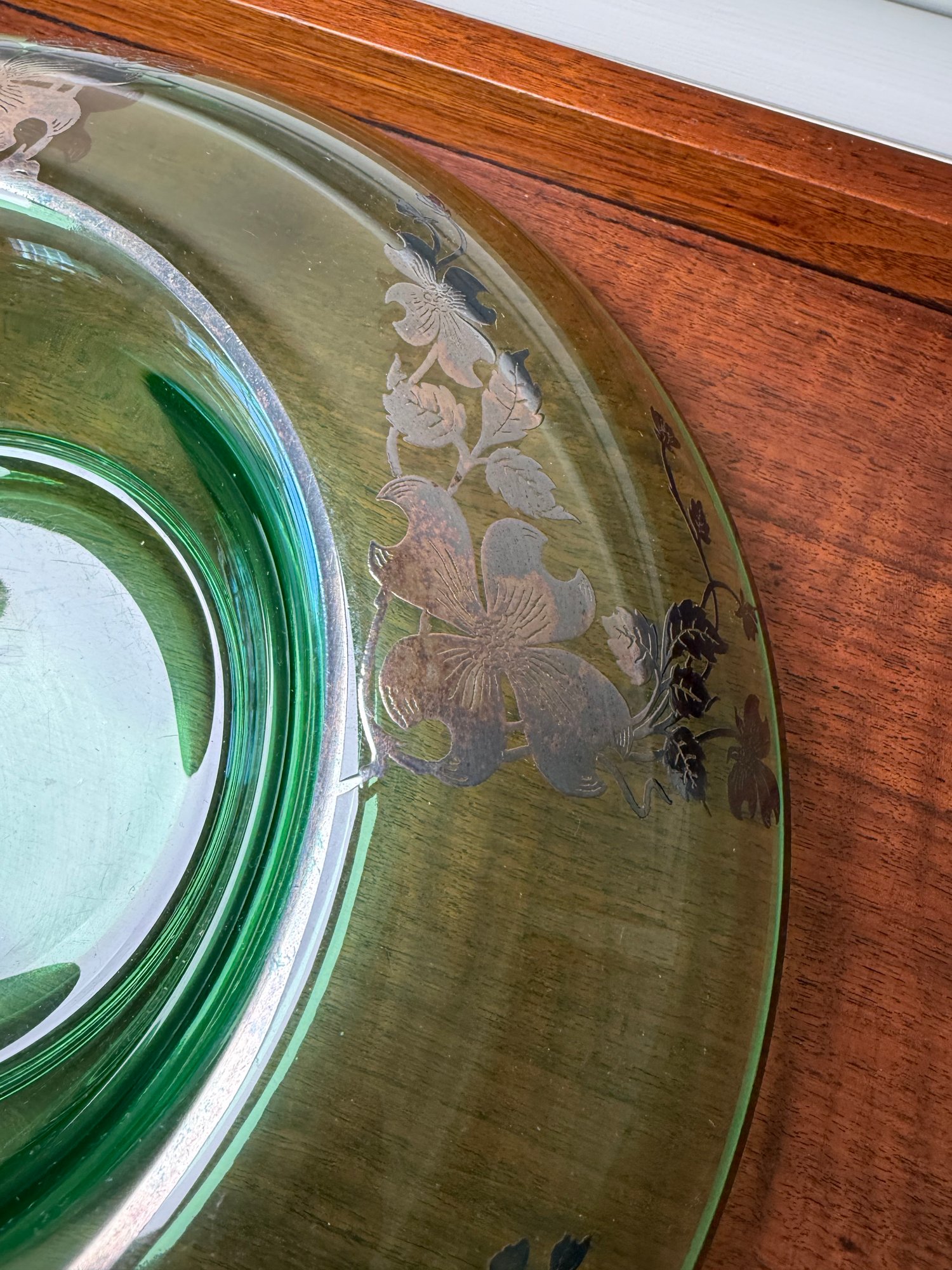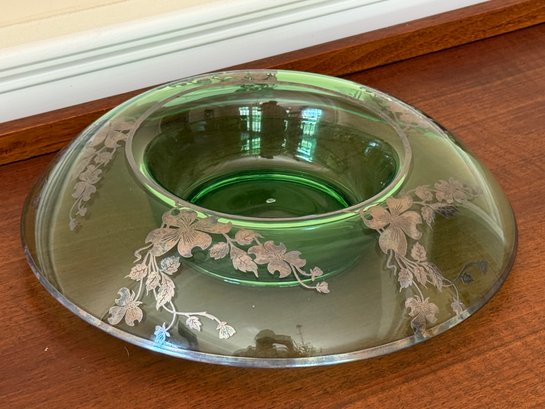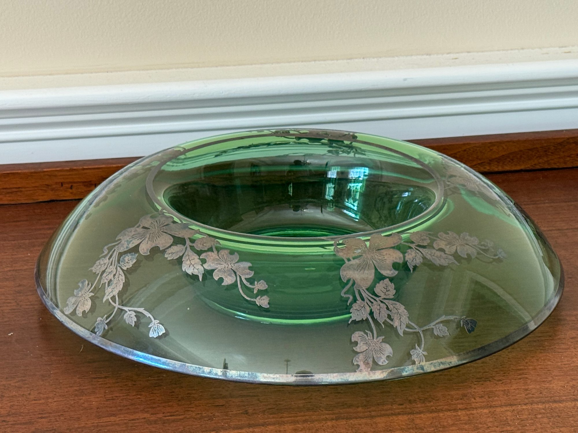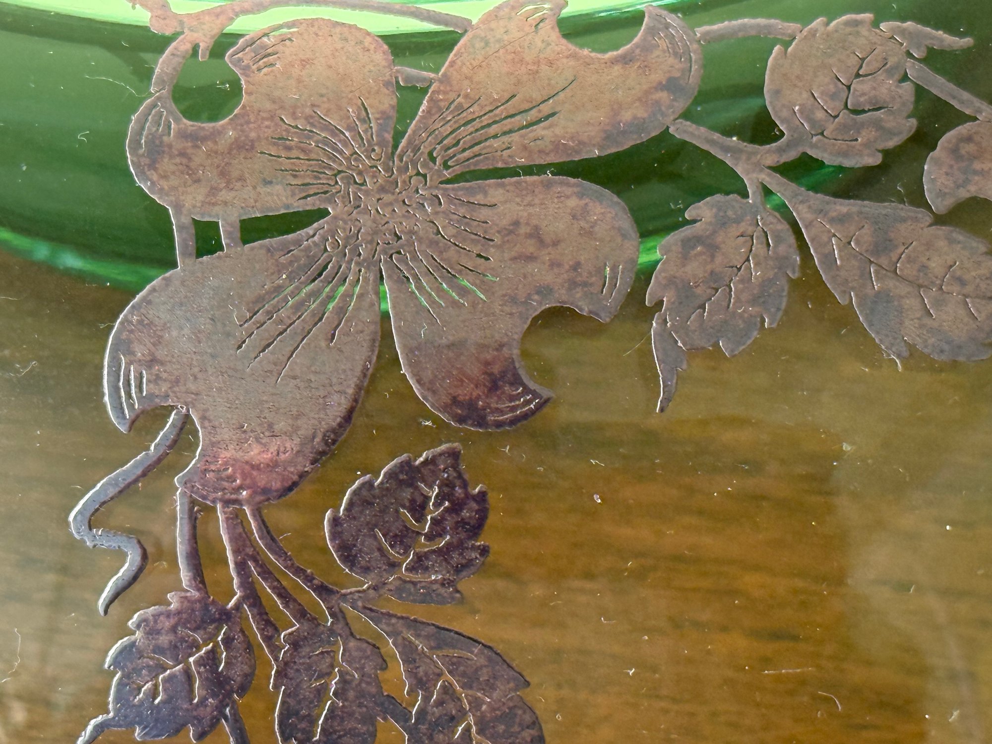 This bowl has beautiful silver overlay throughout which compliments the green glass bowl.