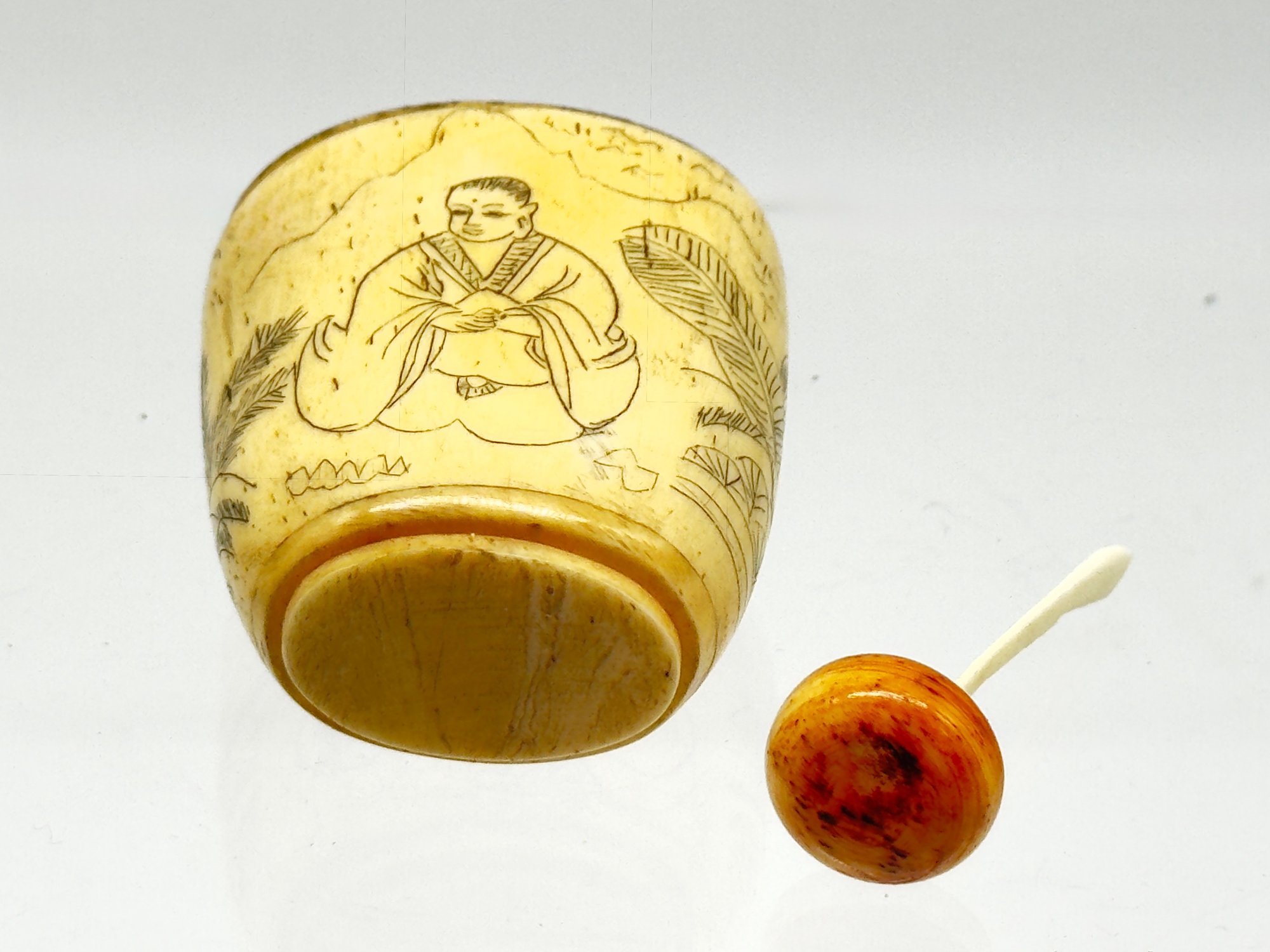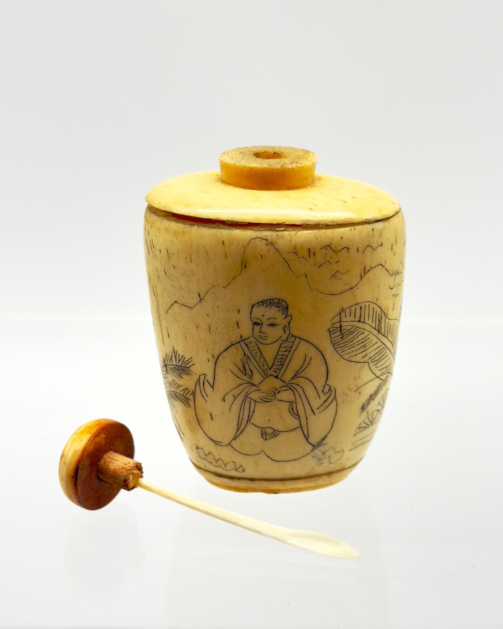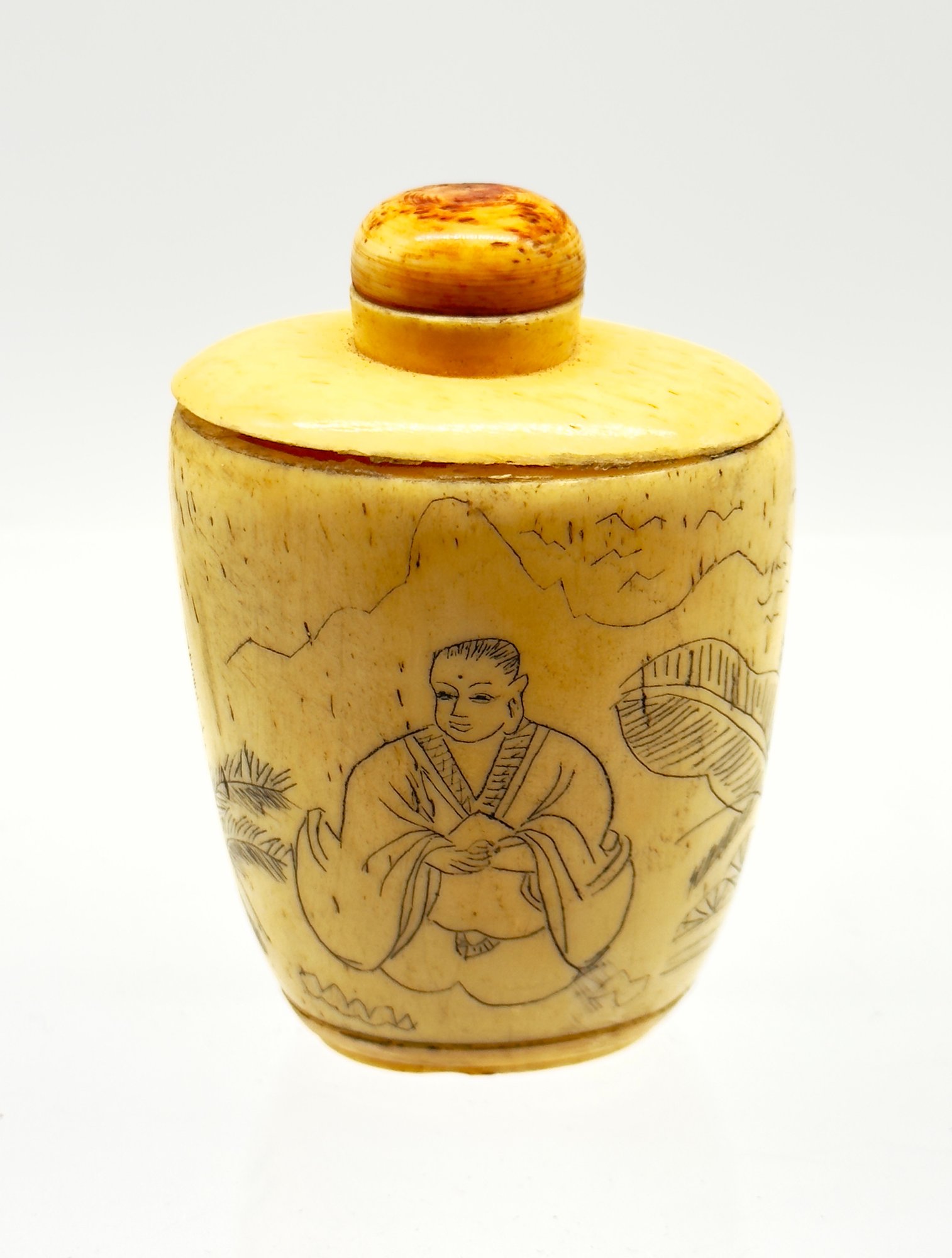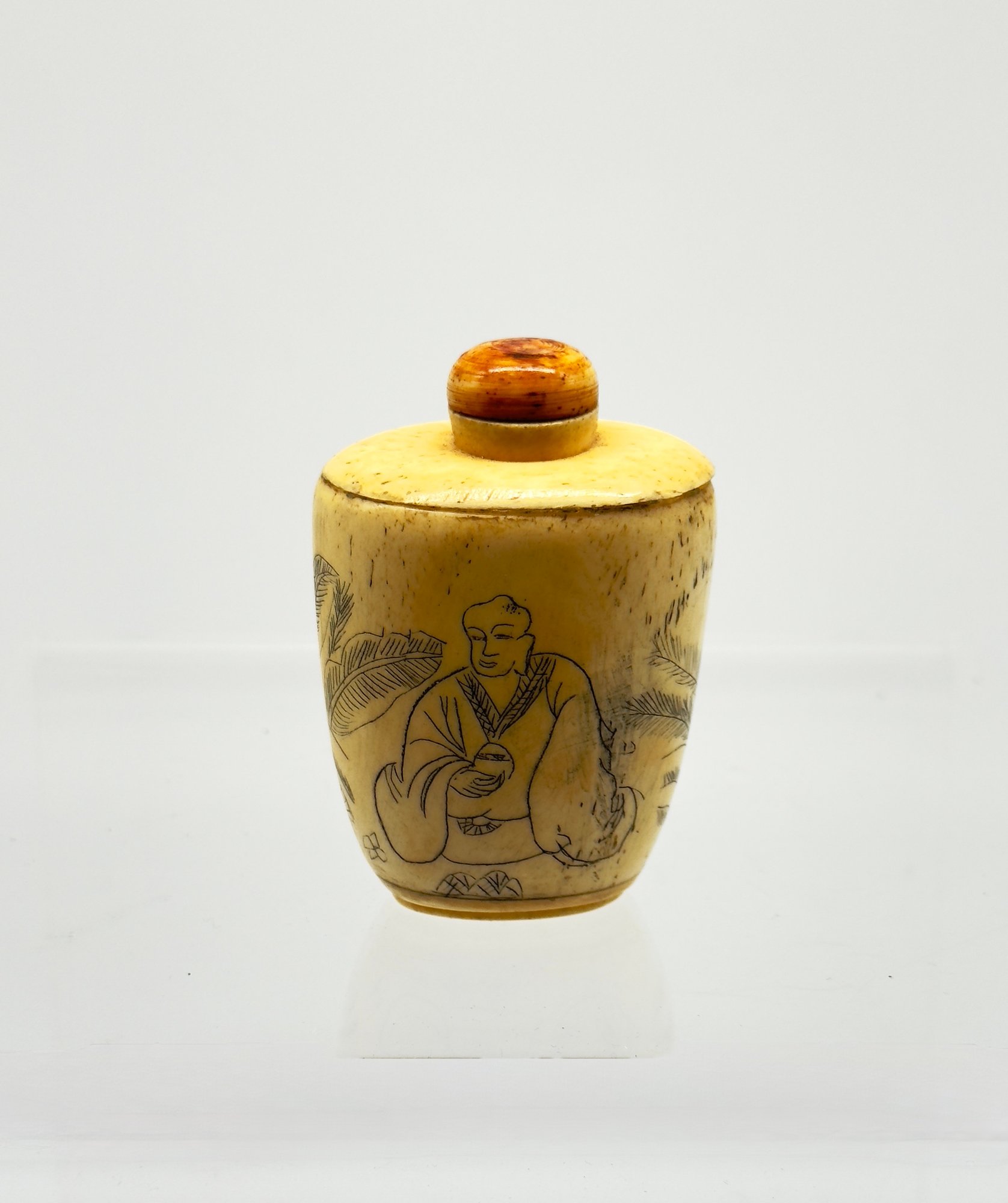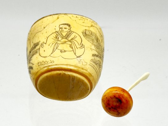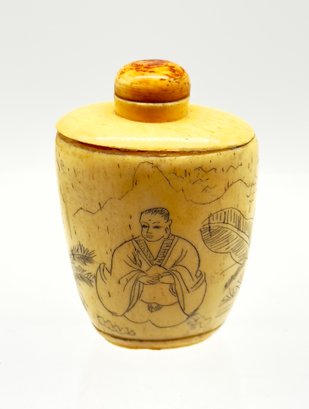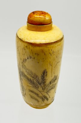 Snuff bottles were used in China to hold powdered tobacco and were often elaborately decorated. This sweet one is a lovely aged ivory color. Size 2" W x 3" H x 1.5 D