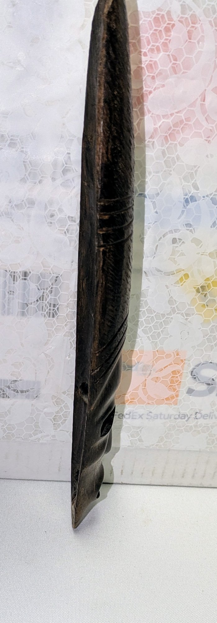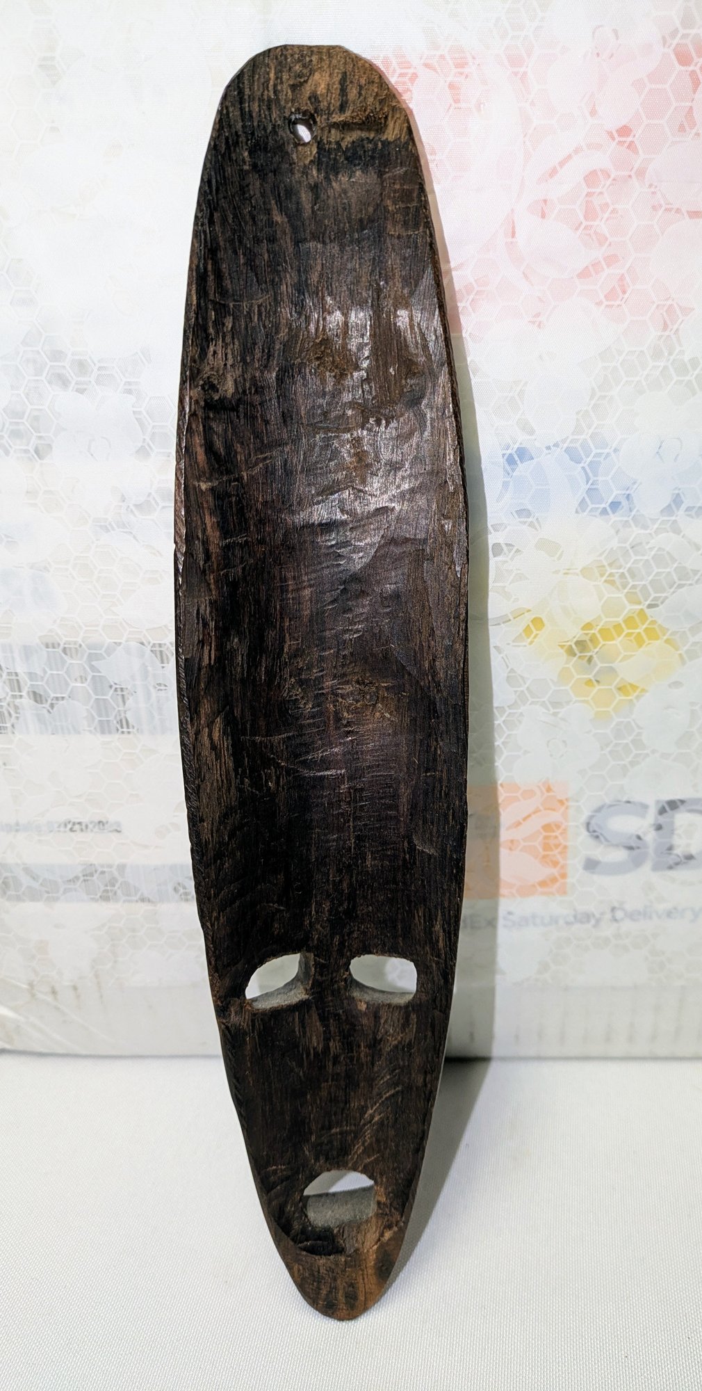 Beautiful Detail and Design. These wooden wall masks often represented ancestors or deities. There are some marks and a small chip on the top, consistent with age and movement. Please see all photos as part of the description and condition. Overall, Very Good Vintage Condition. 10.5" x 2.5" x 1"D