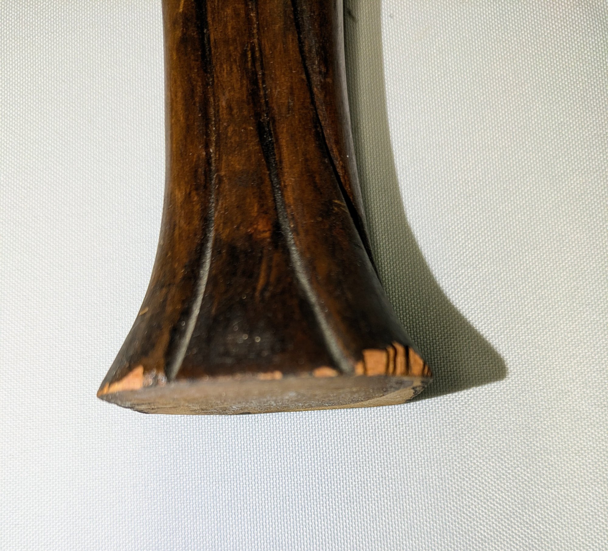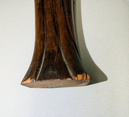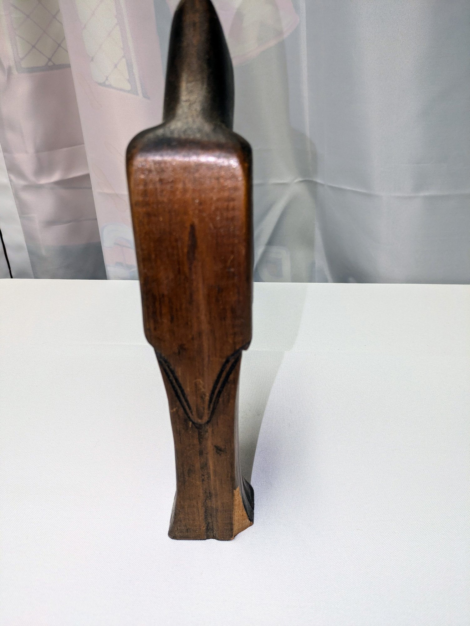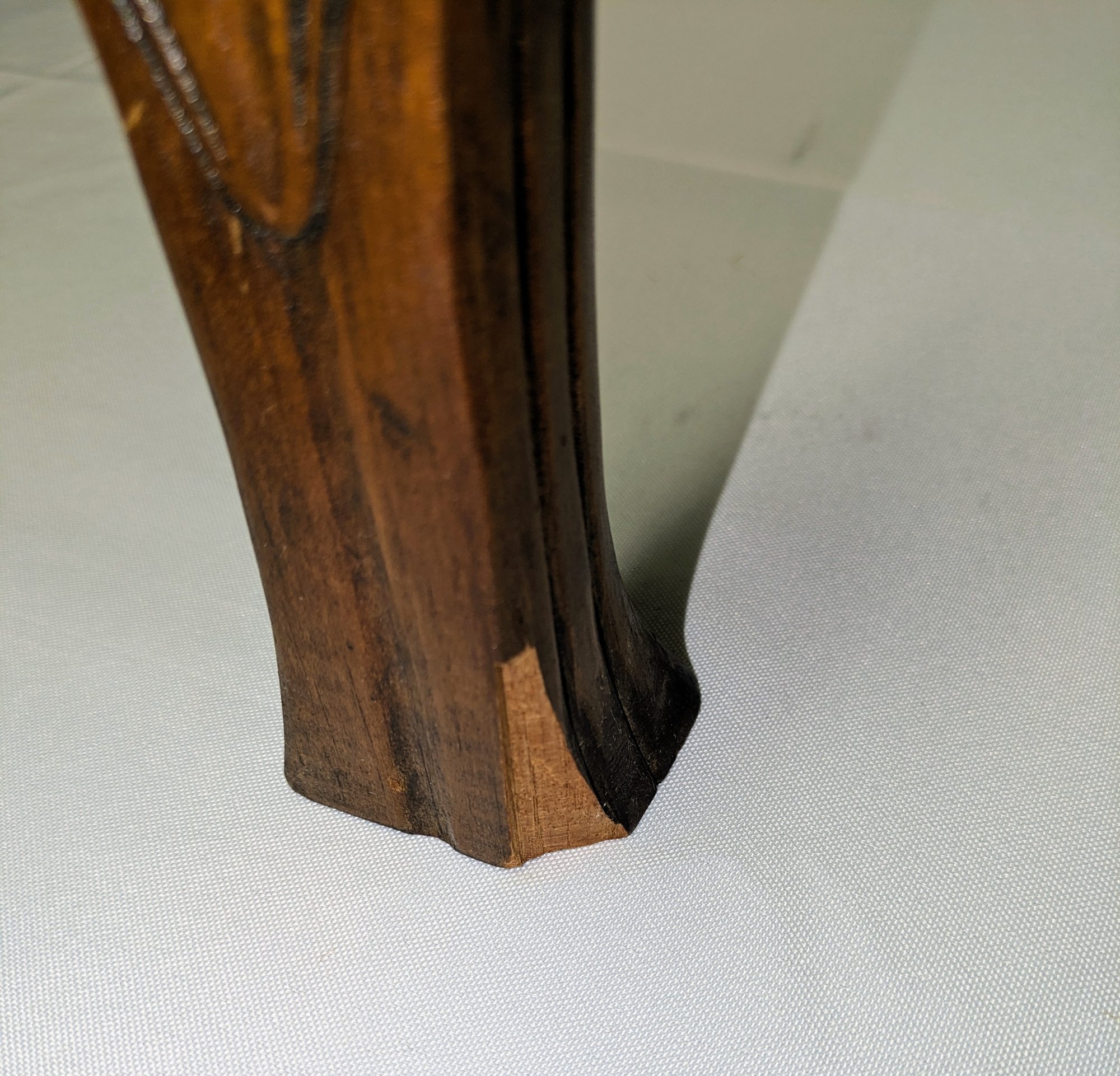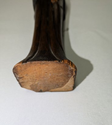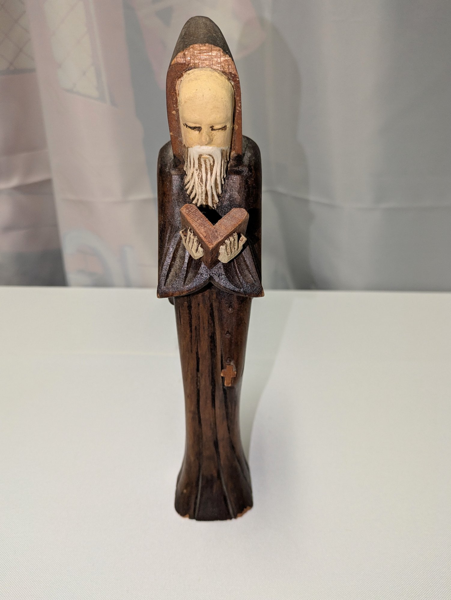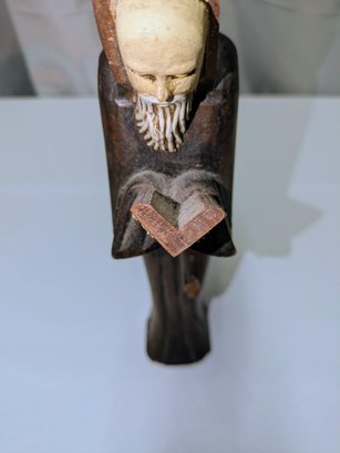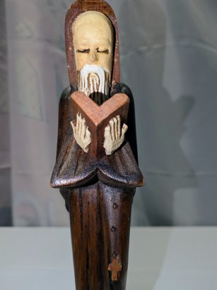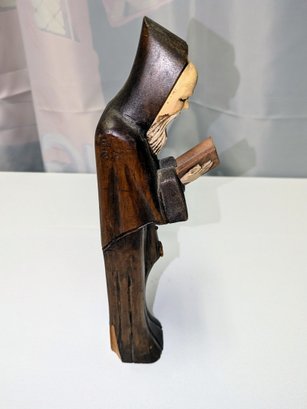 features a solemn hooded figure in a long brown robe, holding an open book in prayer. Made of wood with carved detail and rustic character, it's a timeless piece for religious decor or spiritual collections. Some chipped wood, consistent with age and movement. Overall, please see all photos as part of the description and condition. 11"H
