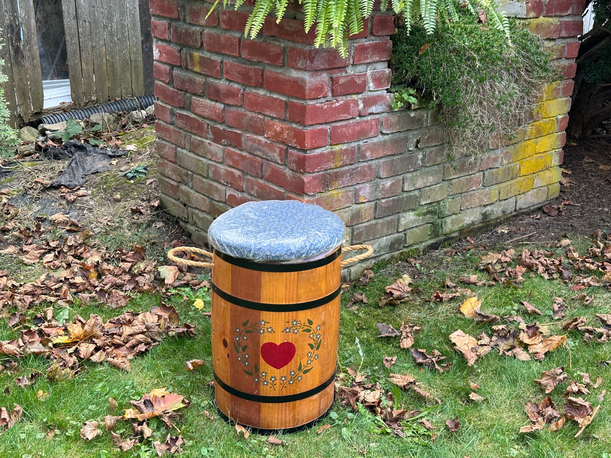 Vintage Hand Painted Barrel Stool with pretty heart and heart wreath design on the front