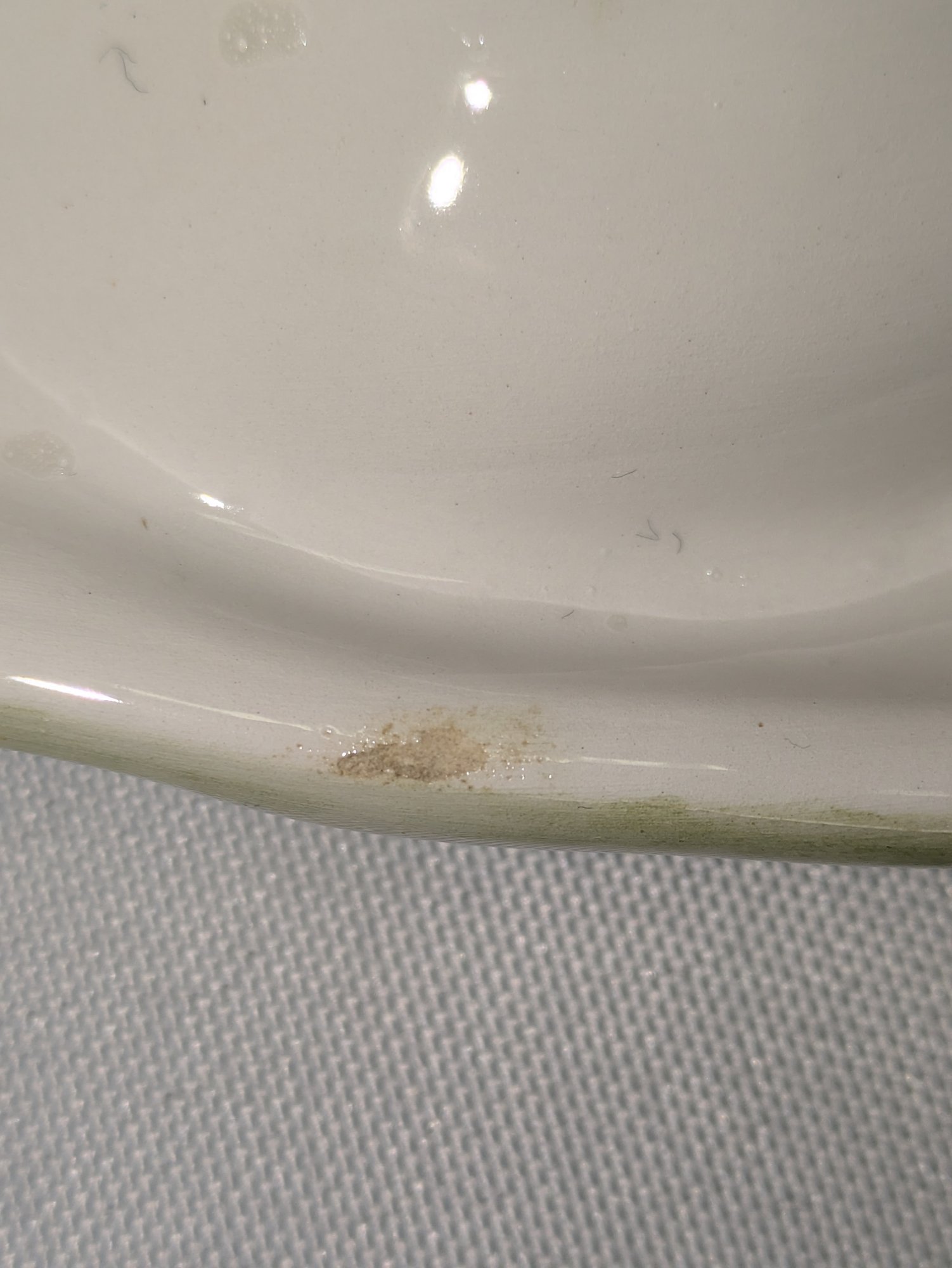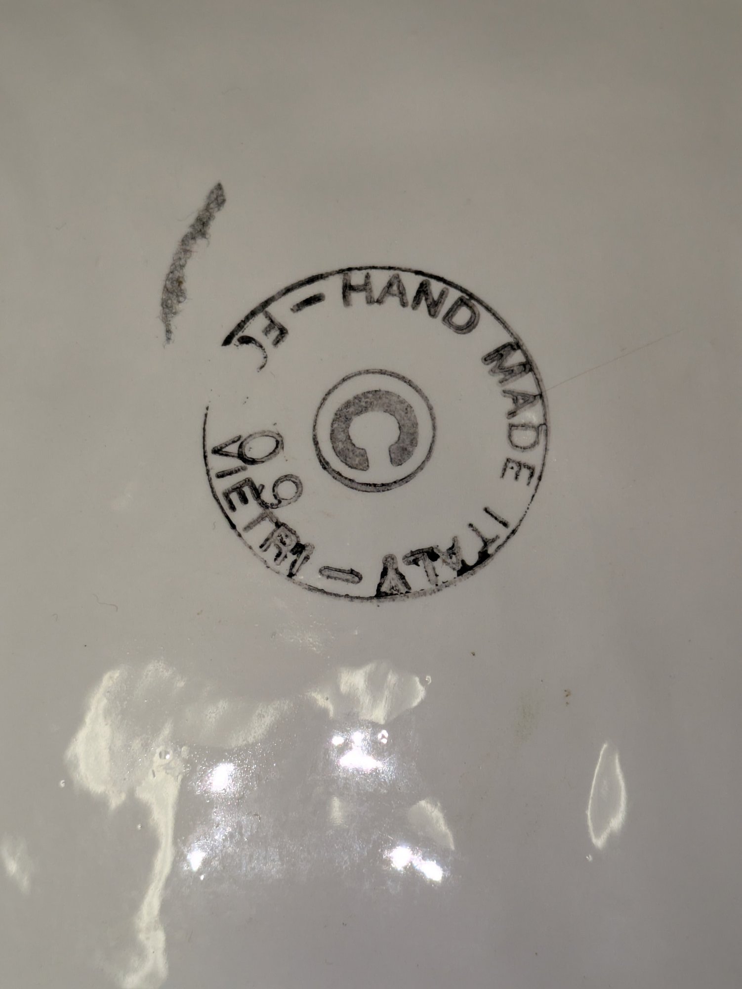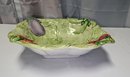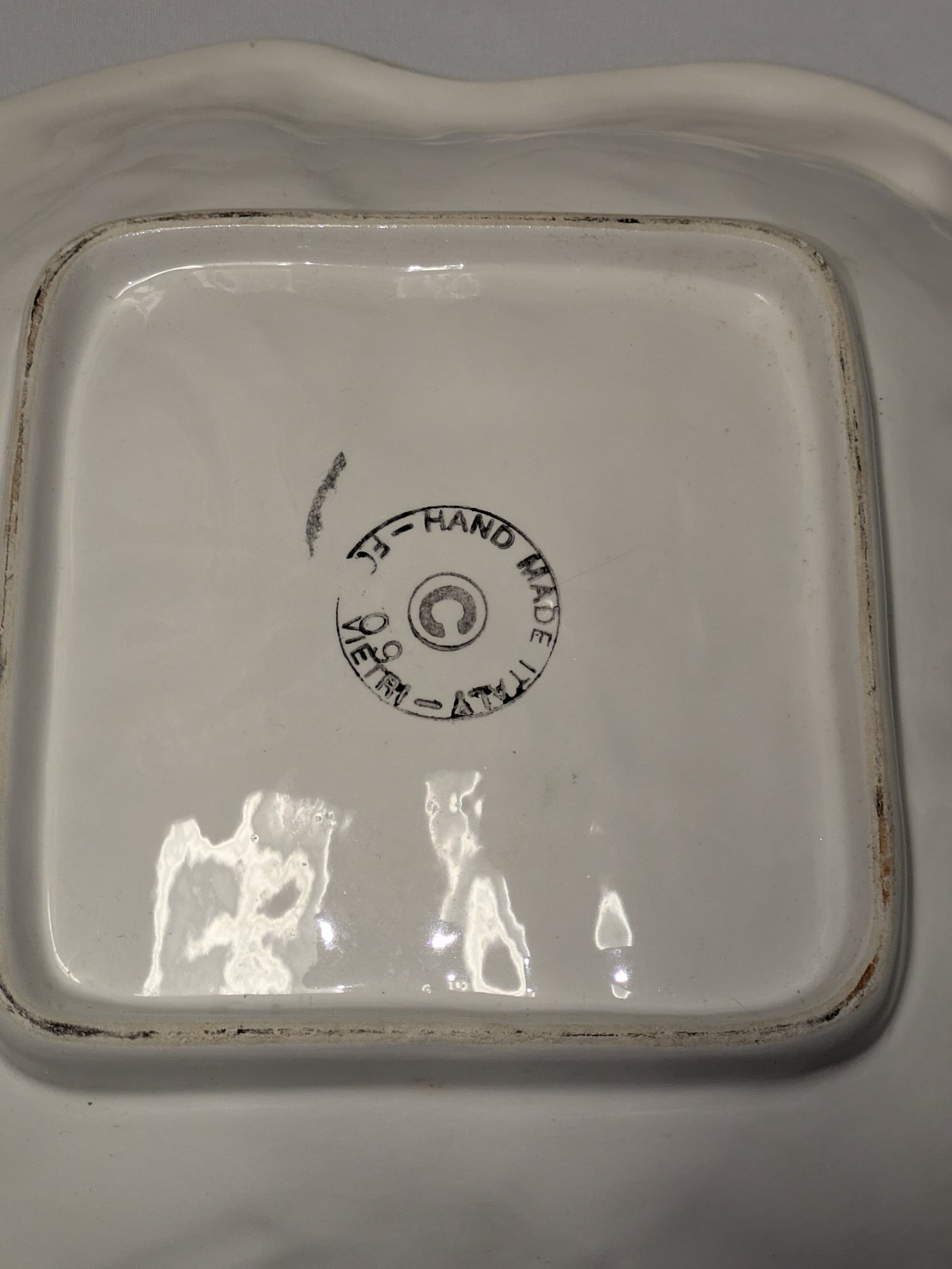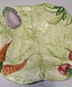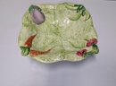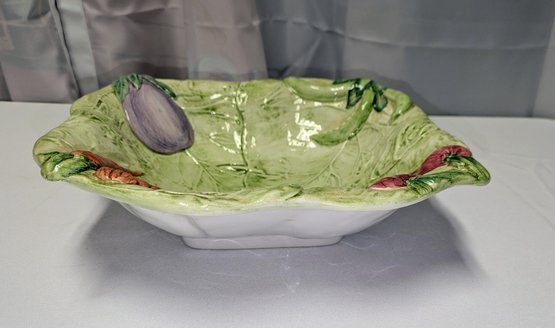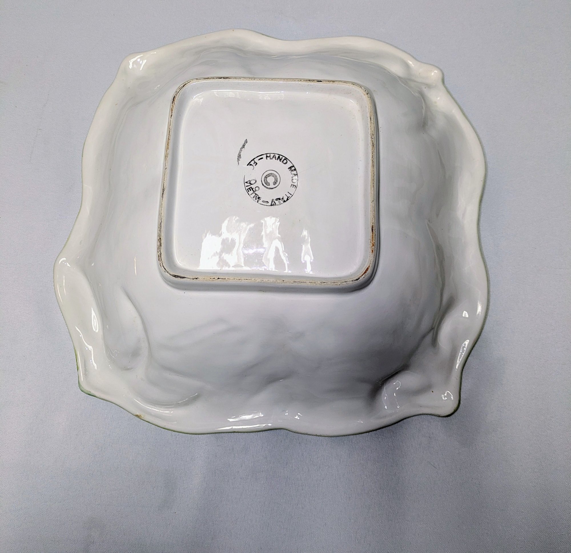 Hand-painted ceramic design with sculpted vegetables. Would look great as a decorative centerpiece or for serving any food item. There is a small chip on the bottom rim and light marks, consistent with age and use. Overall, Very Good Vintage Condition. Please see all photos as part of the description and condition. 4"H x 13" Square.