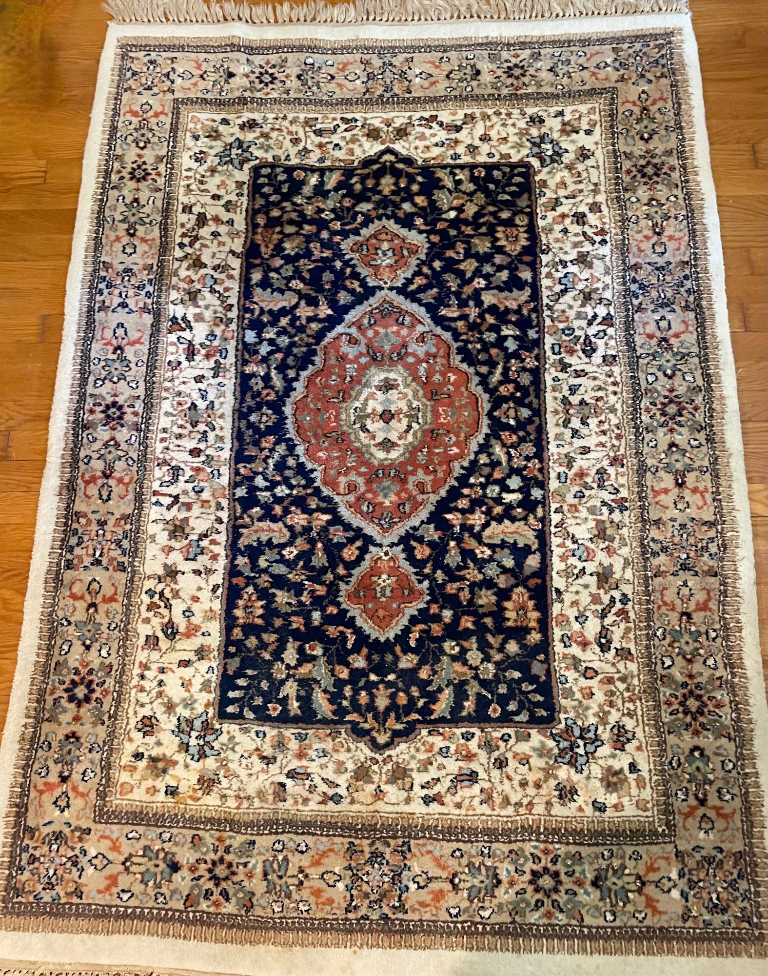 A handsome hand woven rug with a striking design. It's 73 3/4" by 47" and in good condition.