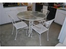Vintage iron table with four chairs. Two armchairs and two side chairs. Table has a height of 28 1/2" and a diameter of 42 1/2". The chairs have a height of 32 1/2", width 21" and depth 21".