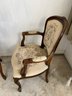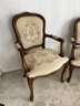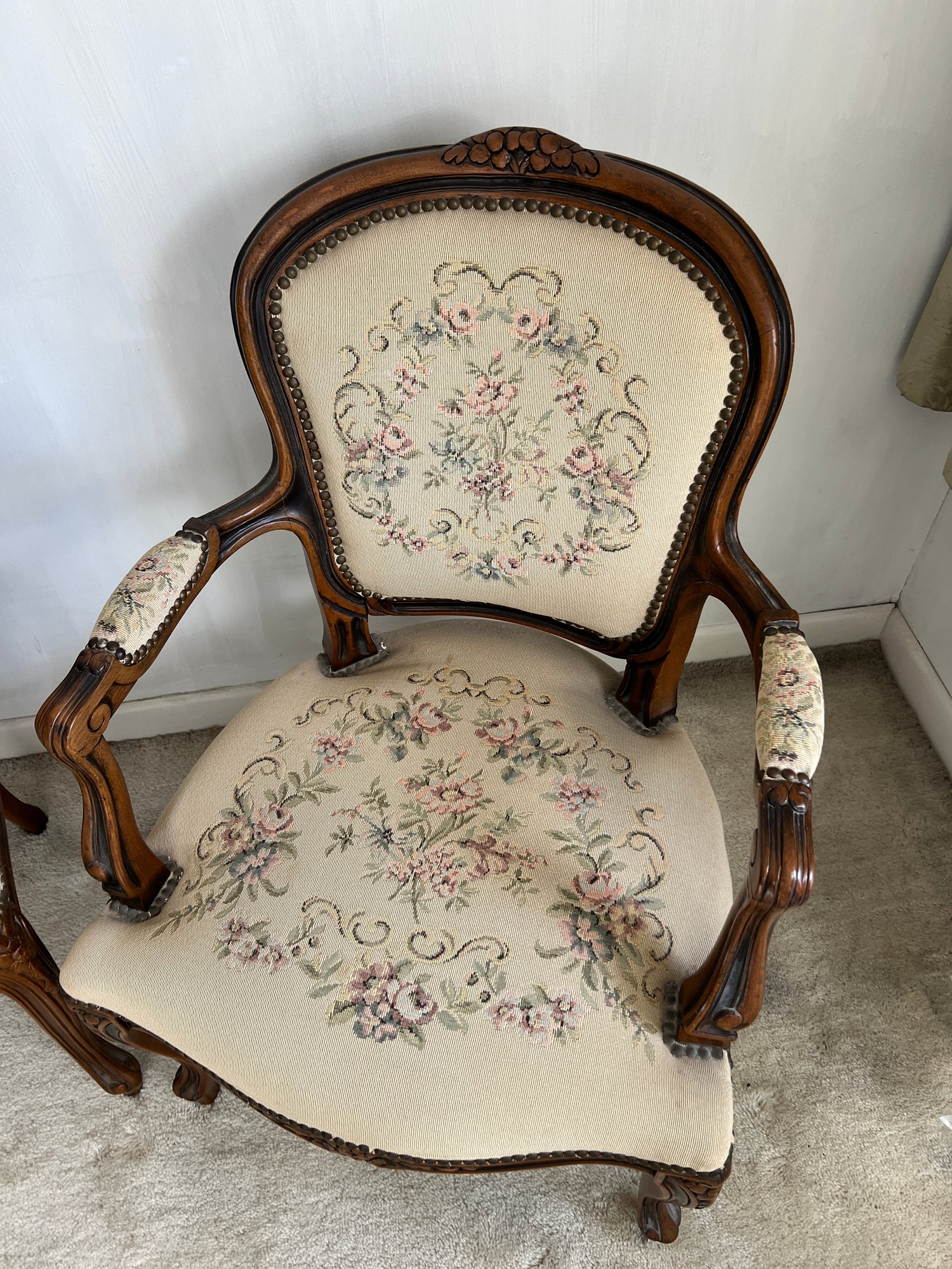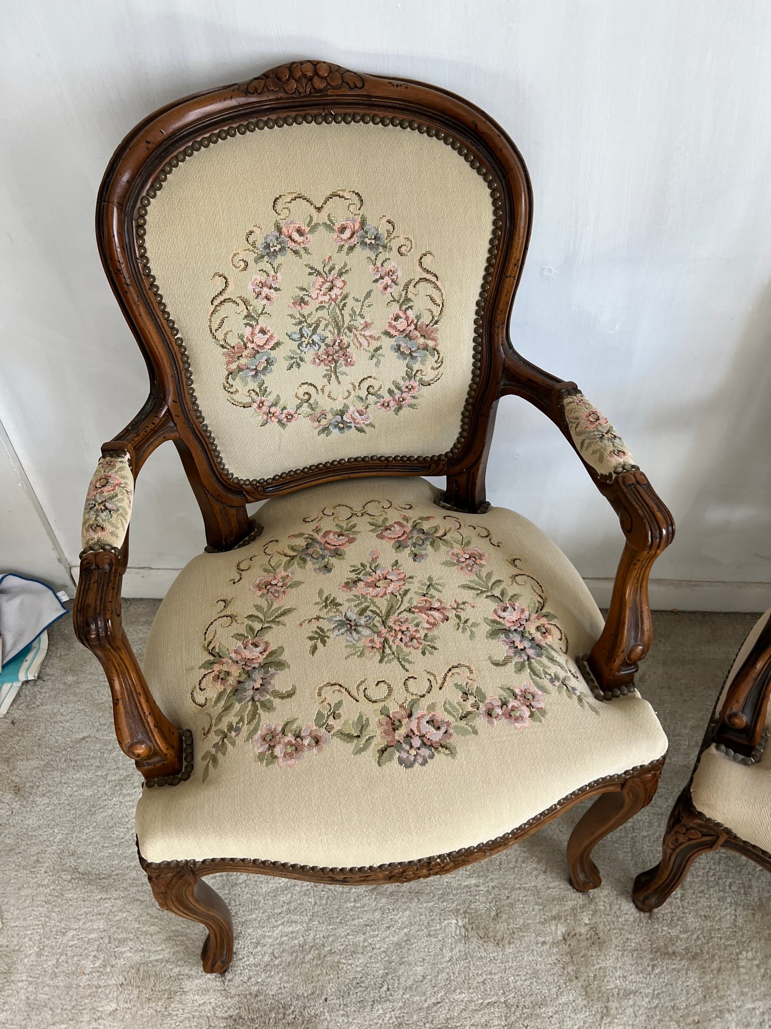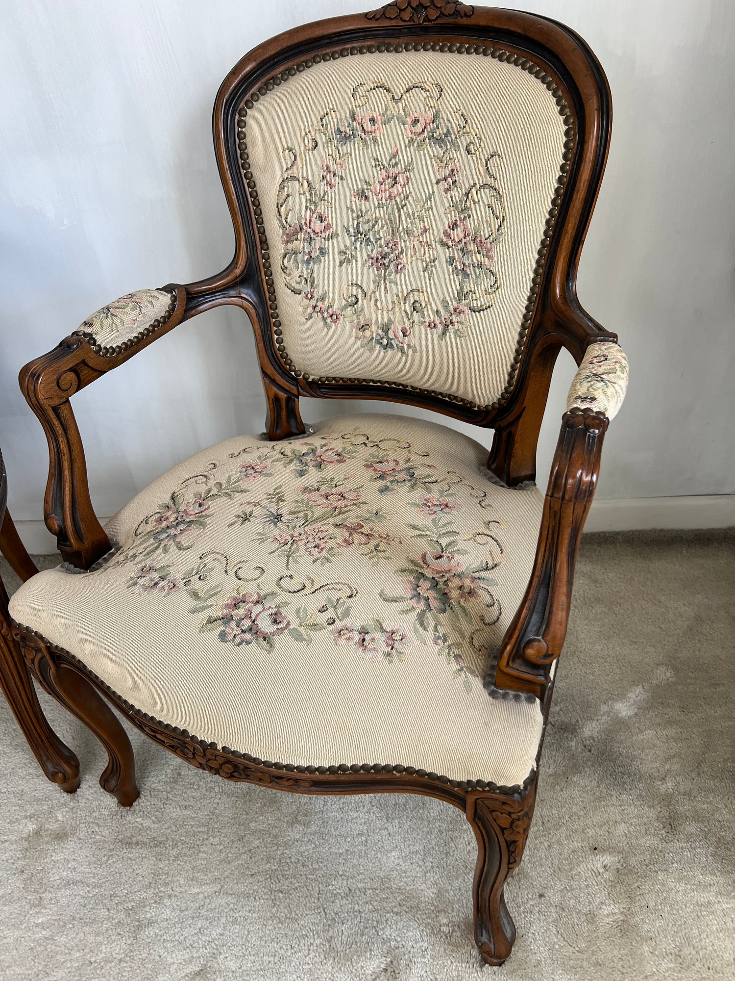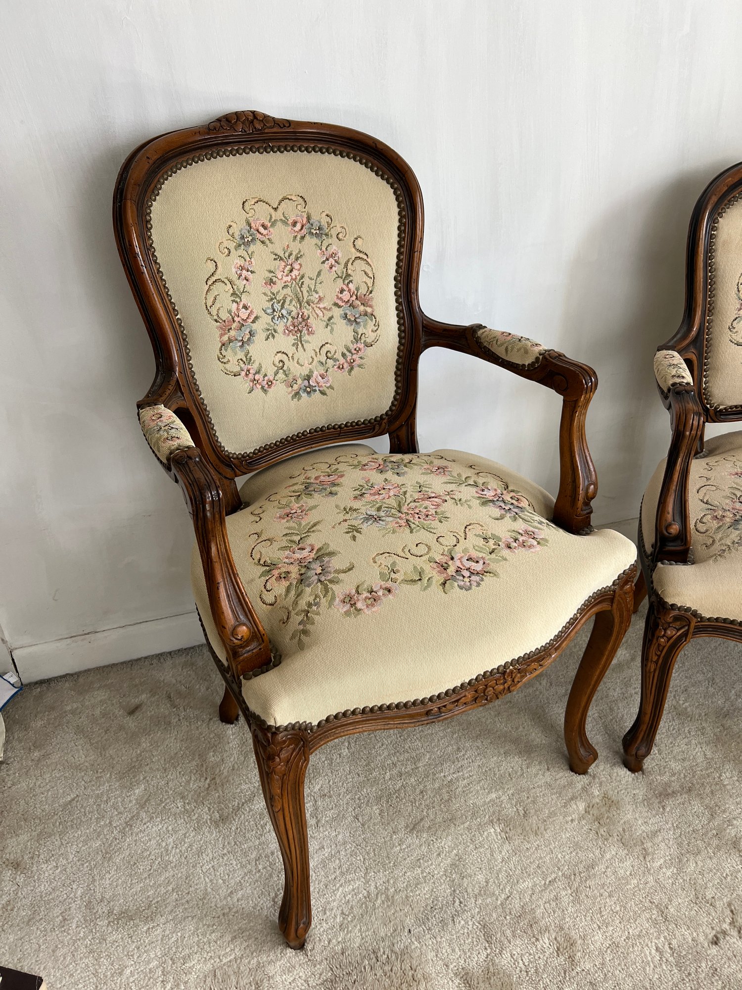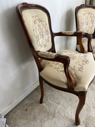 Vintage early 1990s his-and-hers Louis XV style chairs with a floral needlepoint design on a cream background. Made in Italy for Chateau d'Ax Spa. Dimensions listed are for larger chair.