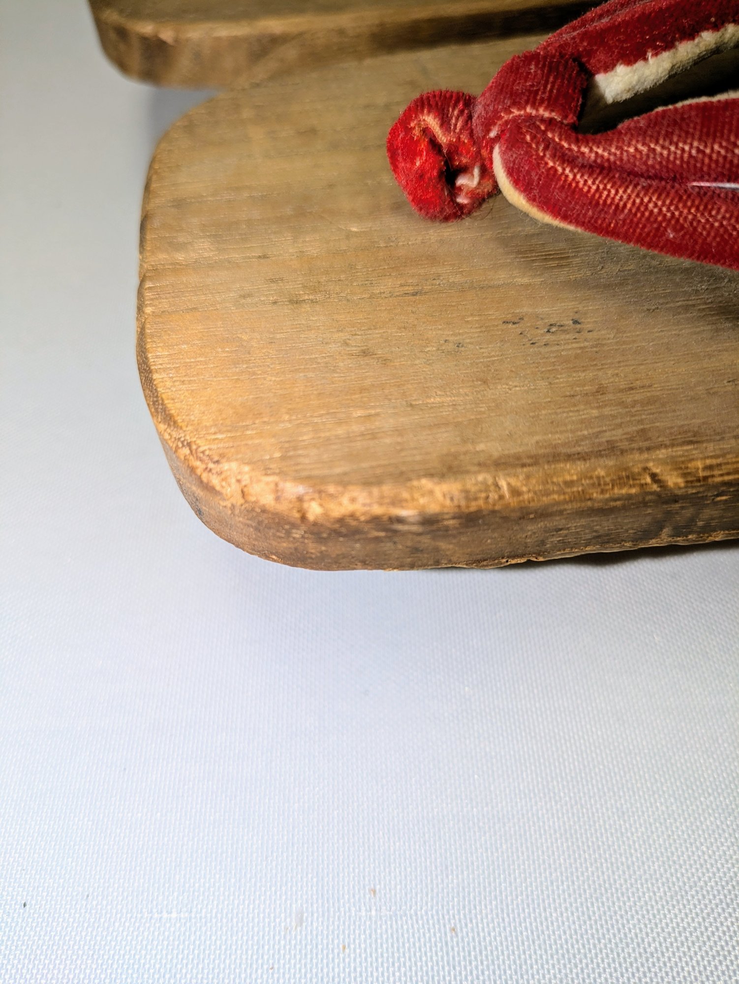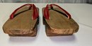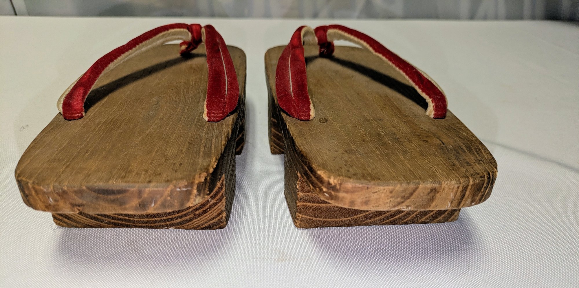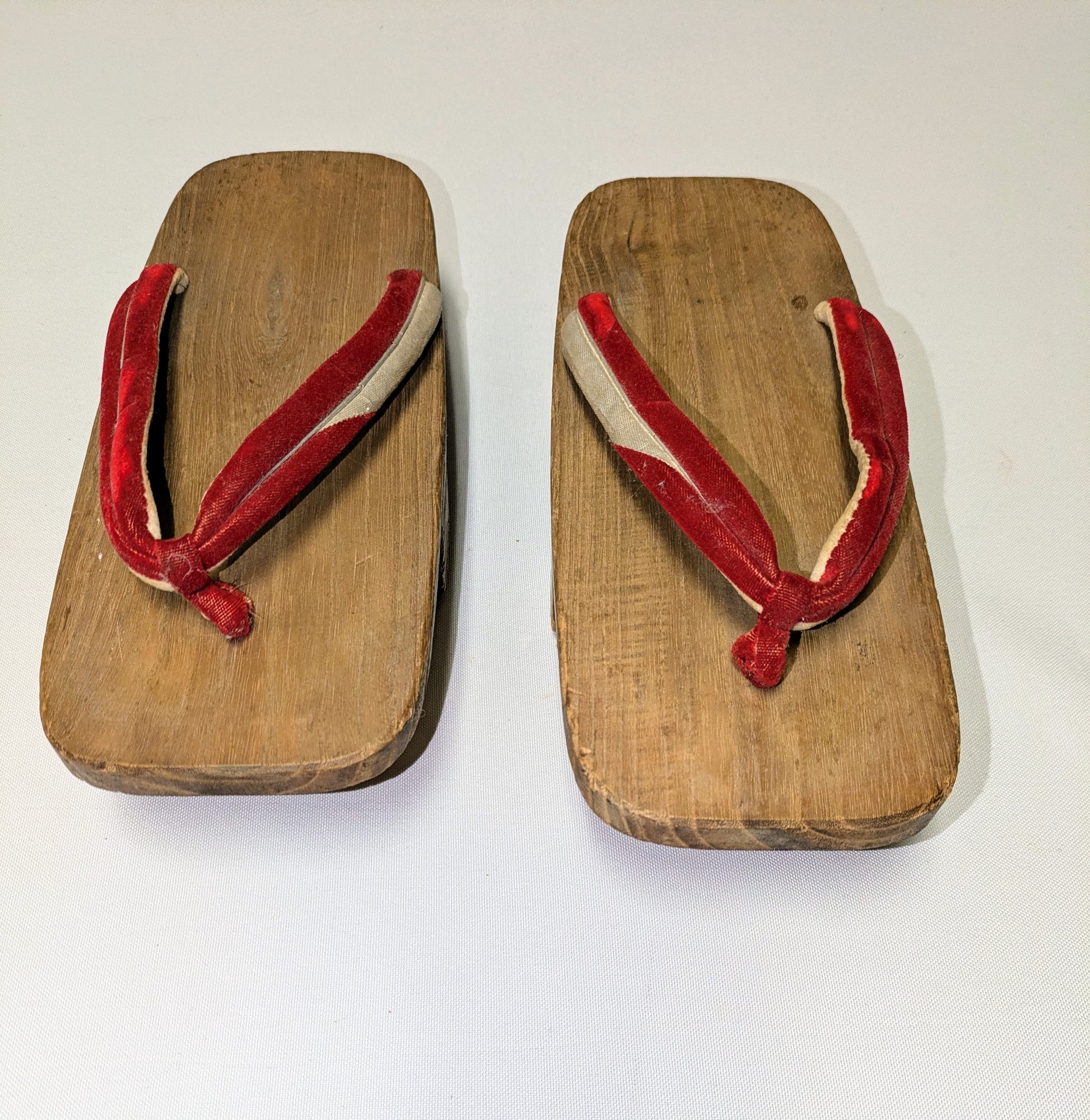 Traditional Japanese footwear is usually worn with a kimono or yukata. Solid Kiri Wood Base with an Elevated Platform with a Velvet & Fabric Thong Top. Normal Wear Consistent with age and Use. Overall, Very Good Vintage Condition. Please see all photos as part of the description and condition. 1.75"H x 4" x 10"