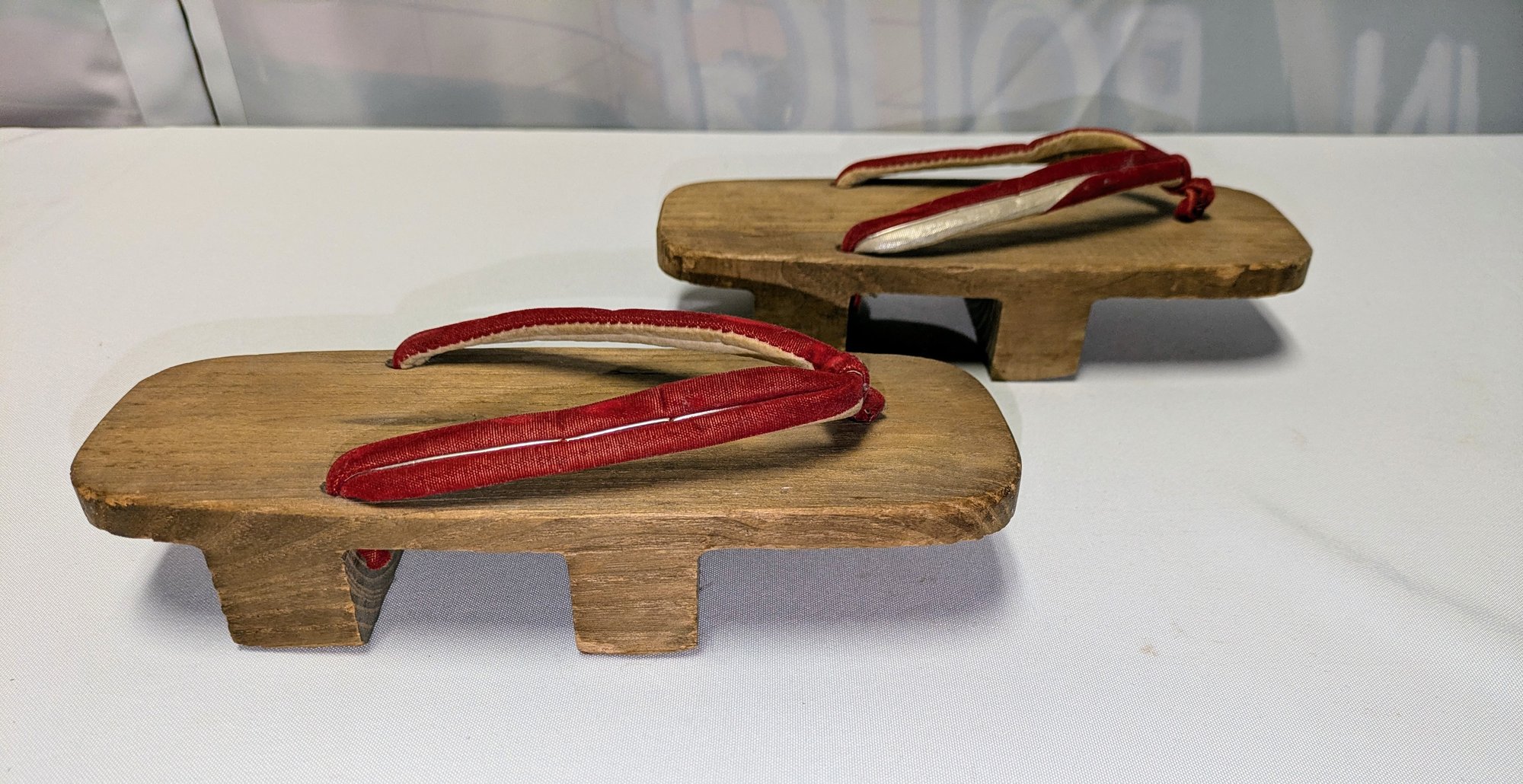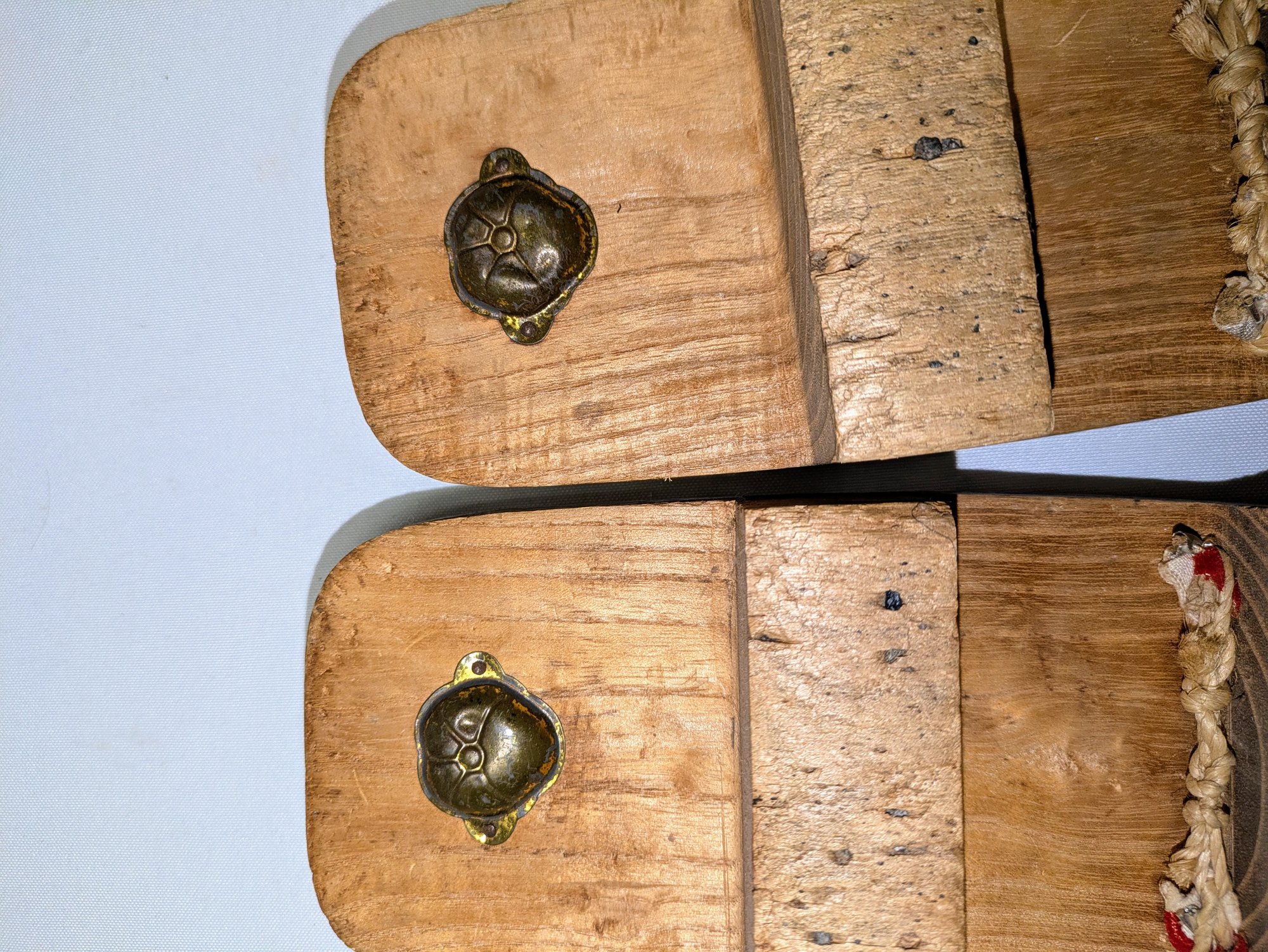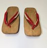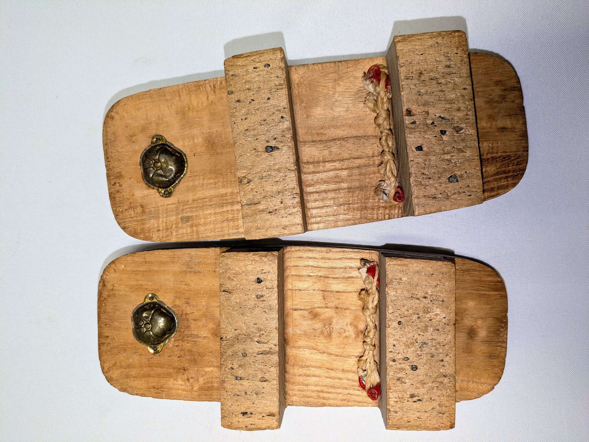 Traditional Japanese footwear is usually worn with a kimono or yukata. Solid Kiri Wood Base with an Elevated Platform with a Velvet & Fabric Thong Top. Normal Wear Consistent with age and Use. Overall, Very Good Vintage Condition. Please see all photos as part of the description and condition. 1.75"H x 4" x 10"
