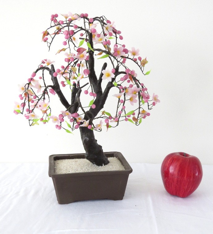 A vintage Asian-style bonsai tree, often referred to as a mineral stone or glass jade tree with carved glass cherry blossom flowers and wired branches, potted in a ceramic container with stone bedding.