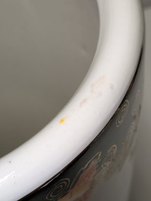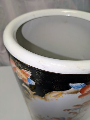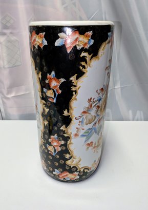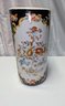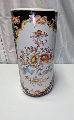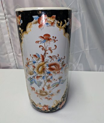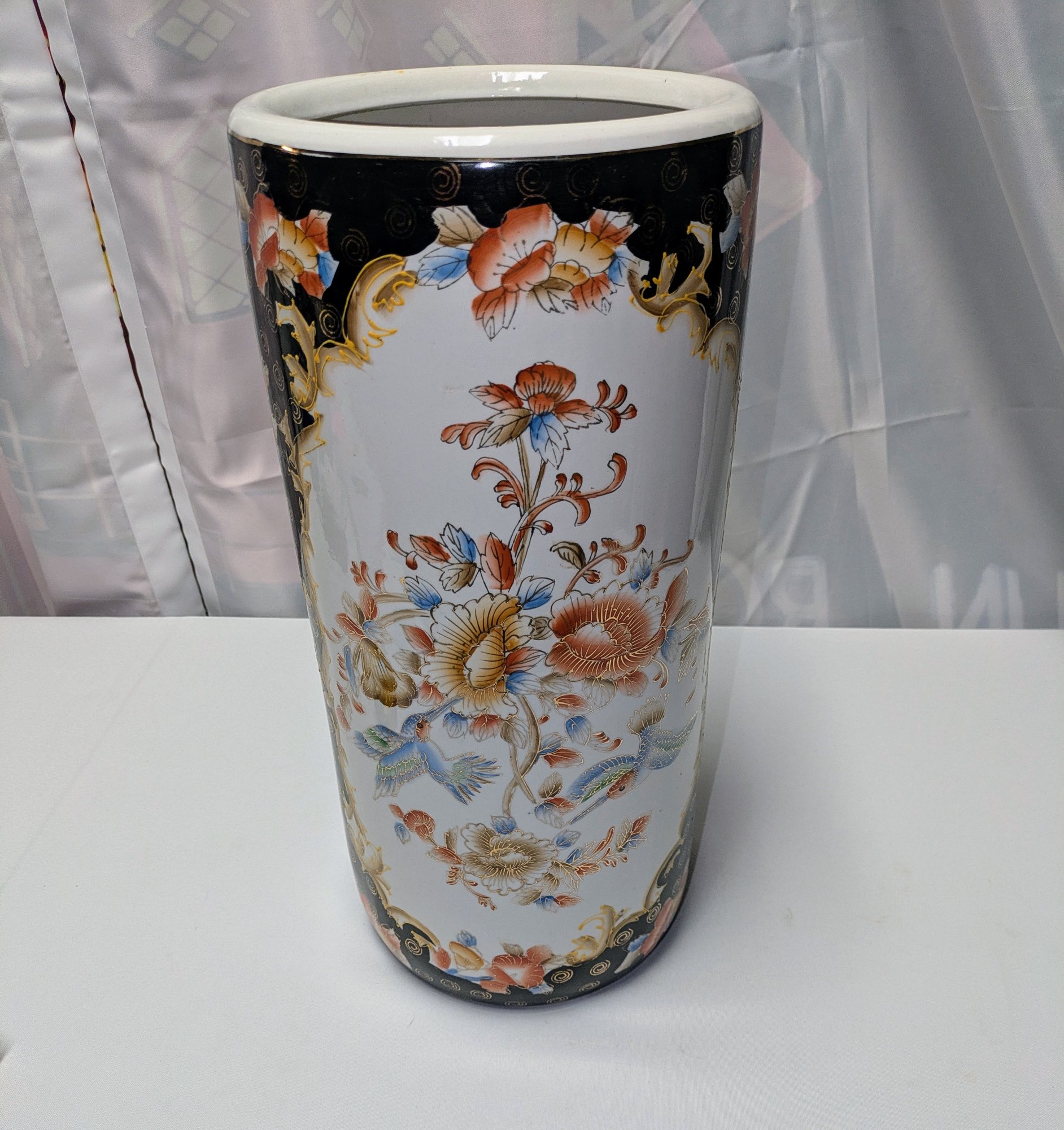 Vintage Japanese Imari-Styled Ceramic Umbrella Stand or Floor Vase. Intricate floral design with metallic gold accents. Beautiful, detailed, and design patterns of flowers and birds. Some marks are consistent with age and use. Overall, Very Good Vintage Condition. Please see all photos as part of the description and condition. No Chips or Cracks. 18.25"H x 8.5" Diam.