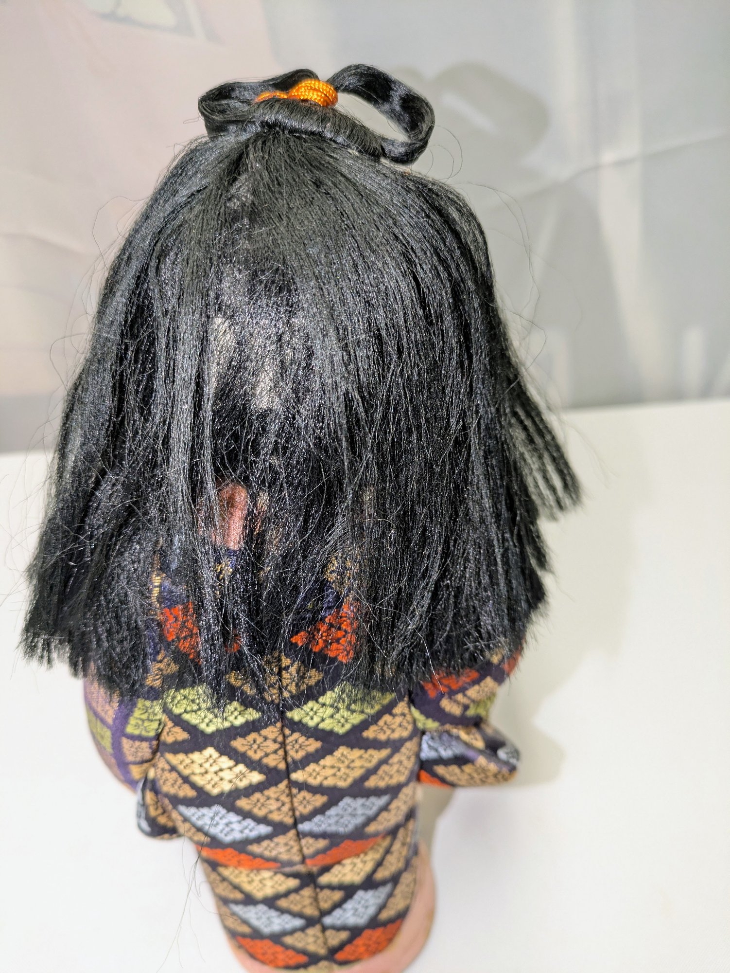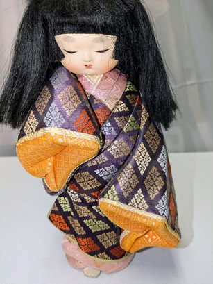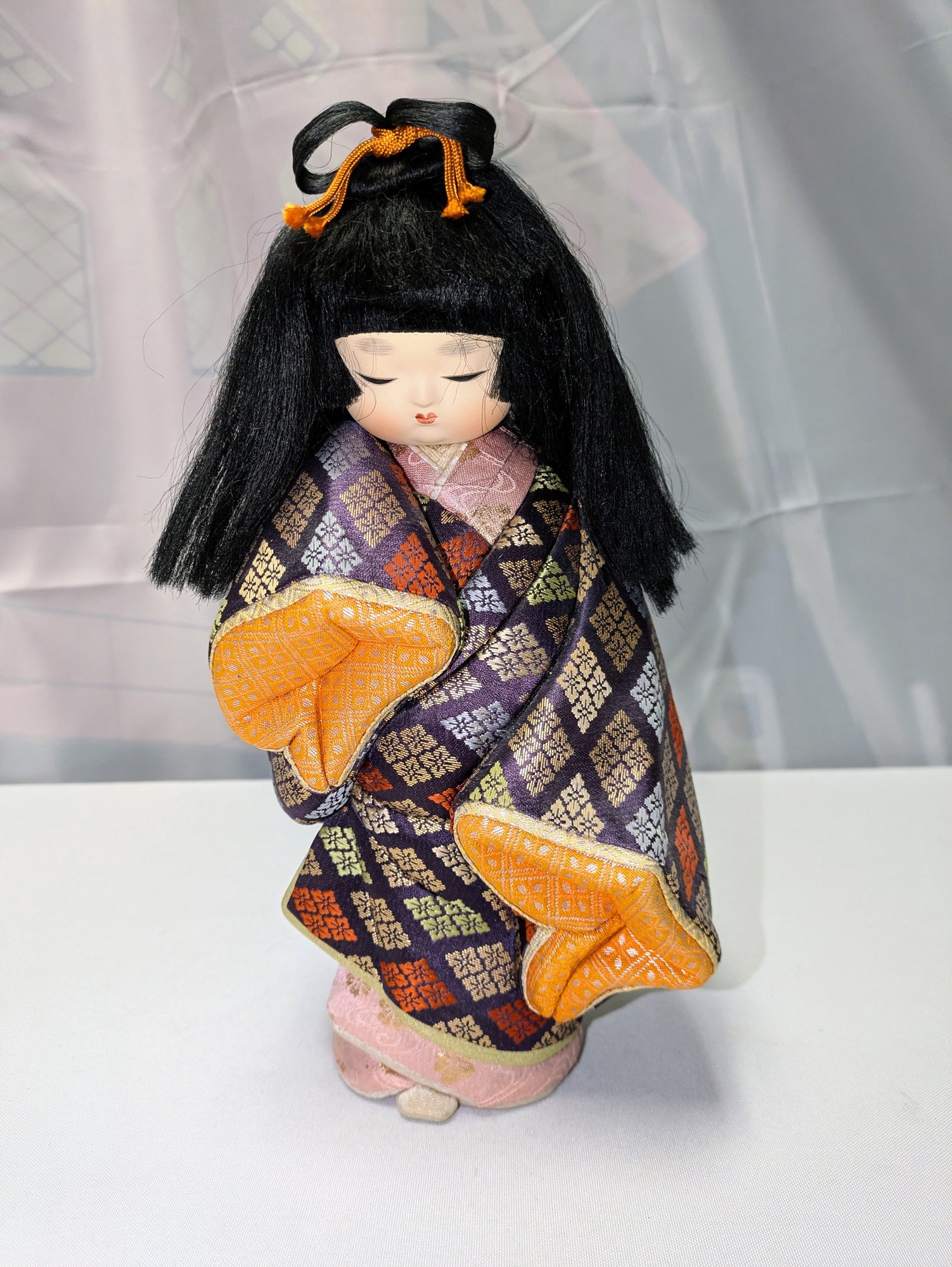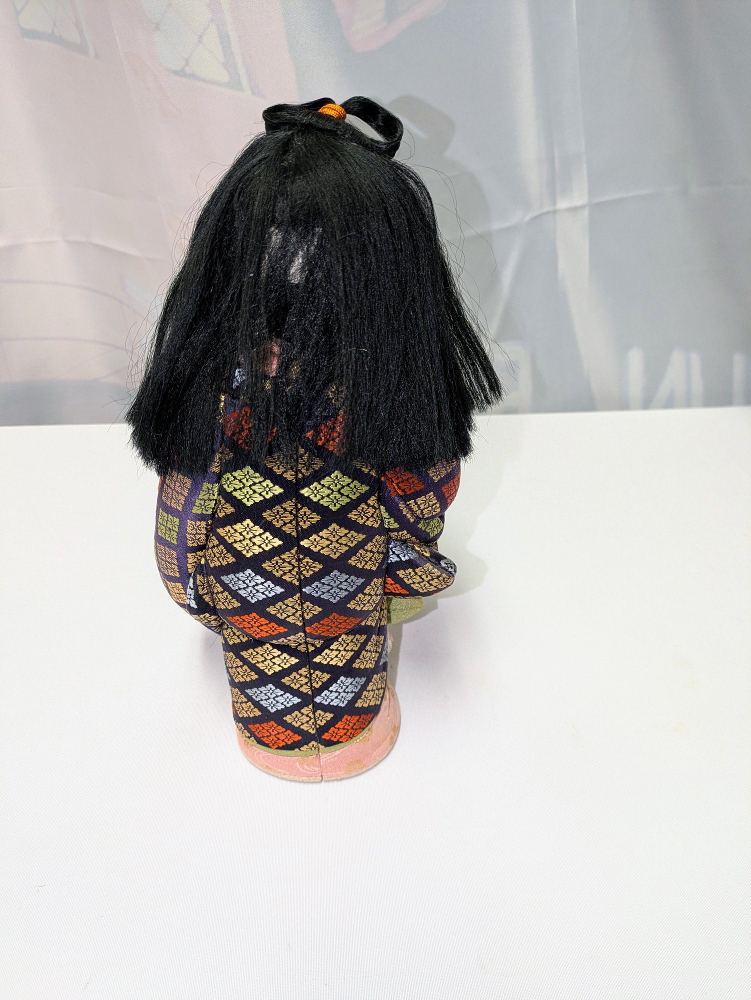 Vintage Japanese Kimekomi Doll. The doll has a wooden body covered with fabric to form the kimono pattern. Slight thinning of hair in the back; dusty needs a quick wipe-down. Overall, Very Good Vintage Condition. Please see all photos as part of the description and condition. 11"H