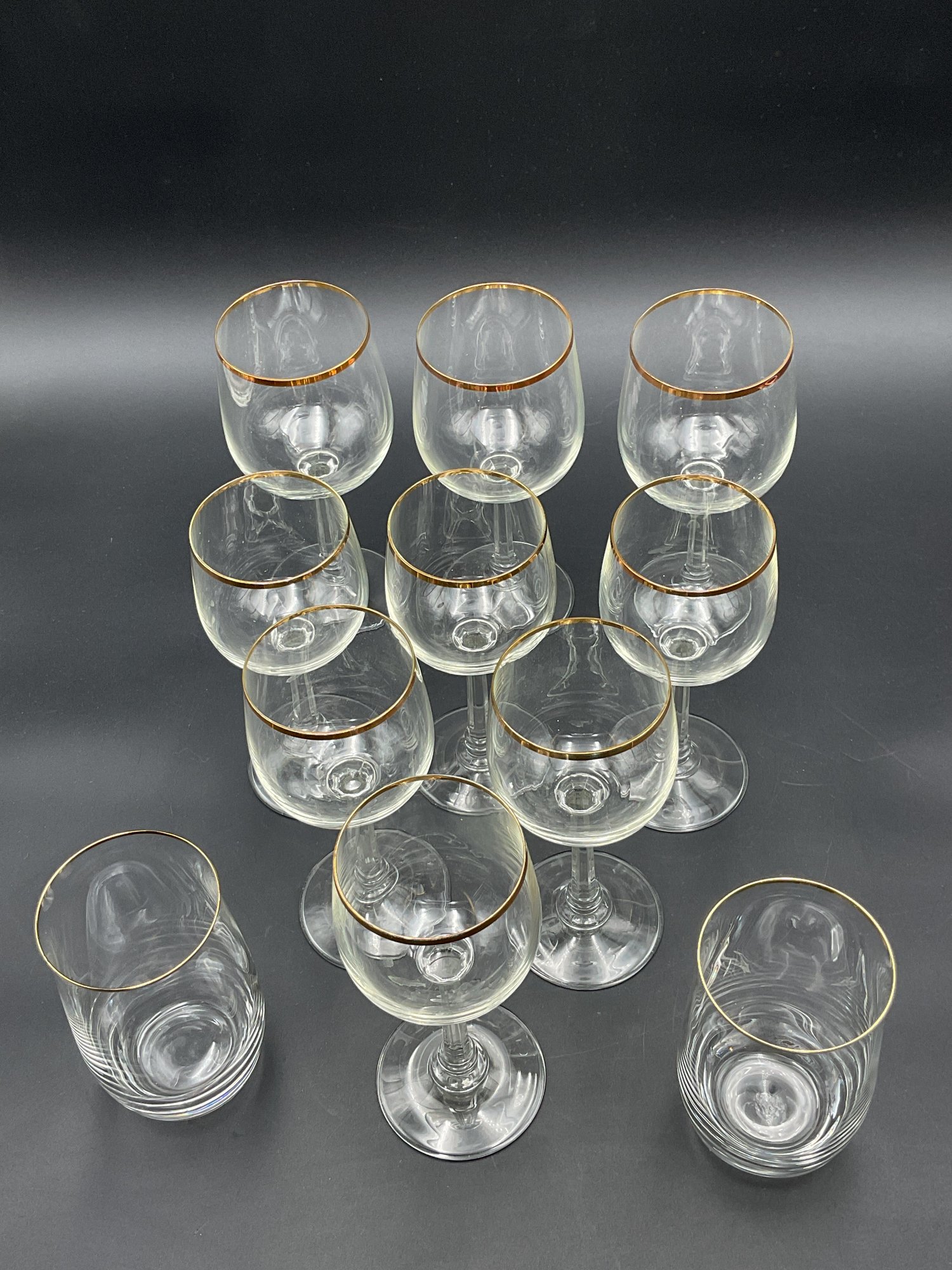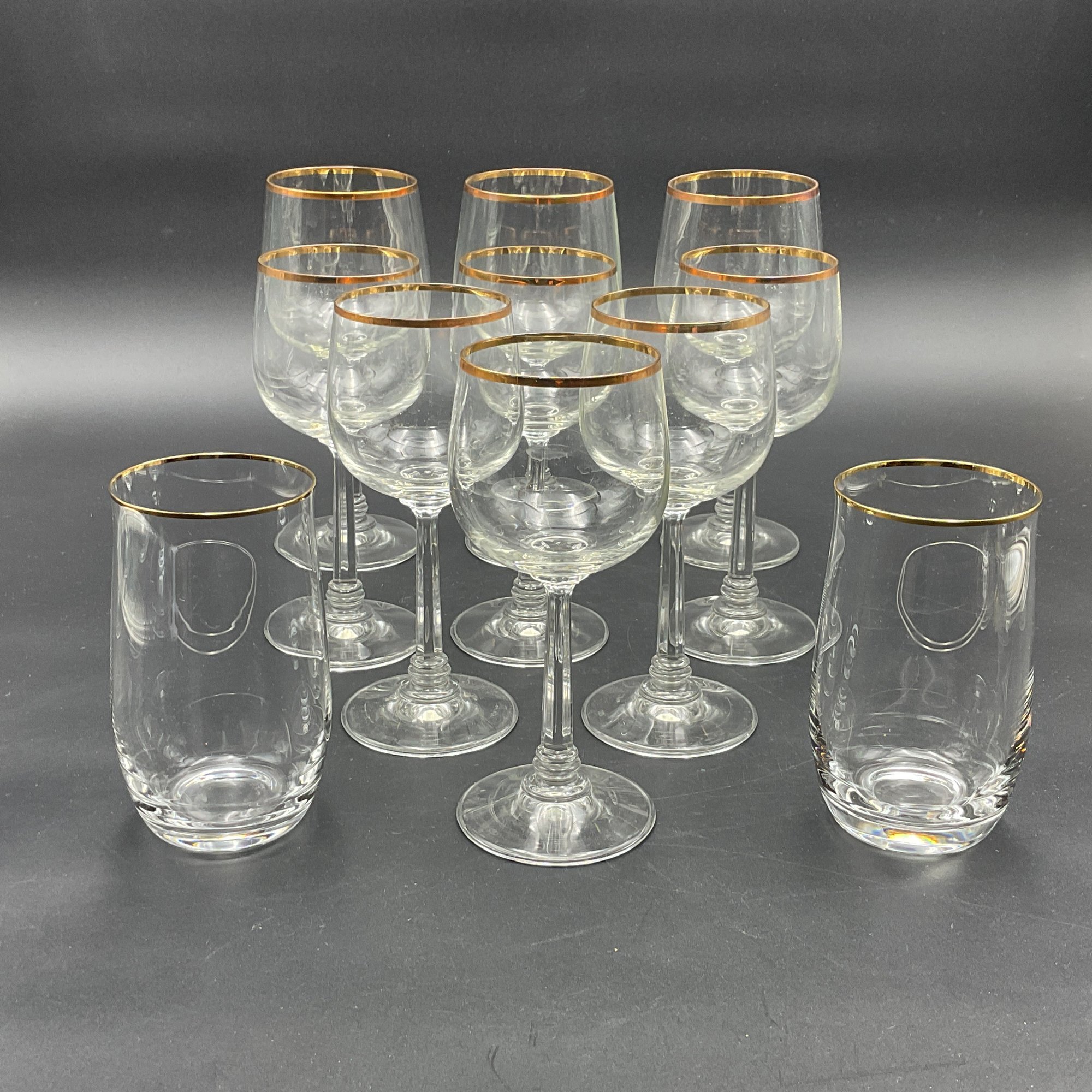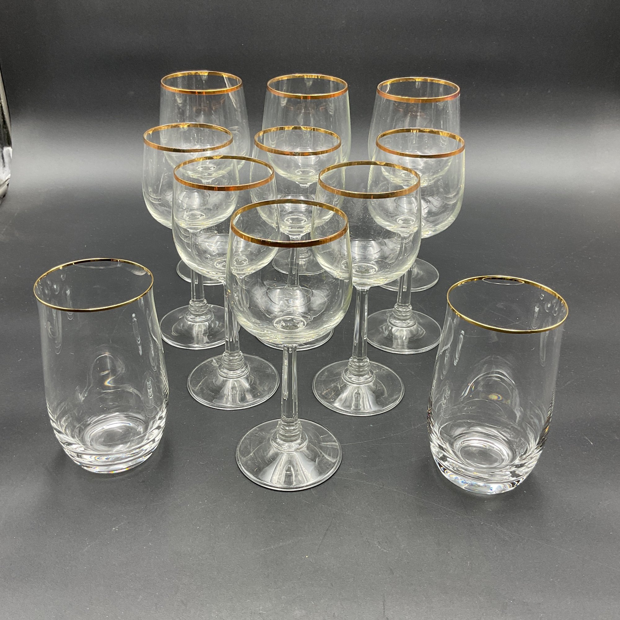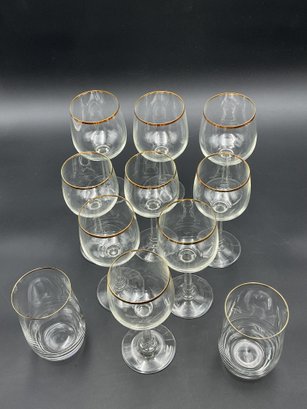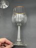 This is a collection of 1970's vintage crystal glasses in the Jasmine pattern by Crystal Clear Industries. Eleven (11) pieces - All in good to very good condition with minor wear to the gold rims and some light scuffs.