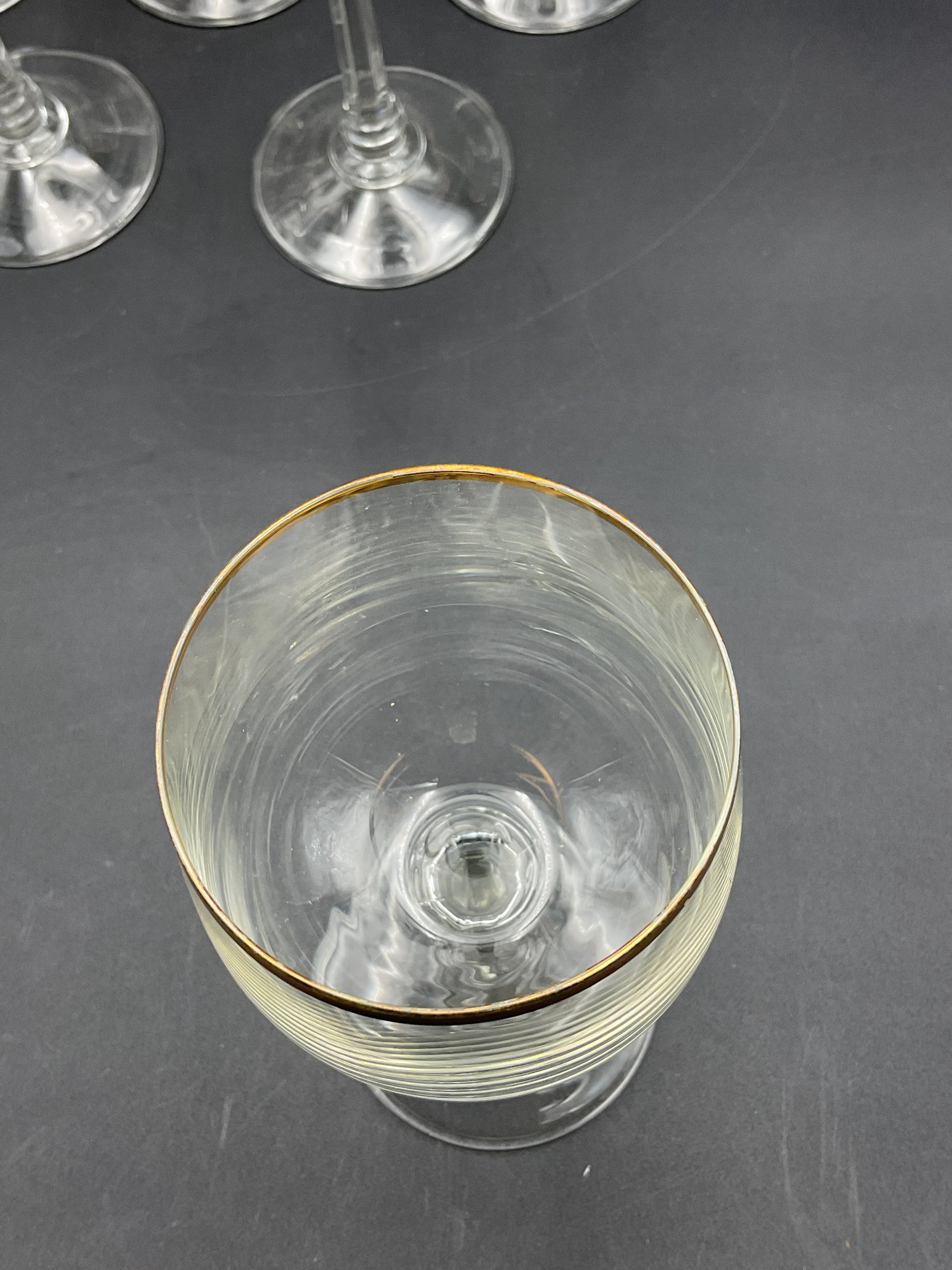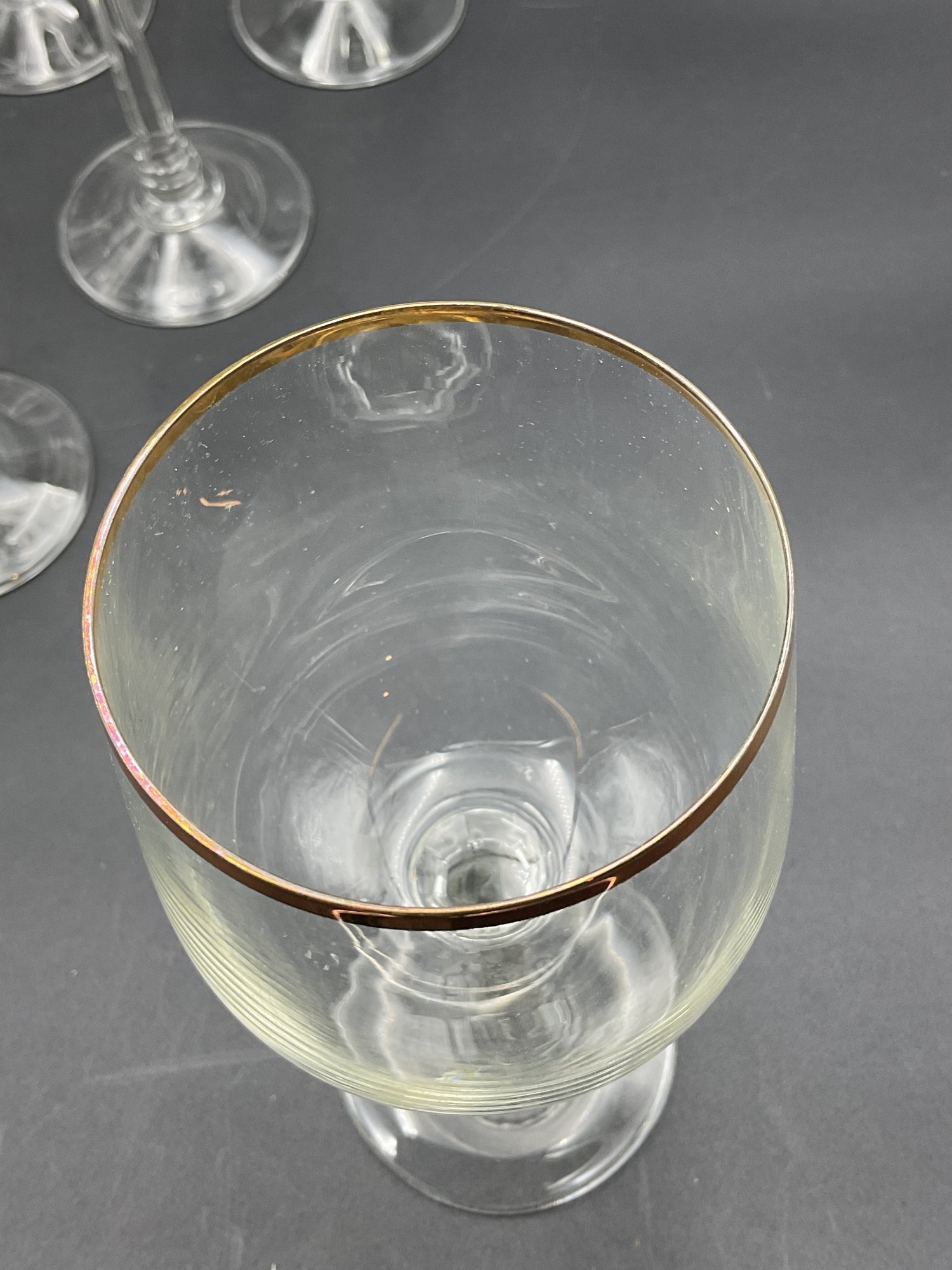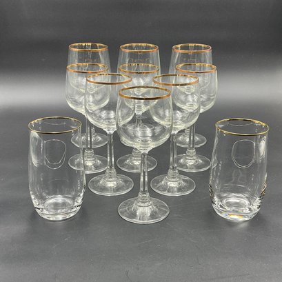 This is a collection of 1970's vintage crystal glasses in the Jasmine pattern by Crystal Clear Industries. Eleven (11) pieces - All in good to very good condition with minor wear to the gold rims and some light scuffs.