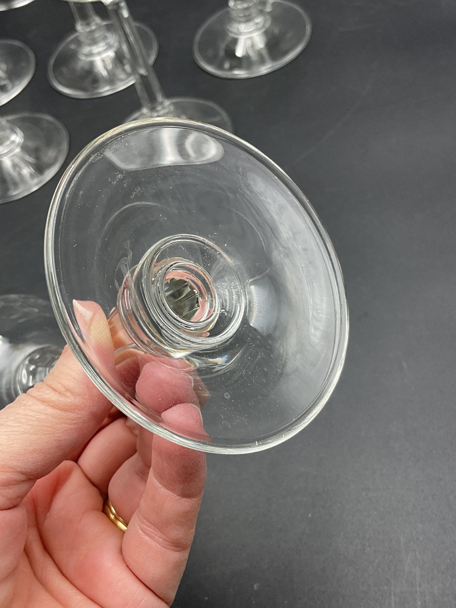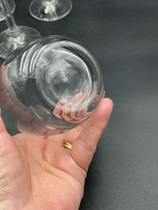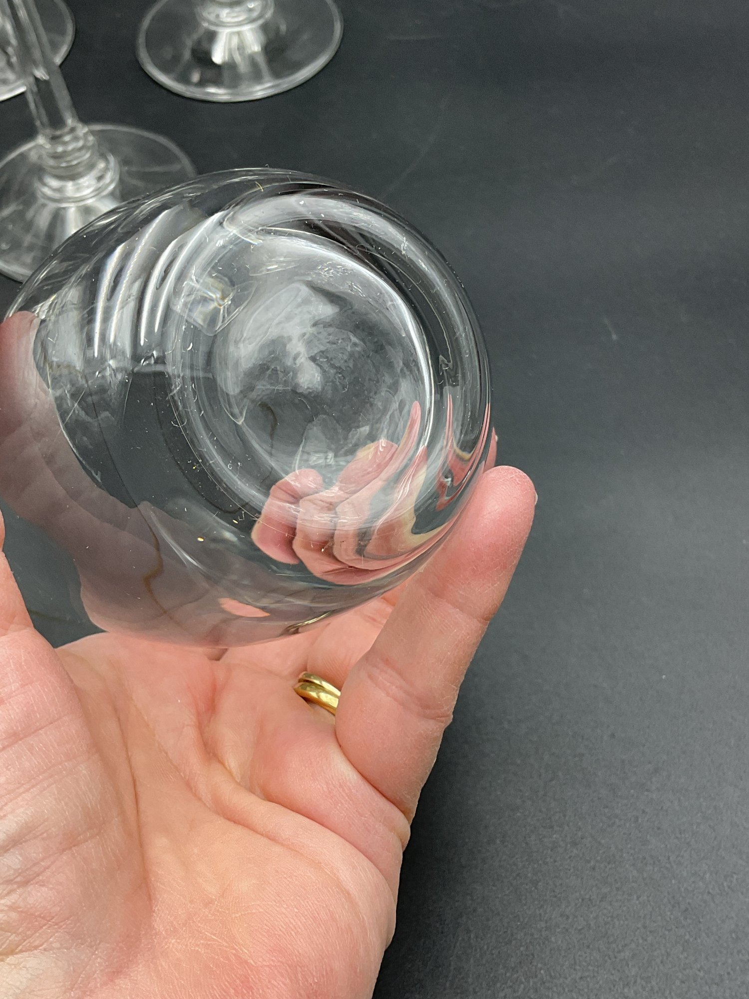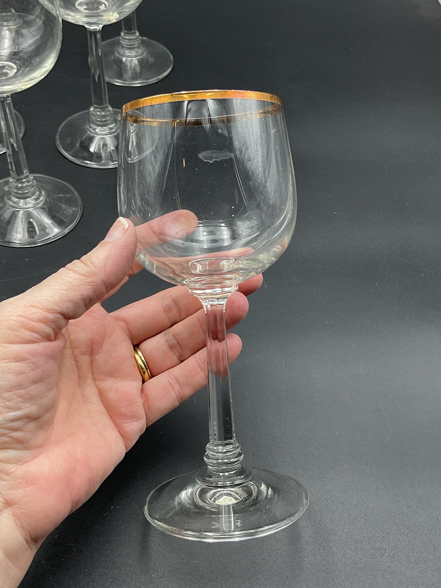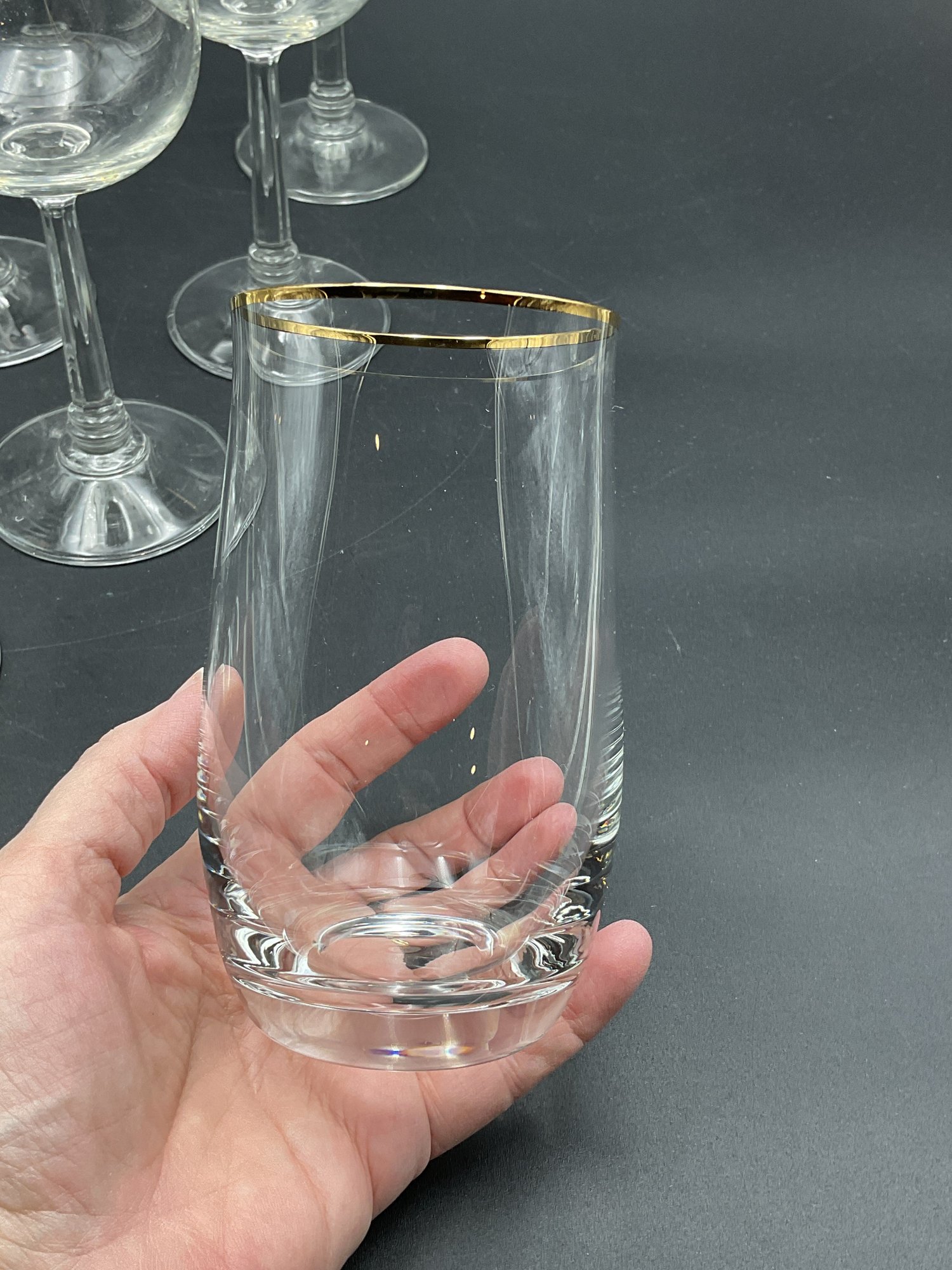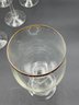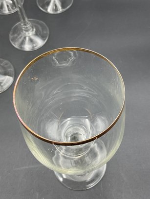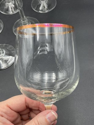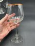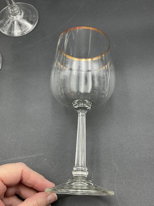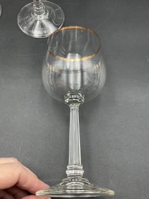 Made in Germany by Crystal Clear Industries. These elegant crystal glasses have a blown round bowl with gold rim, slender faceted stems with rings at the base and a sturdy, wide foot. The glasses have a delicate feel and nice ring to them.