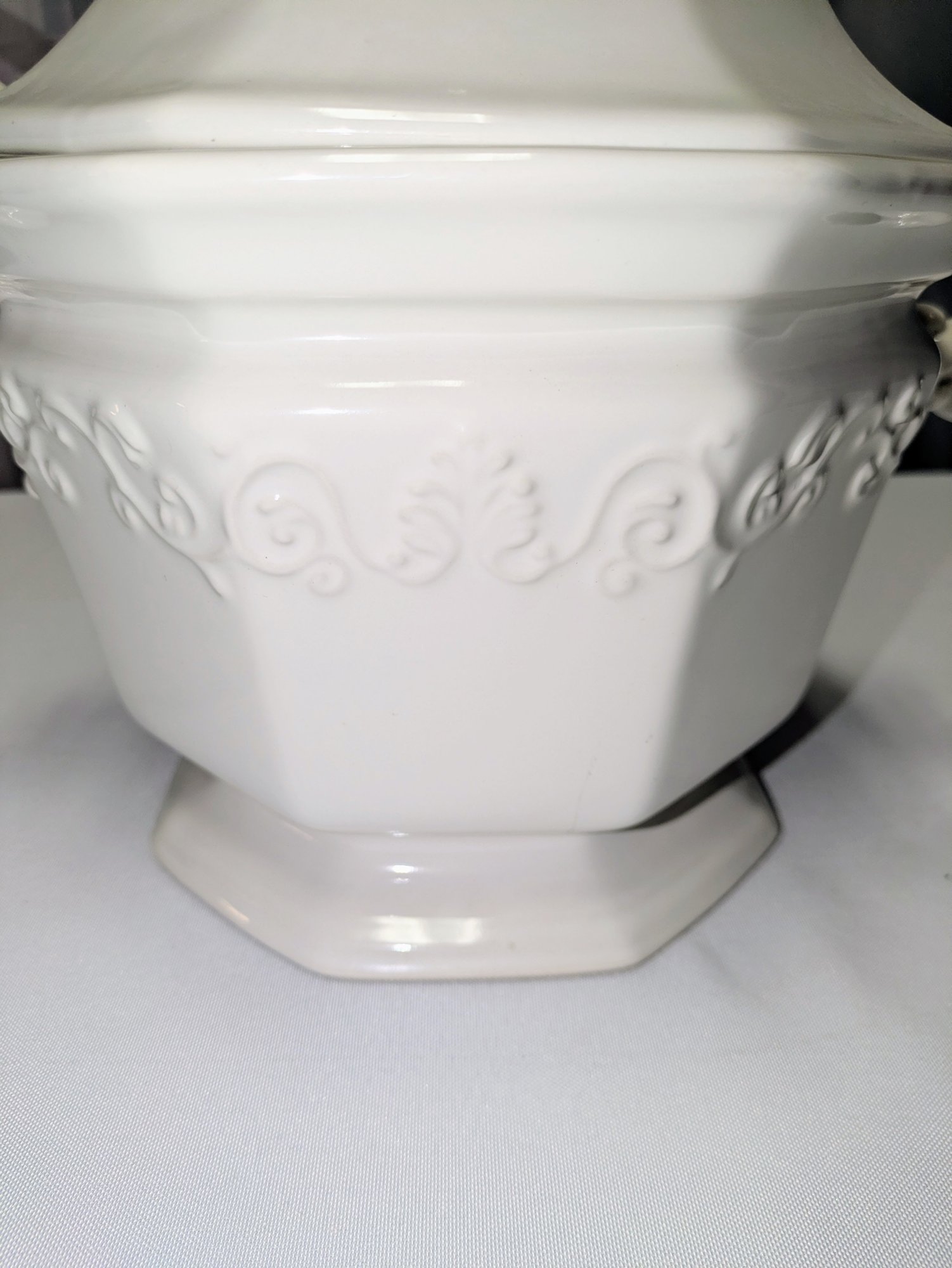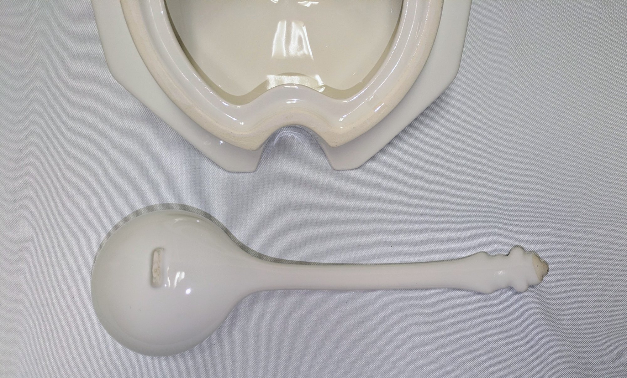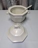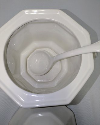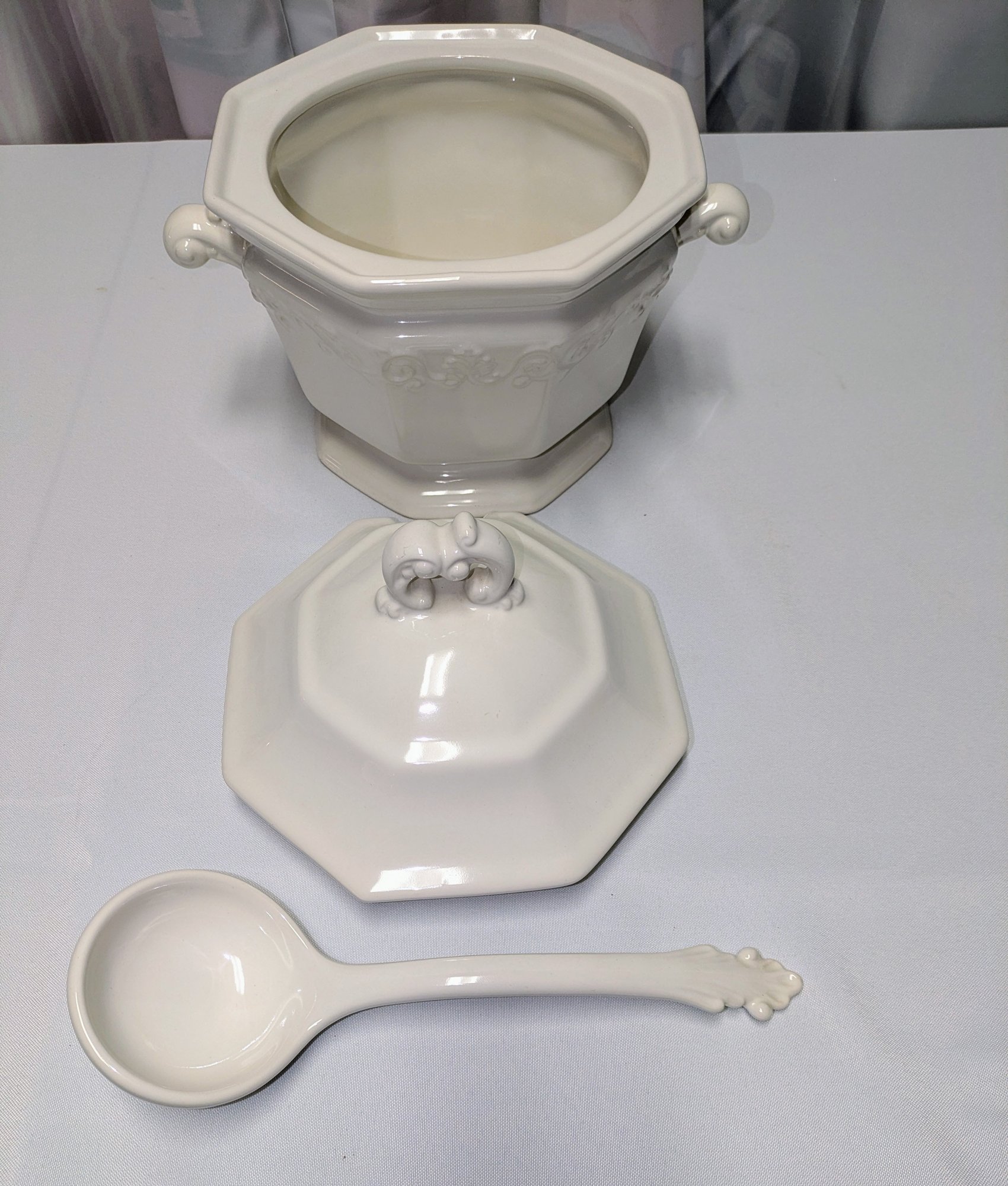 Vintage JCPenney Porcelain Soup Tureen with Ladel. Great Detailing and Design Accents. The Soup Tureen is in Excellent Vintage Condition. The Ladel Has a Small Chip on the Top of the Handle, Consistent with Age and Use. Please see all photos as part of the description and condition. Tureen (with the cover) 10.5"H / 6.5"H (without cover) x 8.5" x 8.75" / 11.5" Handle to Handle.