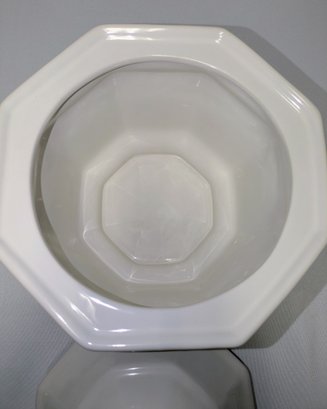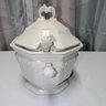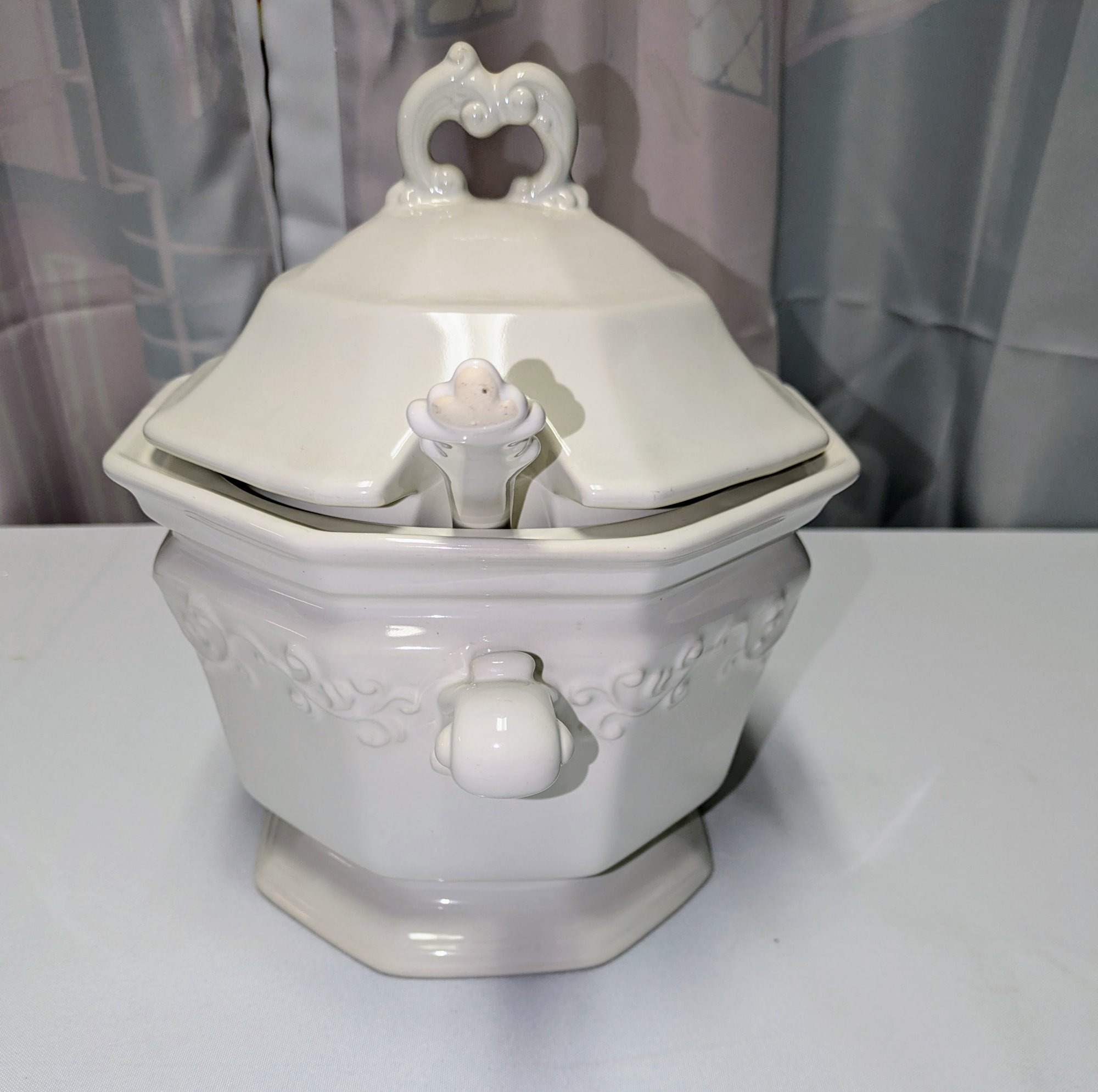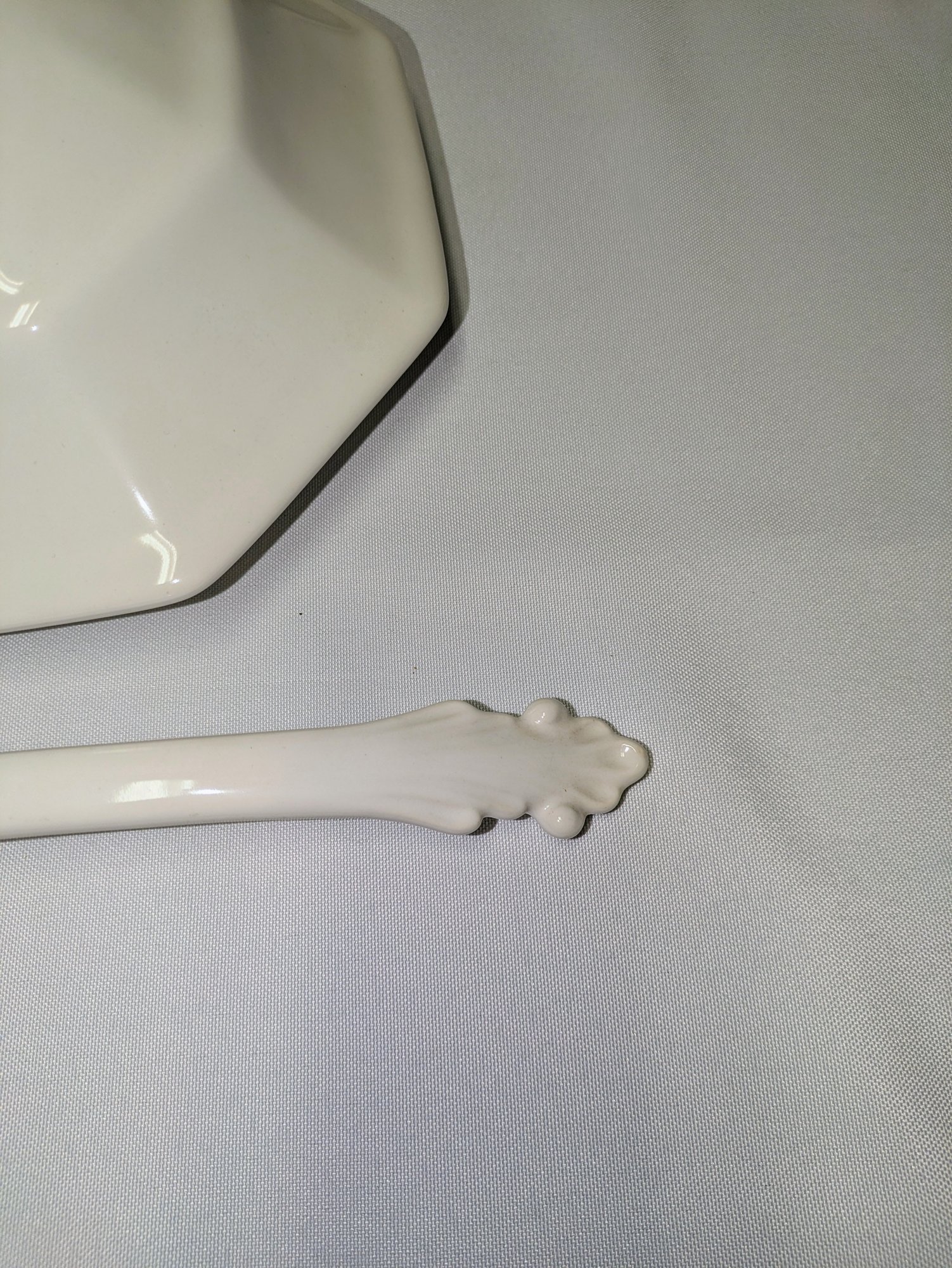 Vintage JCPenney Porcelain Soup Tureen with Ladel. Great Detailing and Design Accents. The Soup Tureen is in Excellent Vintage Condition. The Ladel Has a Small Chip on the Top of the Handle, Consistent with Age and Use. Please see all photos as part of the description and condition. Tureen (with the cover) 10.5"H / 6.5"H (without cover) x 8.5" x 8.75" / 11.5" Handle to Handle.