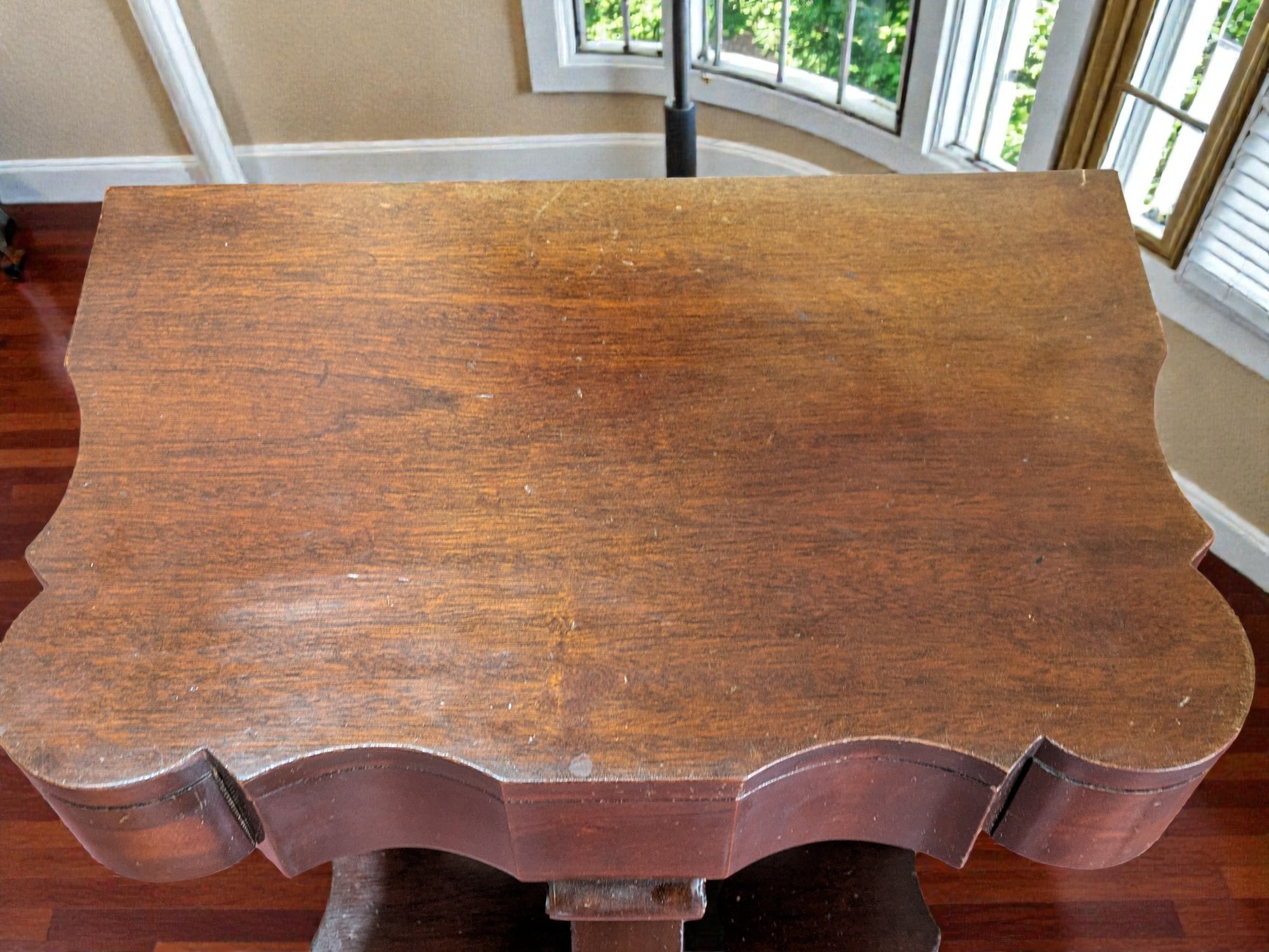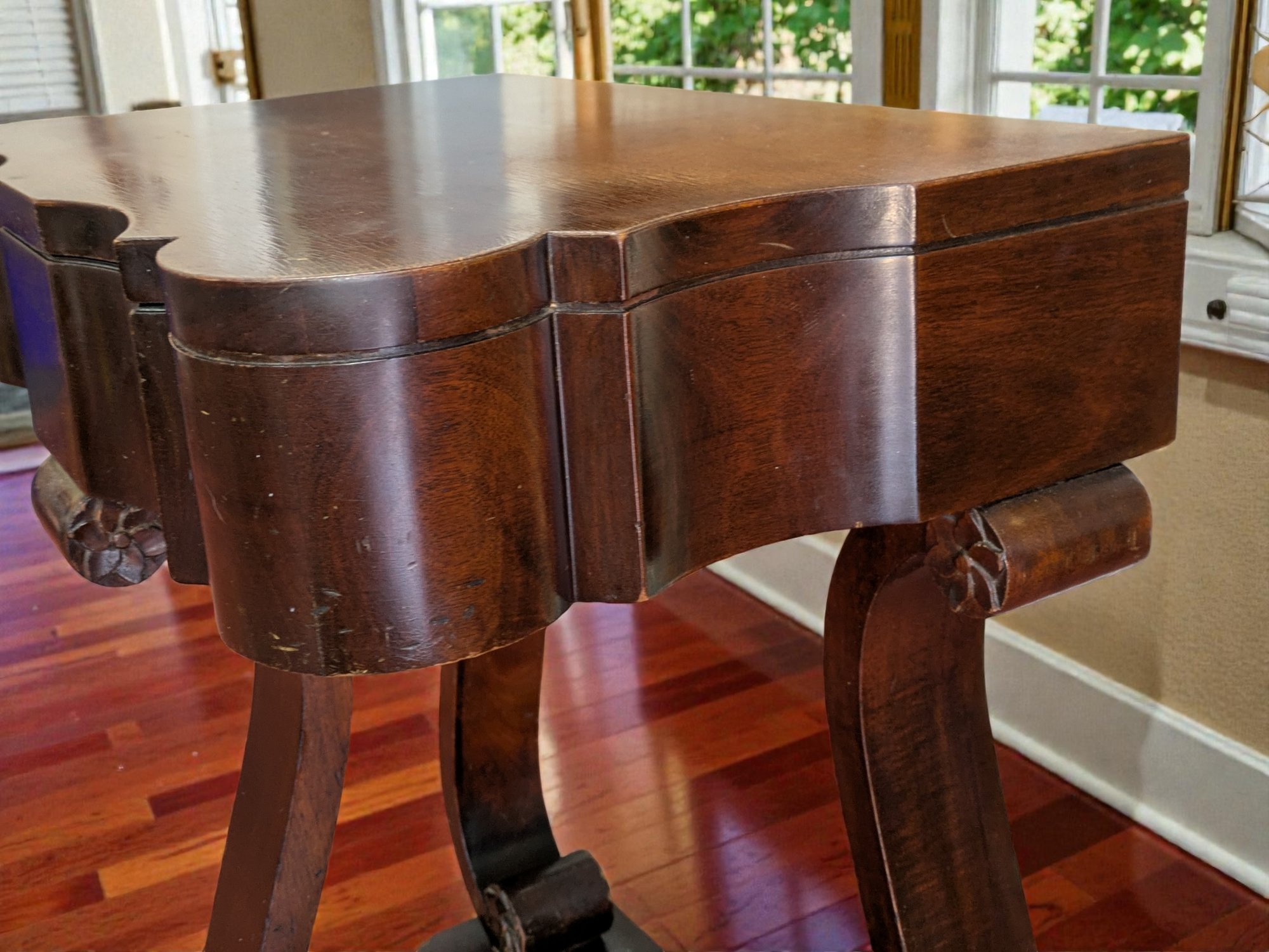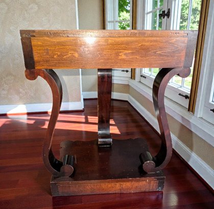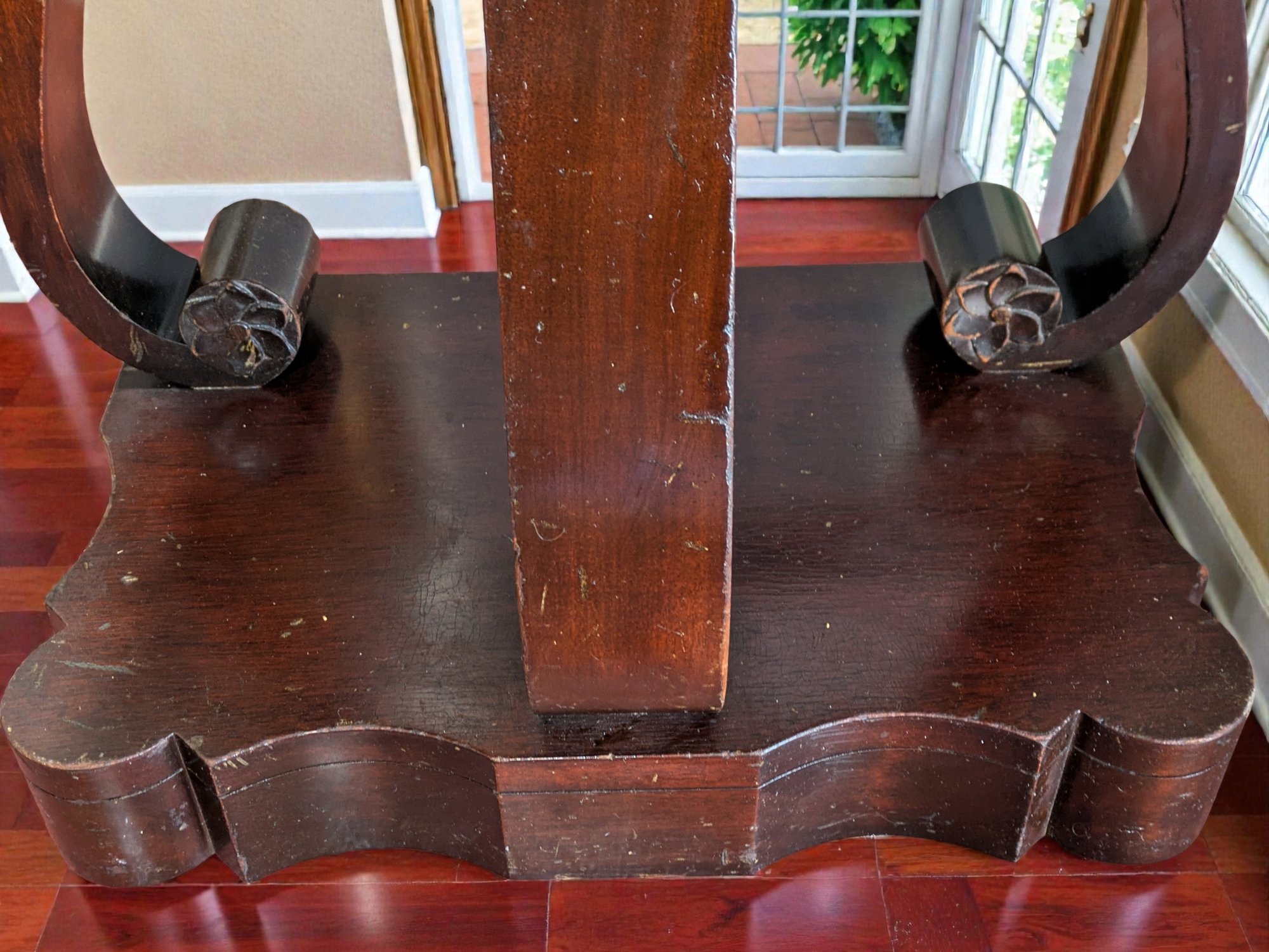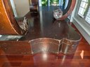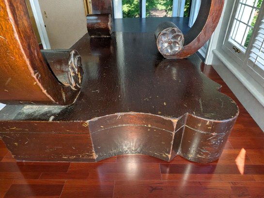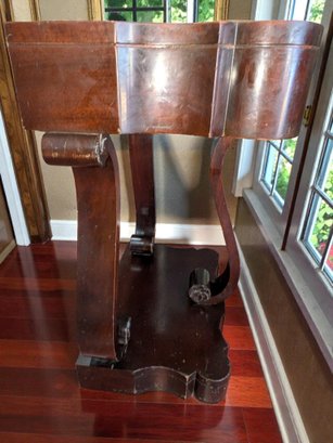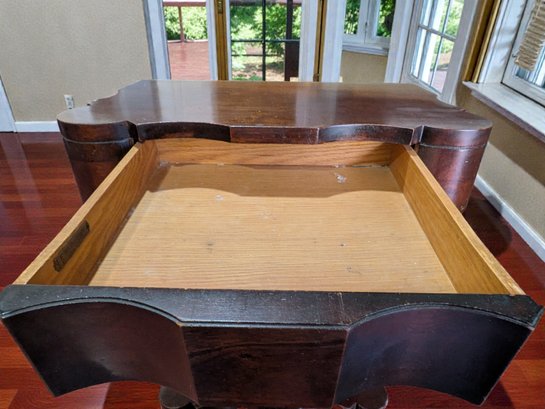 Made of Solid Mahogany with scalloped tops, a single drawer, single drawer and a scrolled pillar and scroll base design. Wear and Marks to the Top Surface and Other Areas, All Consistent with Age, Movement & Use. Some can be filled in with stain renew, or a light sanding and new stain coating overall. Please see all photos as part of the description and condition. 22"W x 27"H x 14"D