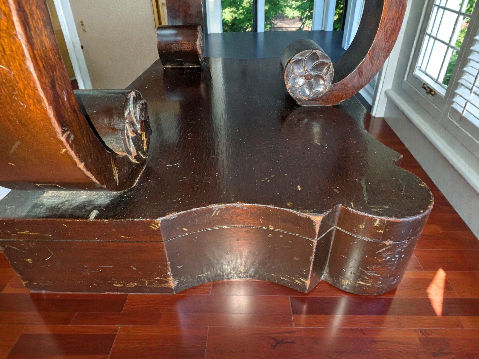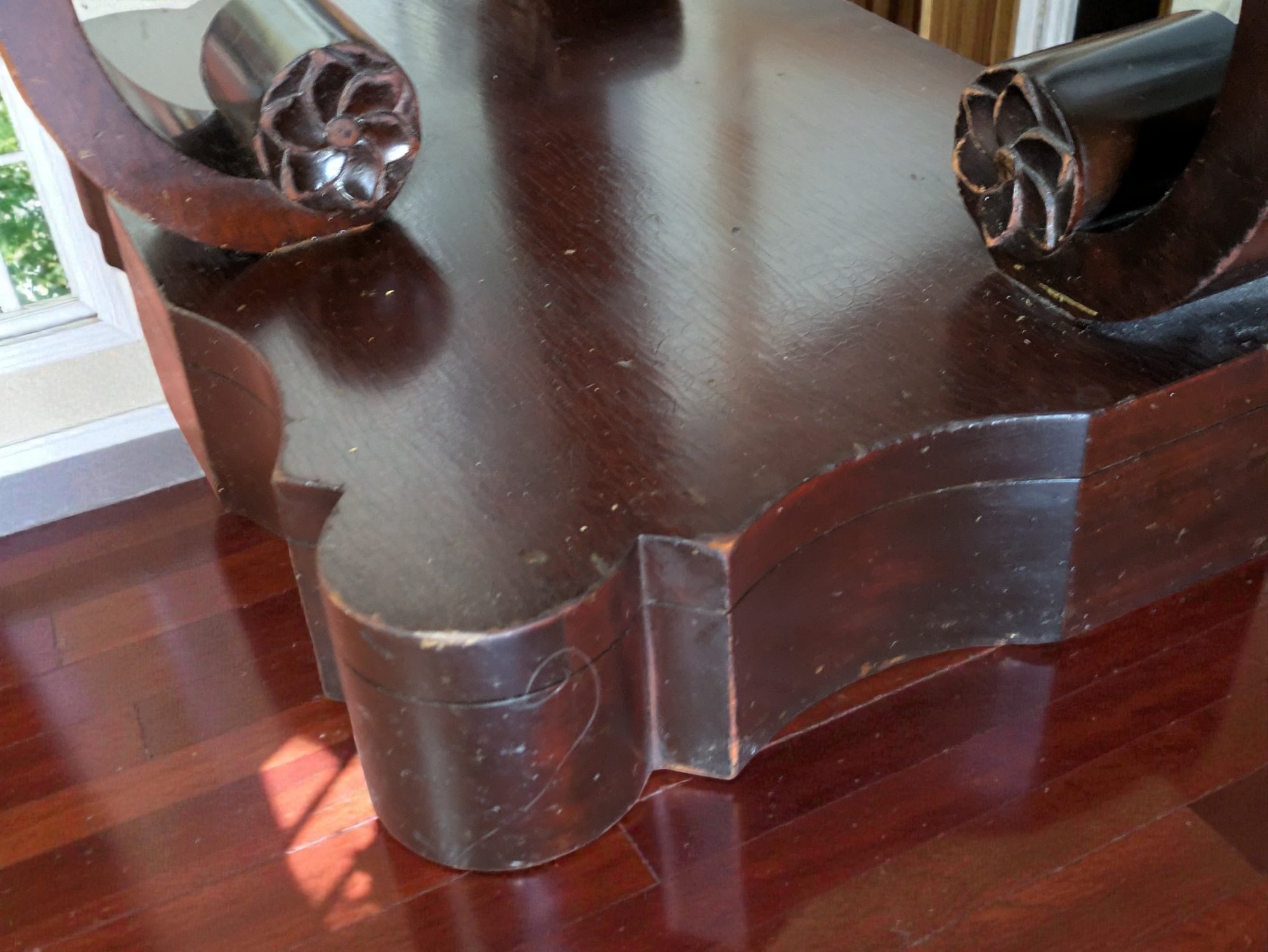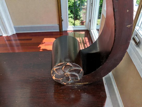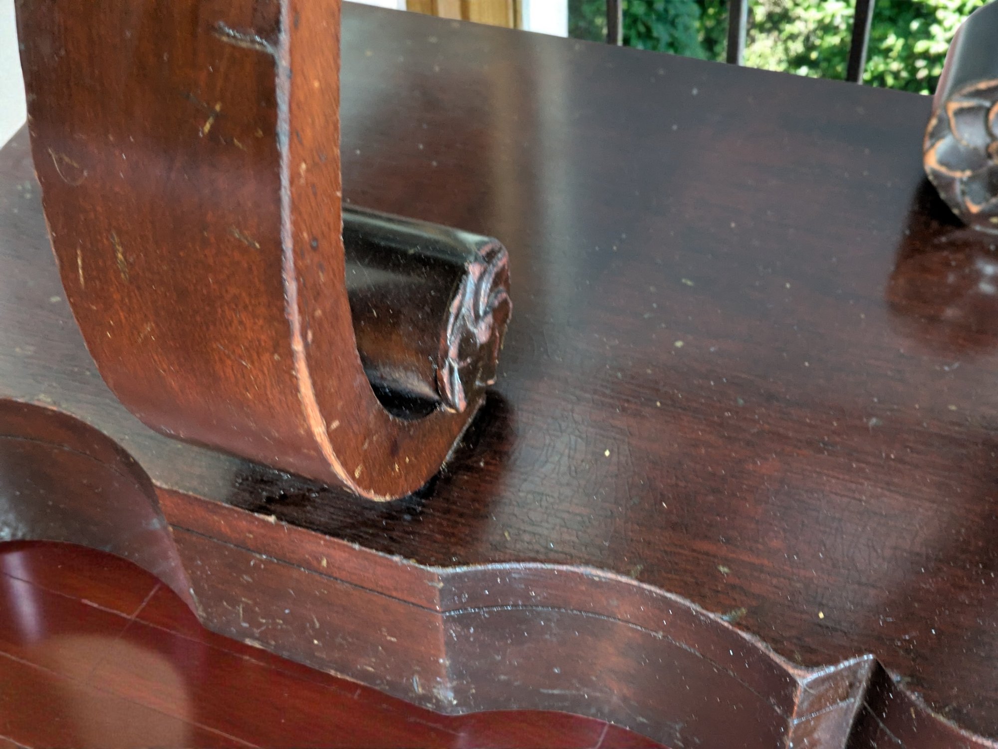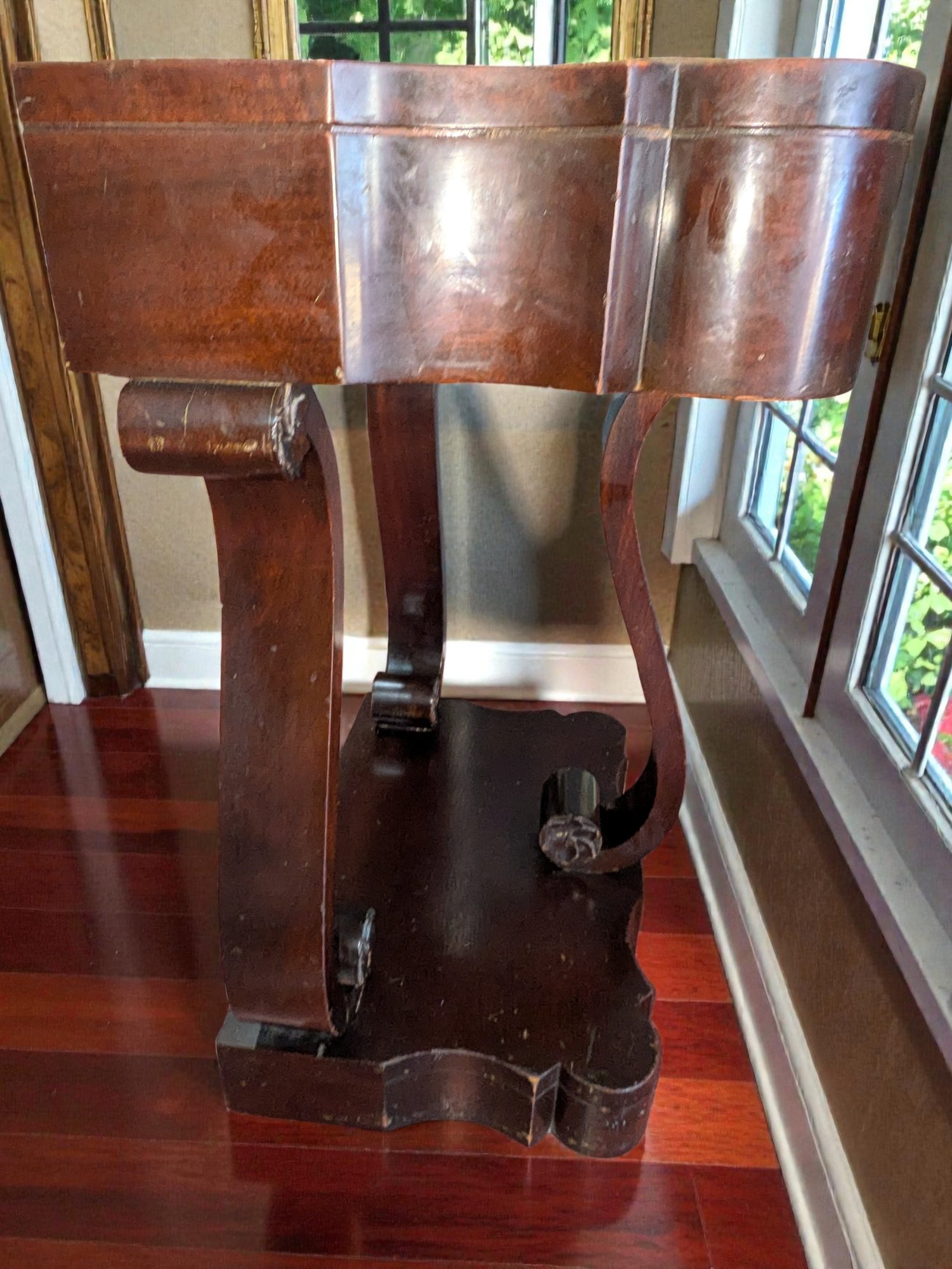 Made of Solid Mahogany with scalloped tops, a single drawer, single drawer and a scrolled pillar and scroll base design. Wear and Marks to the Top Surface and Other Areas, All Consistent with Age, Movement & Use. Some can be filled in with stain renew, or a light sanding and new stain coating overall. Please see all photos as part of the description and condition. 22"W x 27"H x 14"D