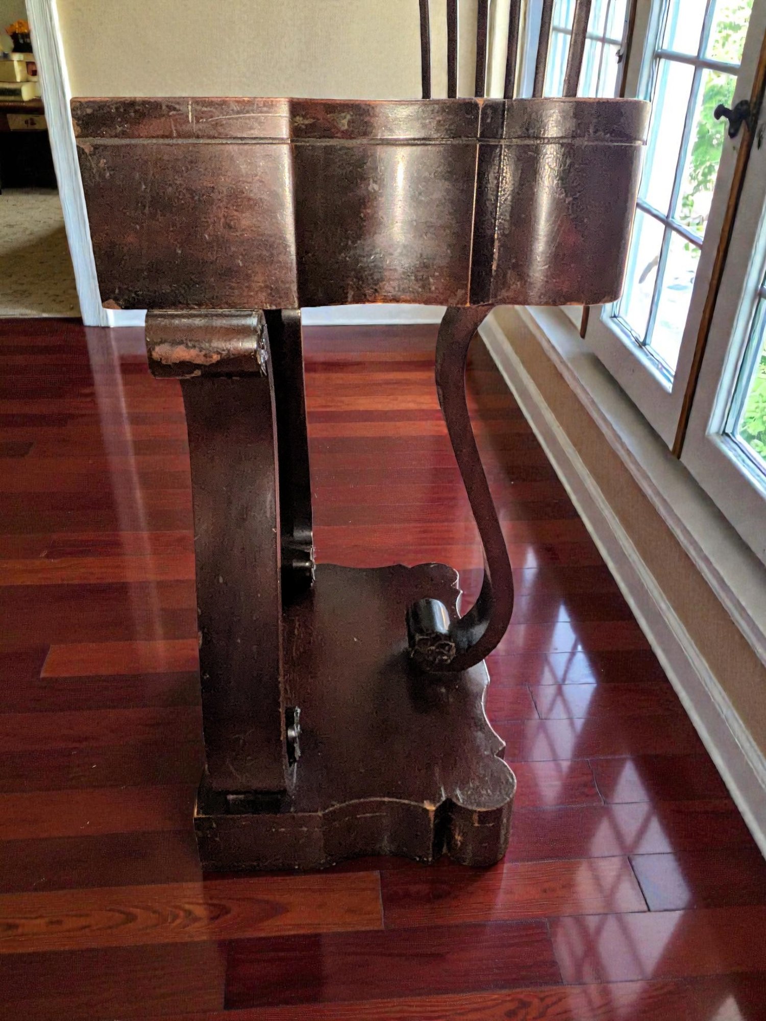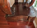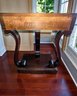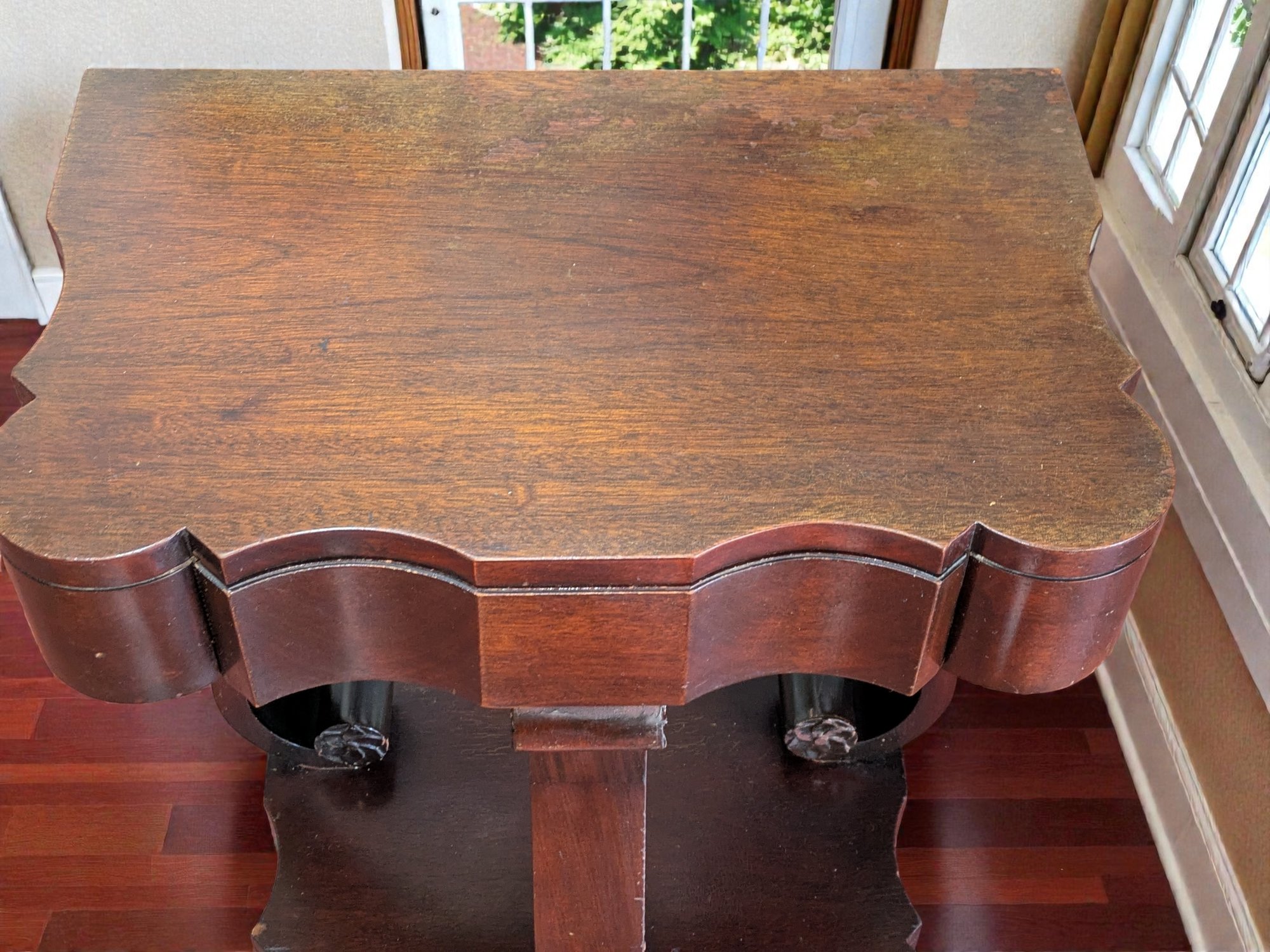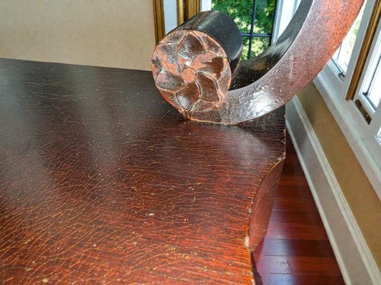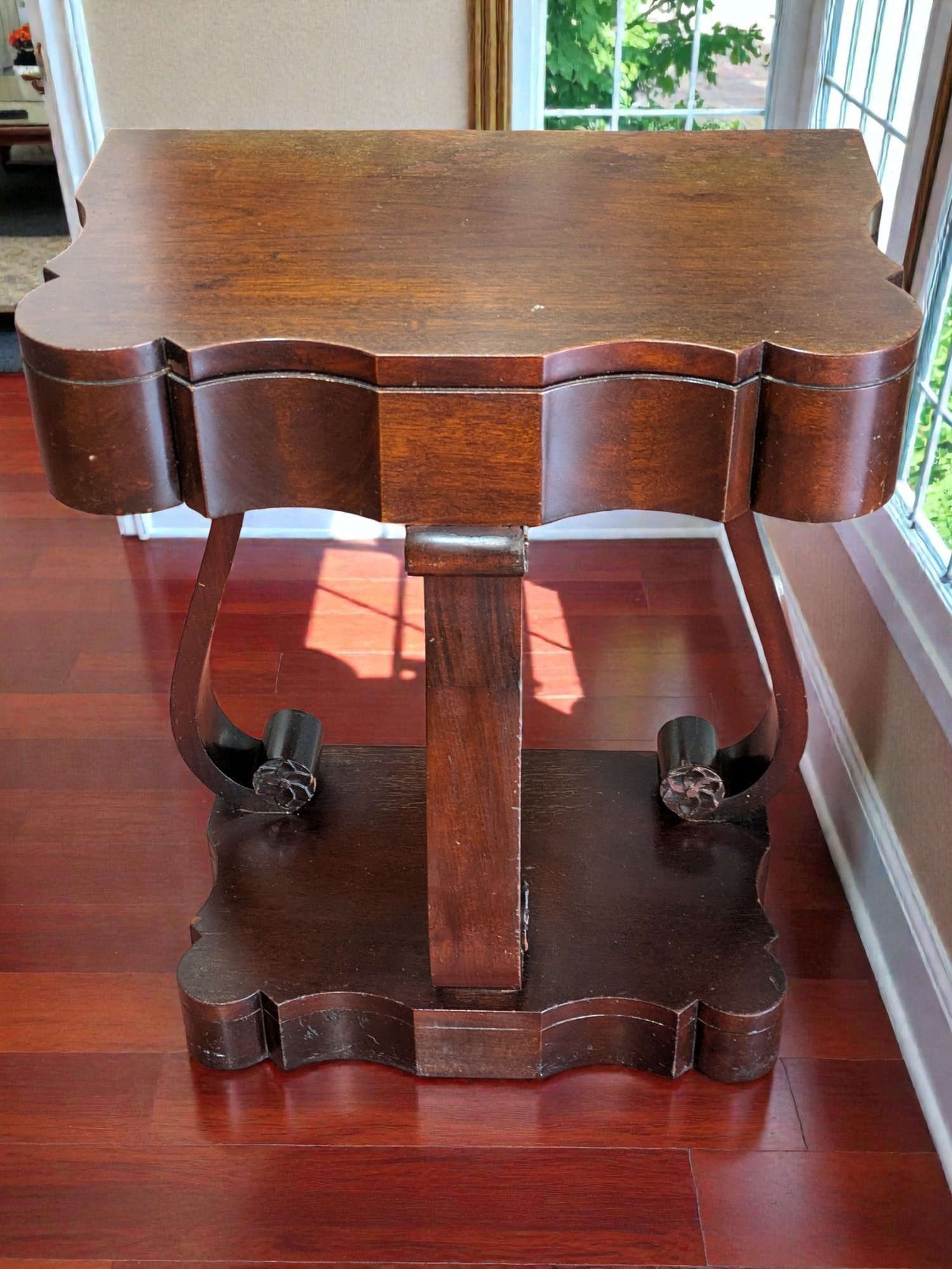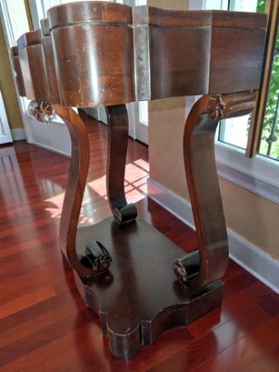 Made of Solid Mahogany with scalloped tops, a single drawer, single drawer and a scrolled pillar and scroll base design. A lot of wear to the top surface, and the bottom shows marks and wear, all consistent with age, use, and movement. Some can be filled in with stain renew, or a light sanding and new stain coating overall. Please see all photos as part of the description and condition. 22"W x 27"H x 14"D