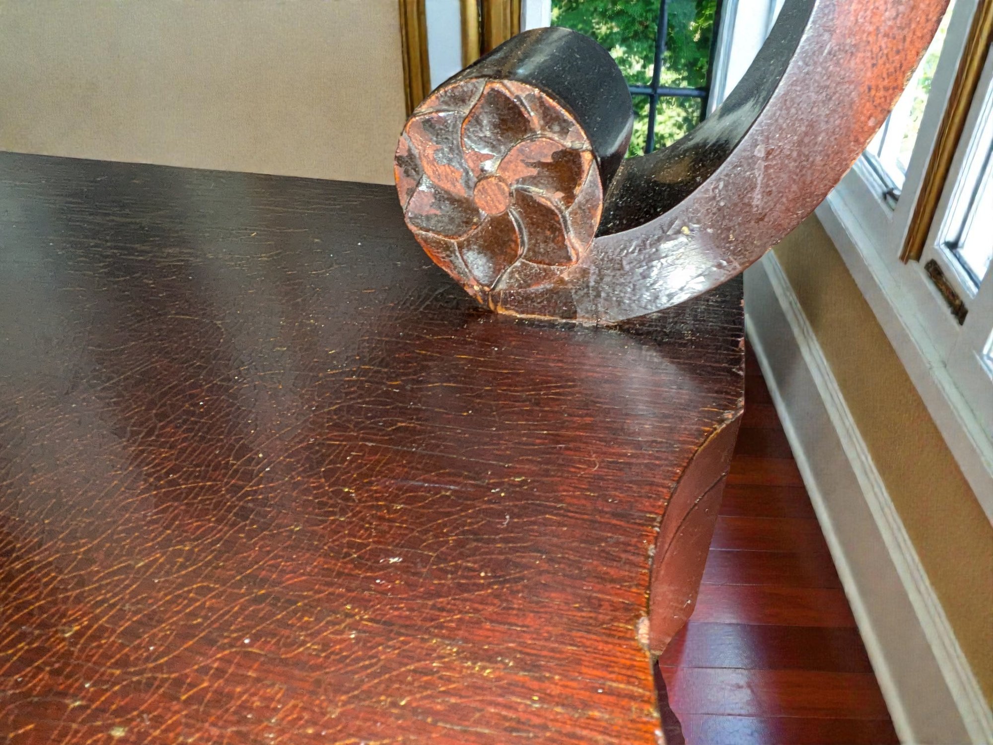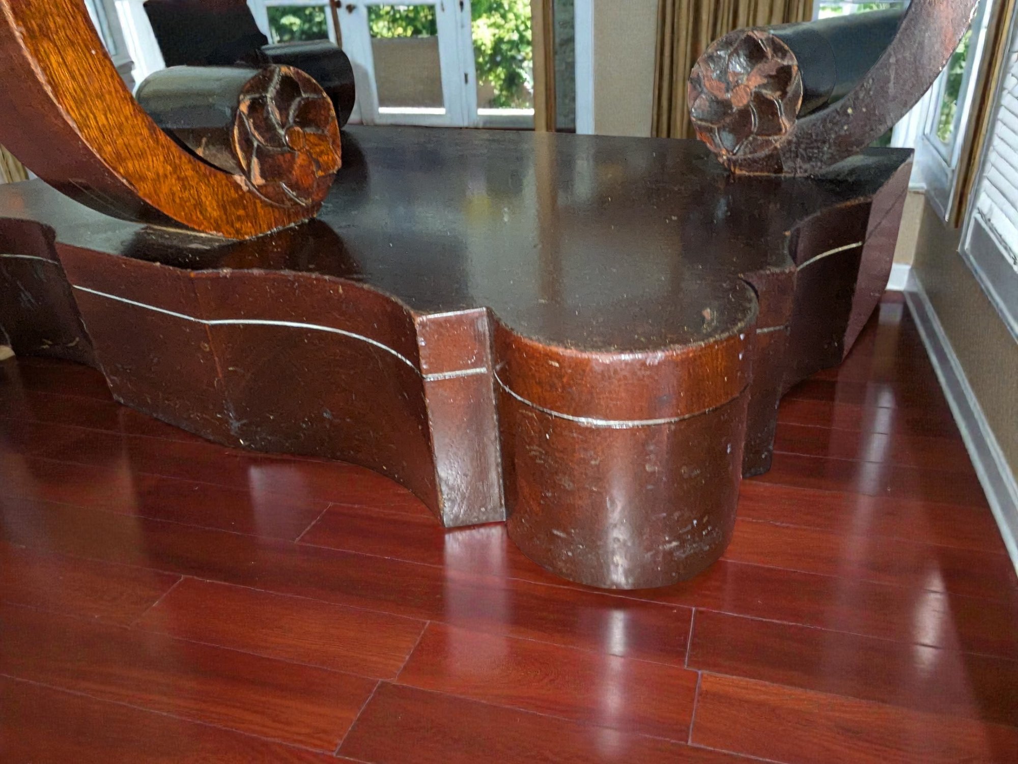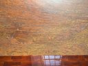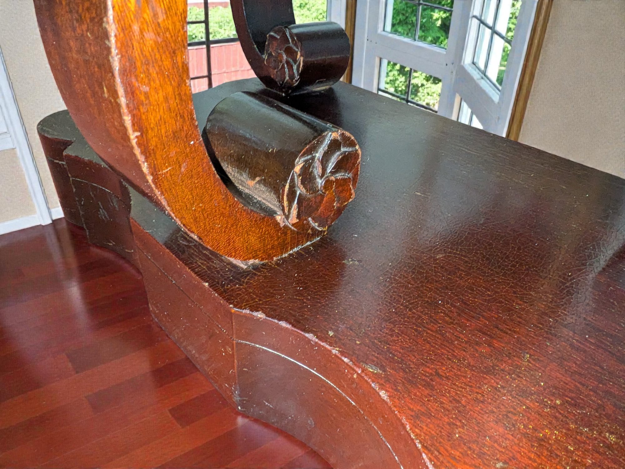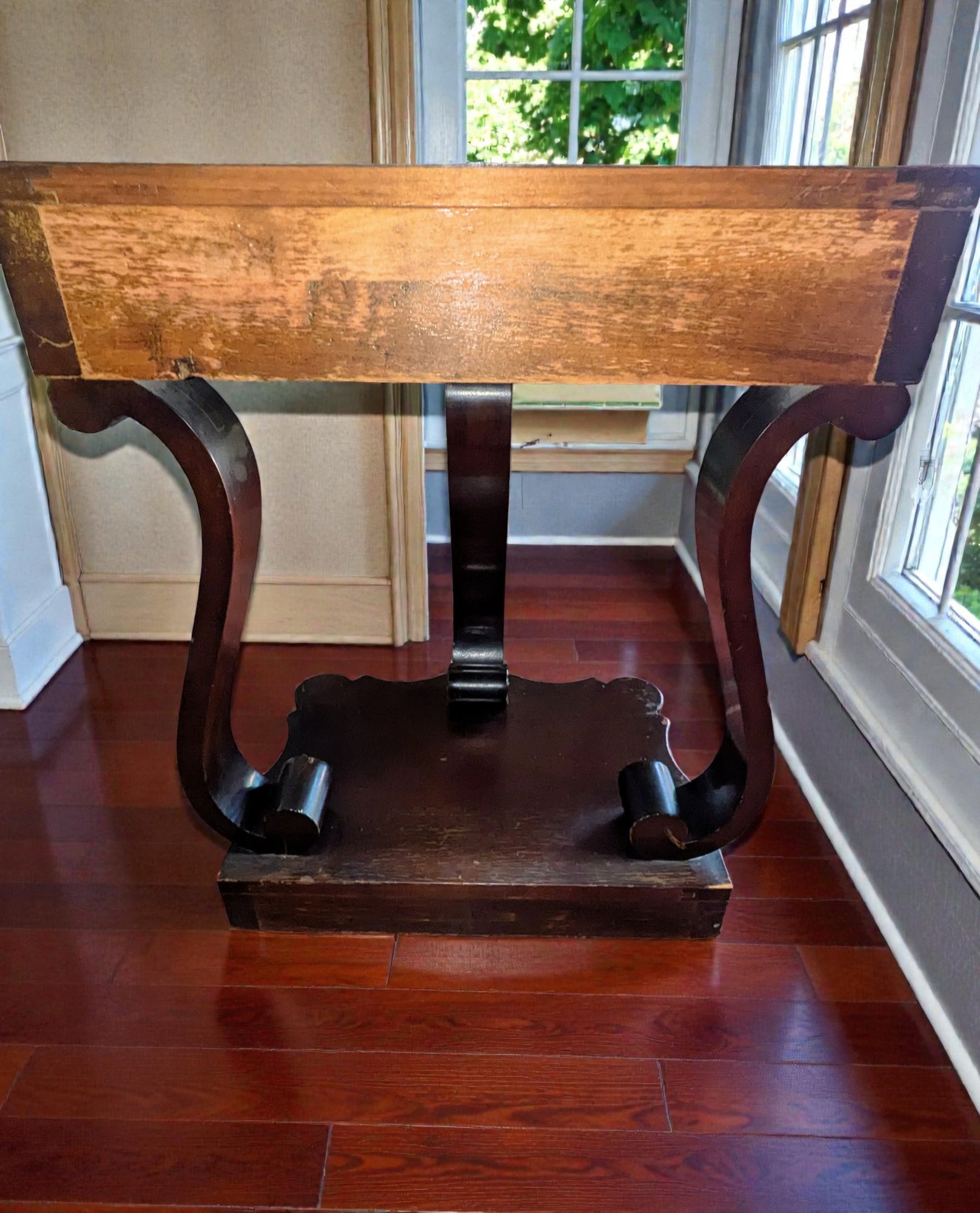 Made of Solid Mahogany with scalloped tops, a single drawer, single drawer and a scrolled pillar and scroll base design. A lot of wear to the top surface, and the bottom shows marks and wear, all consistent with age, use, and movement. Some can be filled in with stain renew, or a light sanding and new stain coating overall. Please see all photos as part of the description and condition. 22"W x 27"H x 14"D