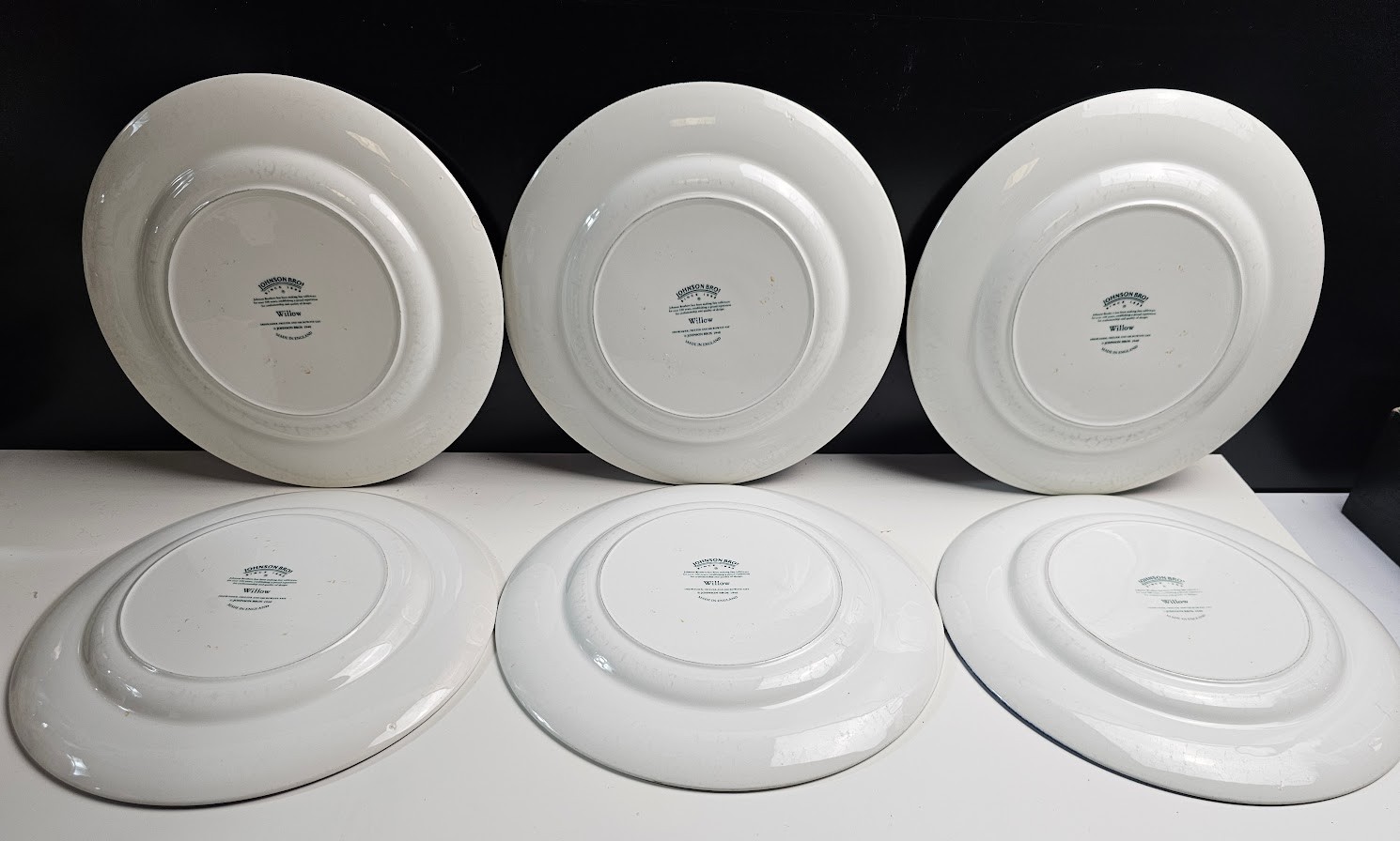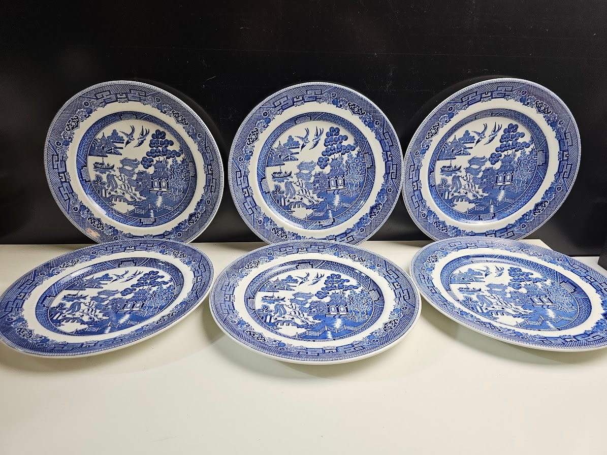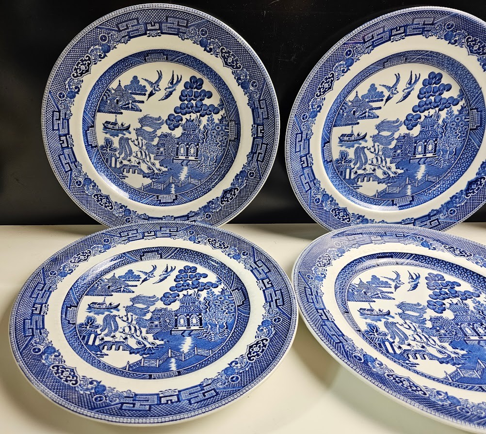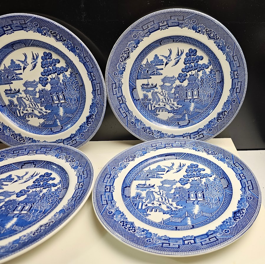 Vintage Johnson Bros iconic blue willow dinner plates inspired by tgraditional Chinese stories. Small chip - **Please View the Pictures for Item Condition** and Thank You for your Support. Every Dollar helps individuals and families through our Foundation & Mission.