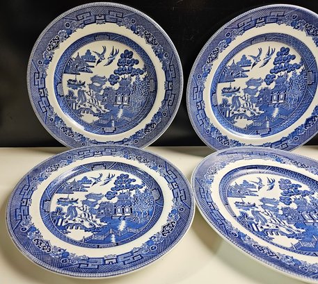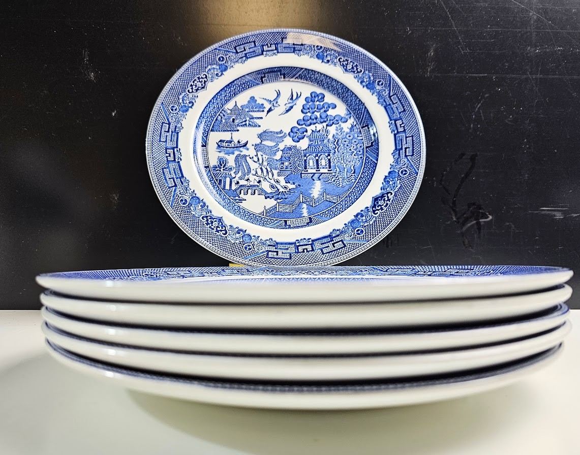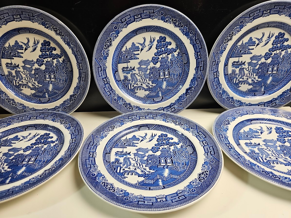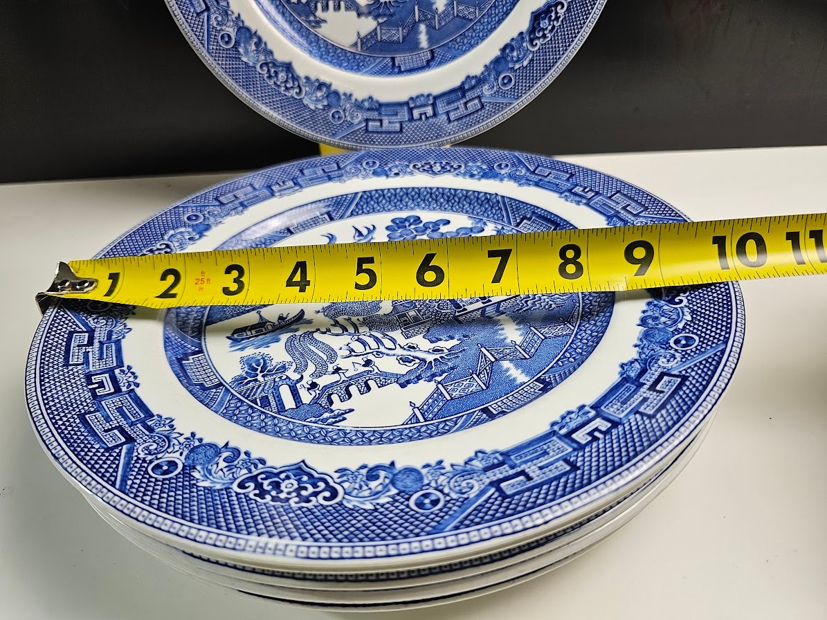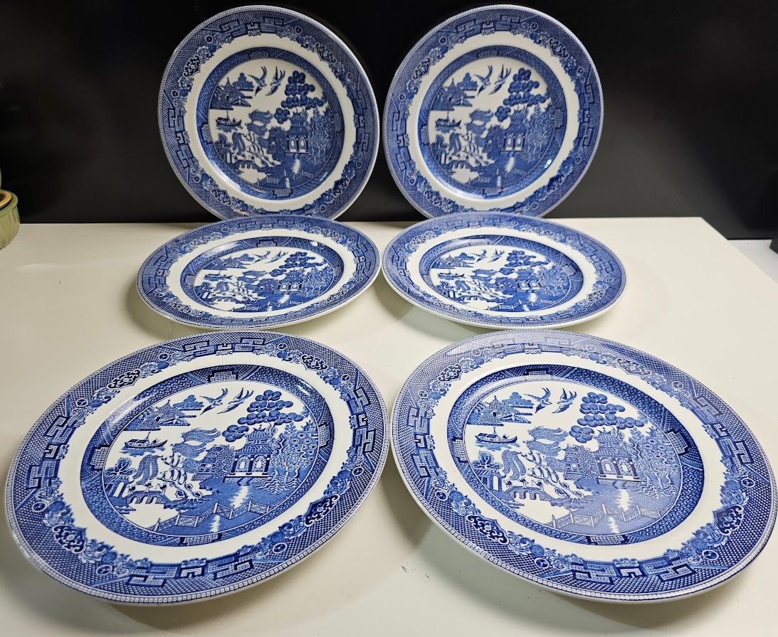 Vintage Johnson Bros iconic blue willow dinner plates inspired by tgraditional Chinese stories. Small chip - **Please View the Pictures for Item Condition** and Thank You for your Support. Every Dollar helps individuals and families through our Foundation & Mission.