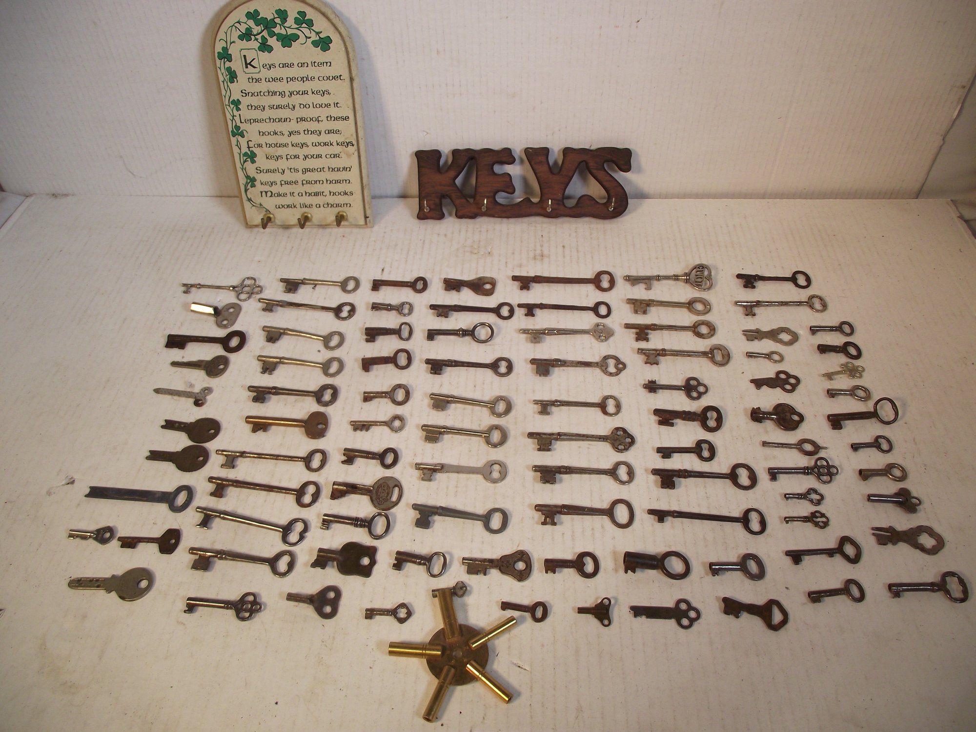 VINTAGE KEY HOLDERS AND ANTIQUE KEY LOT. SEE PHOTOS FOR CONDITION AND VARIETY.