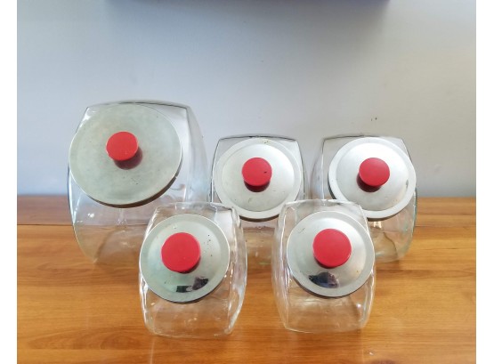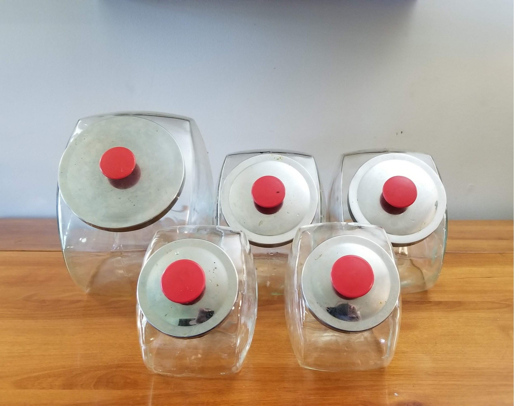 5 piece lot of vintage glass kitchen storage jars. 1 large, 2 medium and 2 small. All are in good used condition.
