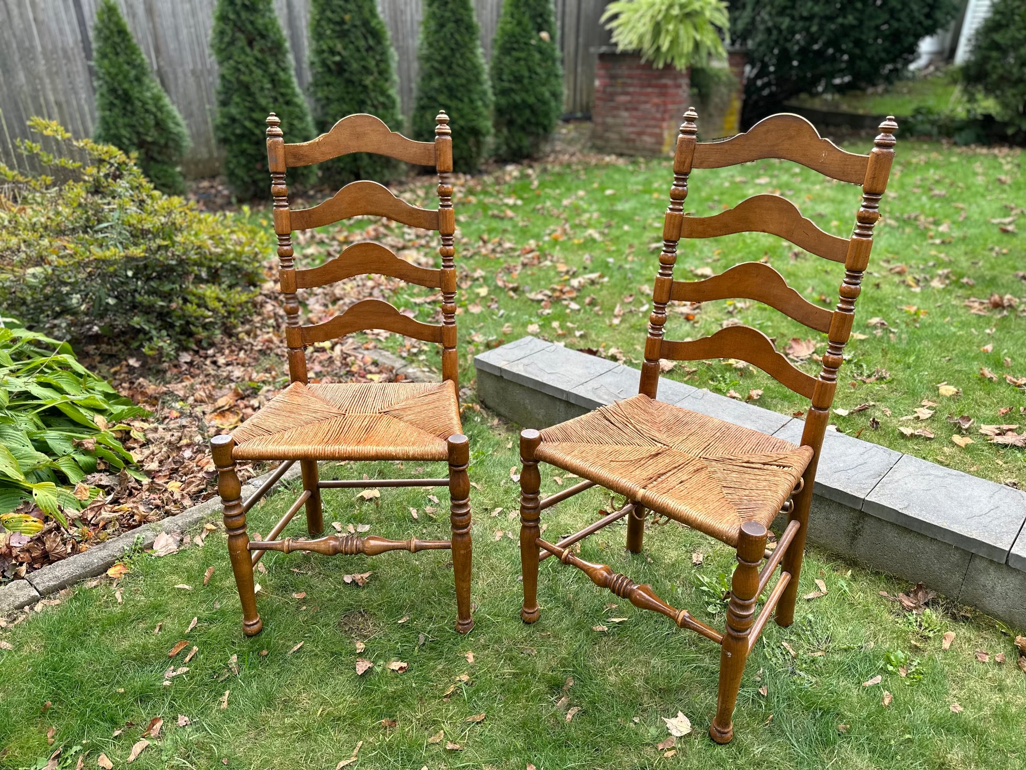 Vintage Ladder Back Rush Seat Chairs. Please note, one of the chair seats has rush seats that are loose.
