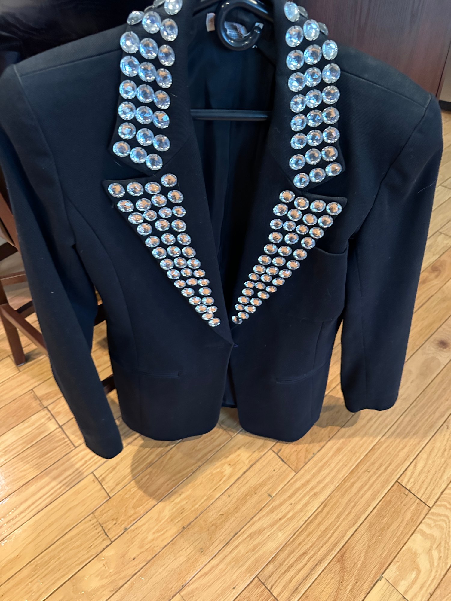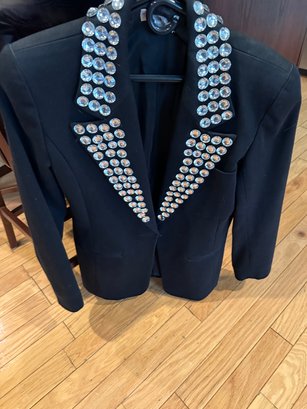 This 100% cotton jacket has padded shoulders and is adorned with crystals at collar and lapels. It is size medium and is in great condition.