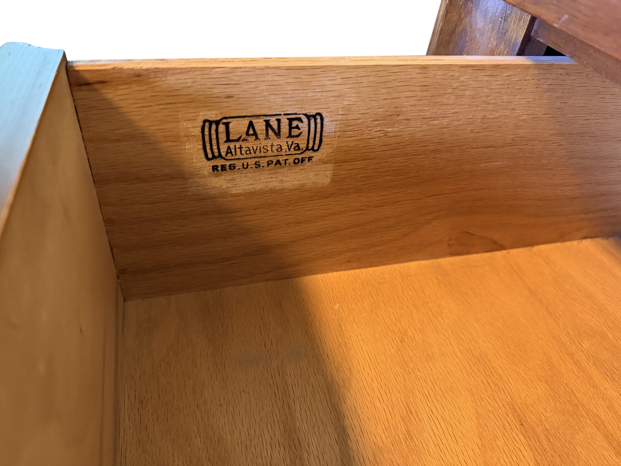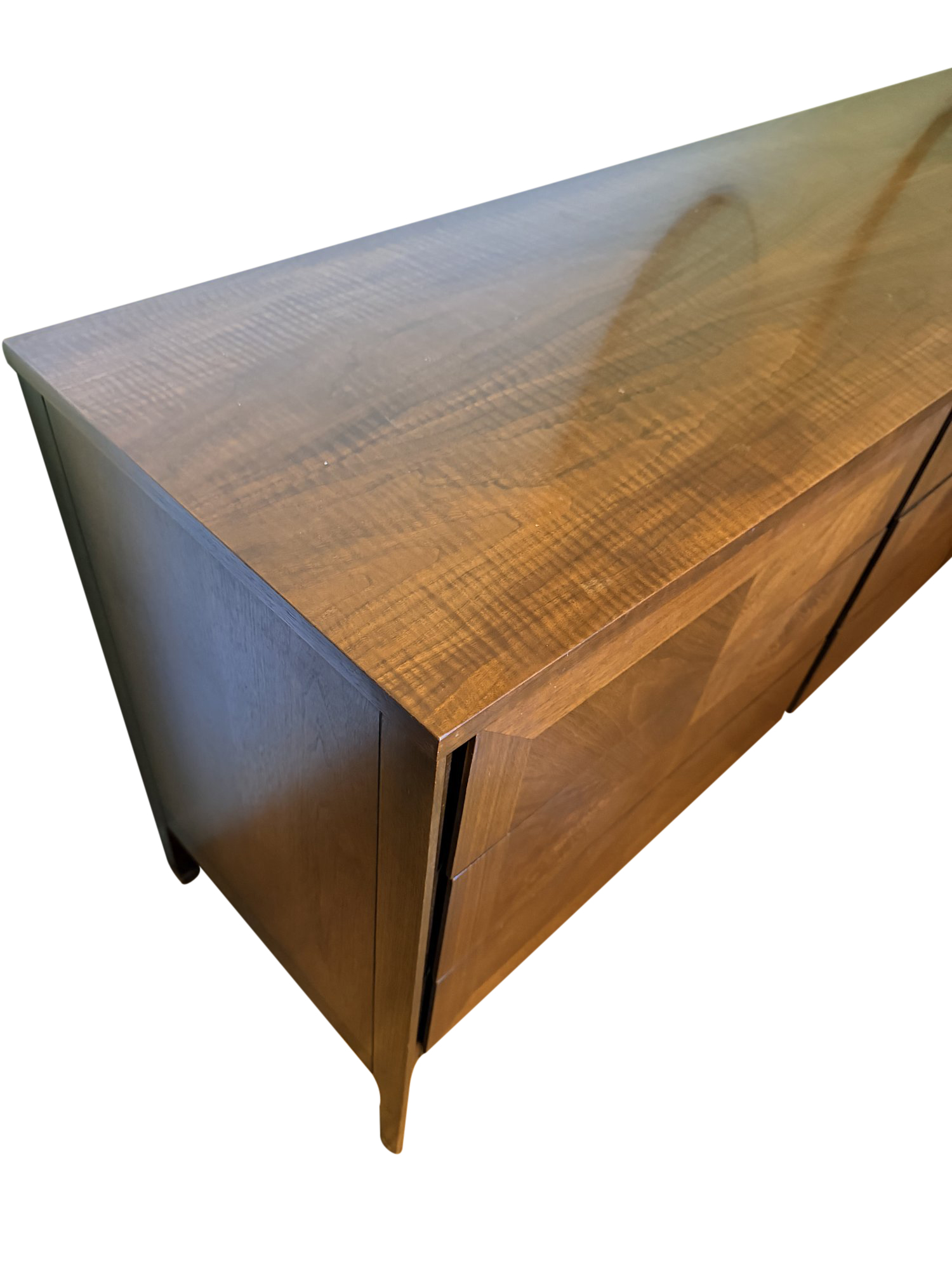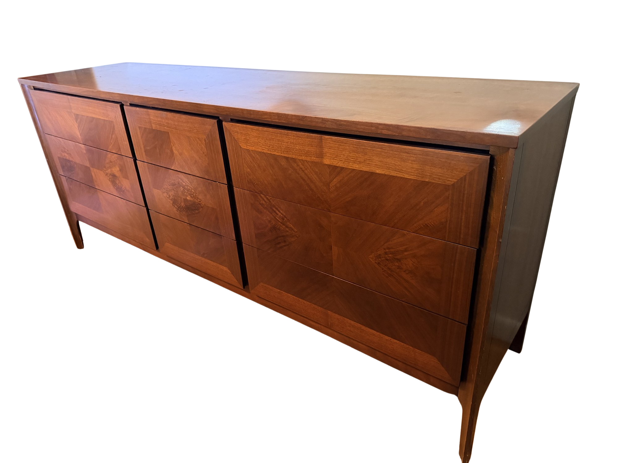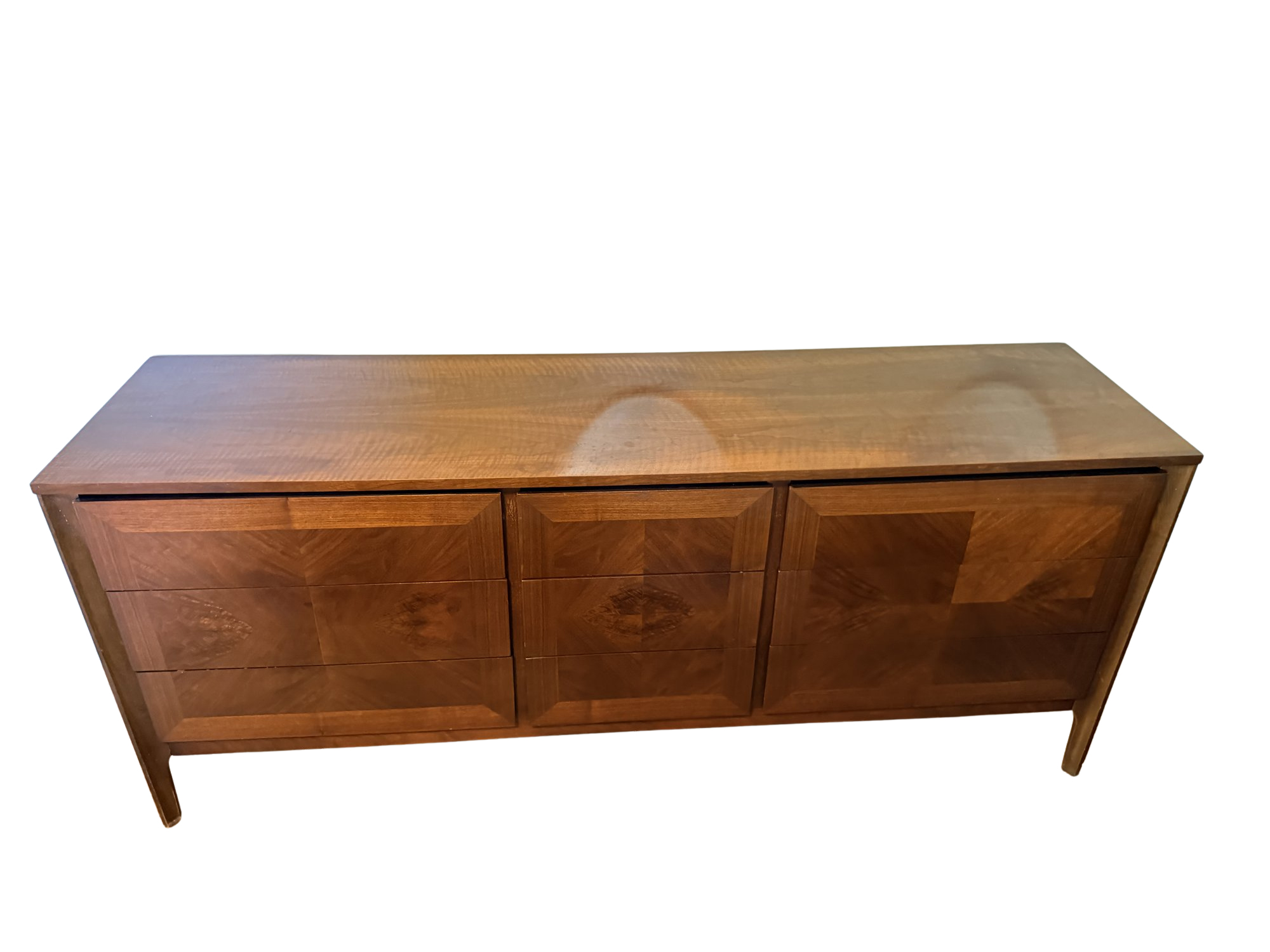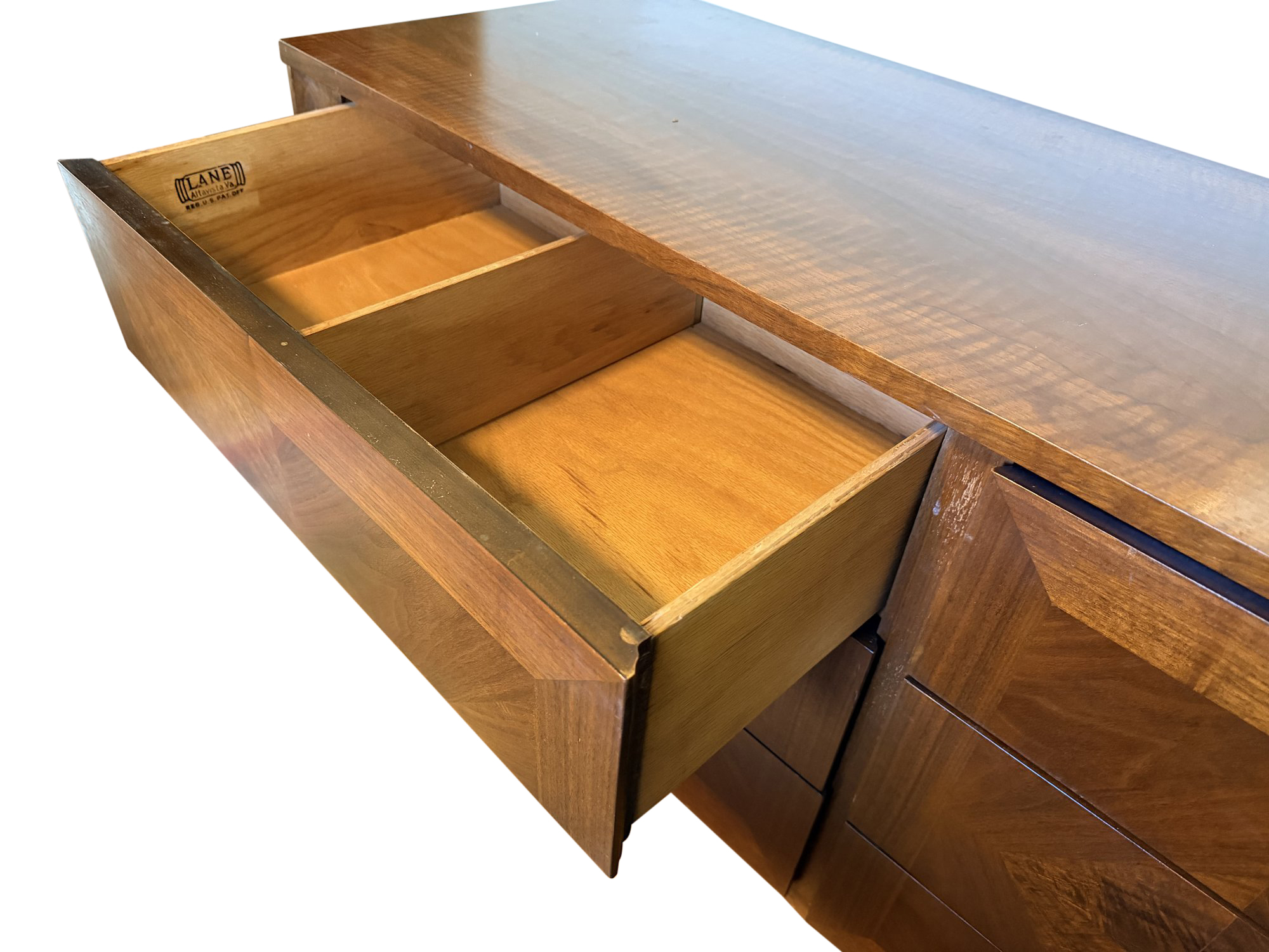 A striking vintage Lane mid-century modern dresser featuring nine spacious drawers and beautifully executed geometric bookmatched veneer across the drawer fronts. The rich walnut tones and clean, linear profile give this piece a timeless, high-end look that works seamlessly in both modern and traditional interiors.