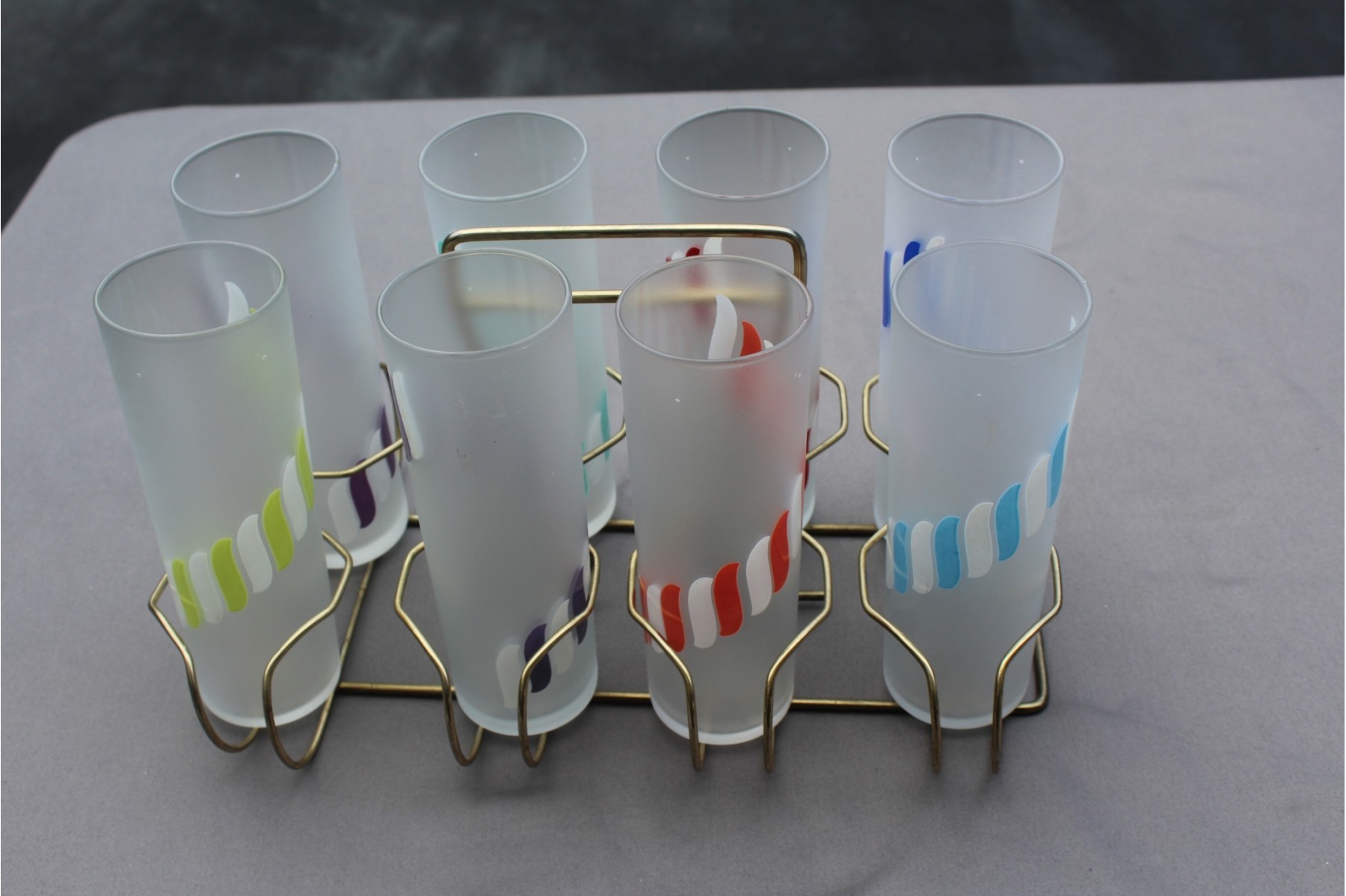 An Amazing set of classic Libbey Frosted Glasses certain to delight your party people (when we get back to parties). 2 purple so there might have been another color but overall excellent set. You will be very happy with this set.