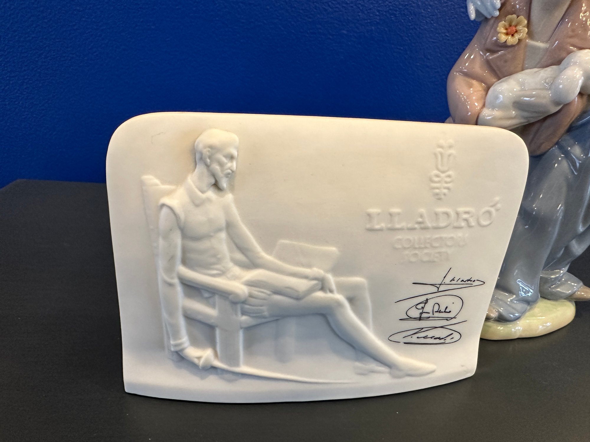 This vintage Lladro Plaque Collectors Society item is a beautiful addition for collectors The small-sized, white-colored figurine features a 3D effect of Don Quixote with a shell back design. It is made of porcelain and was handmade in Spain, signed by the artist.