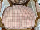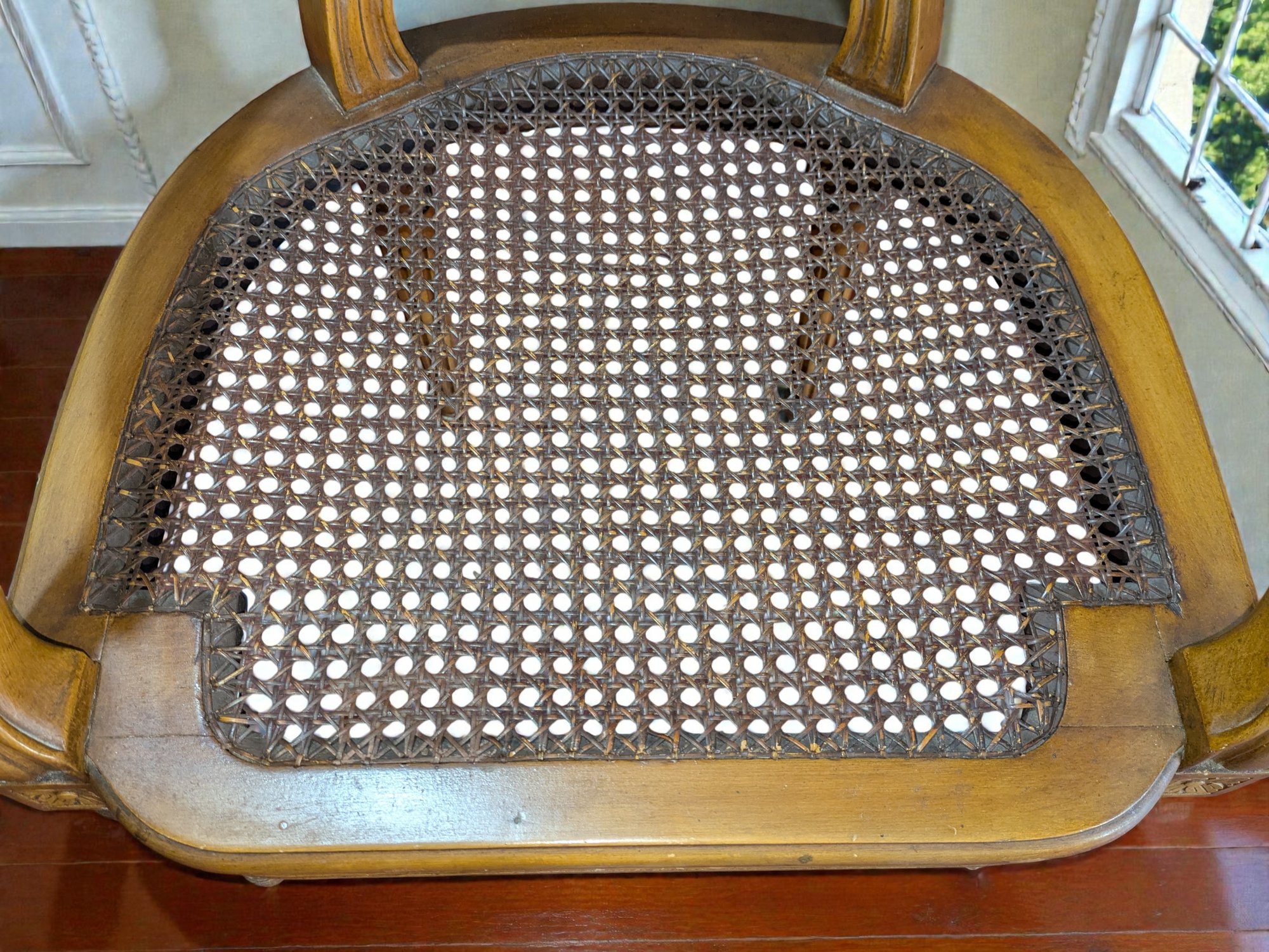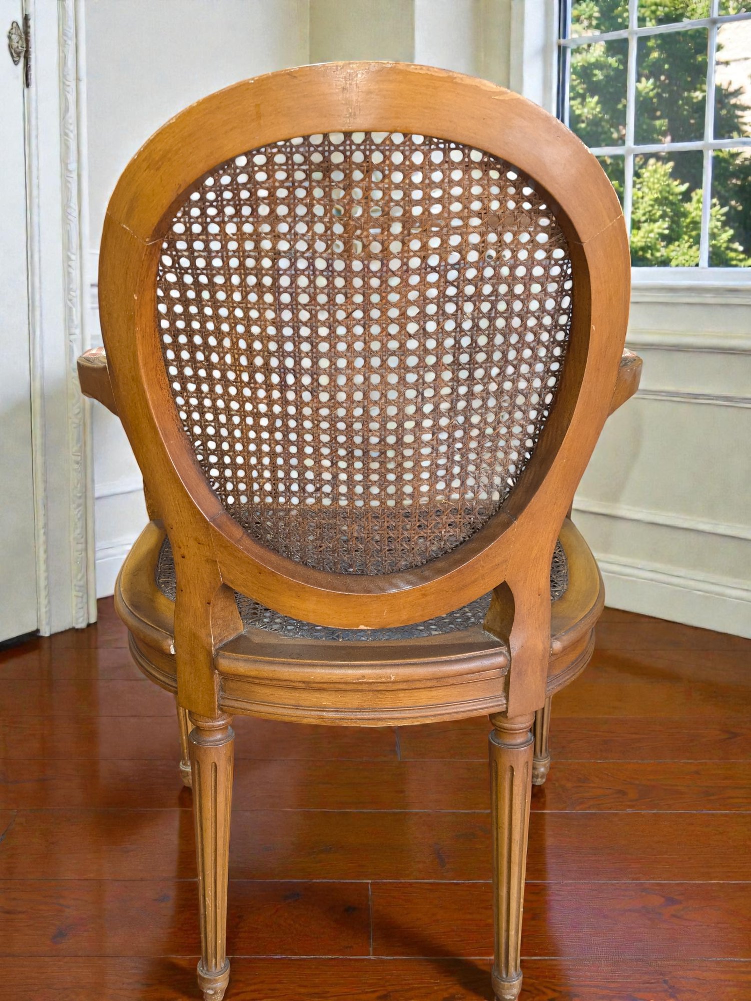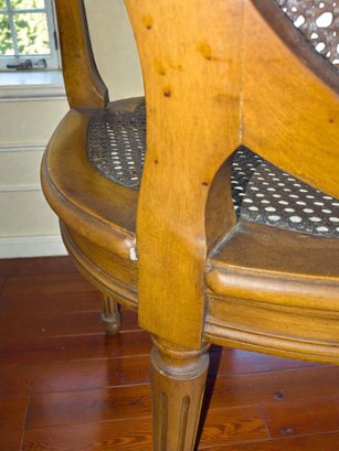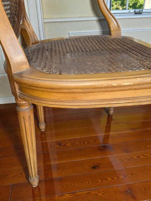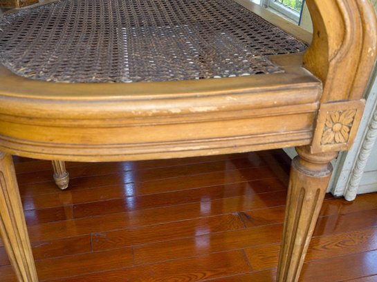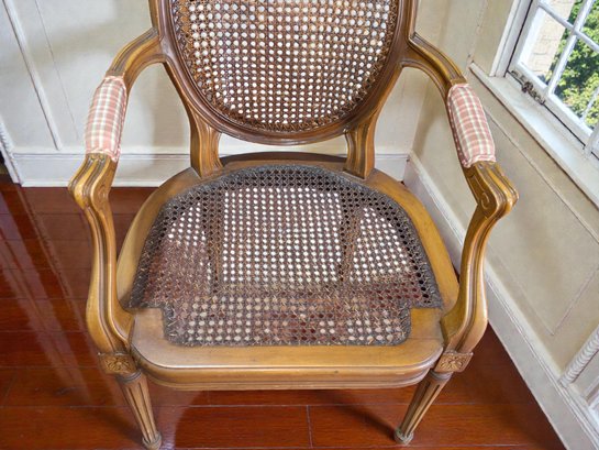 Features hand carved wood frame, walnut with a sculptured back, and padded armrests with a matching silk seat cushion and tapered fluted legs. Some wear to the cane, but no defects, and in very good vintage condition. There are some marks and wear to the frame, and the cushion has some stains. Overall, in Very Good Condition. Please see all photos as part of the description and condition. 23"W x 36.5"H x 23"D / Seat 21"H with the Cushion.