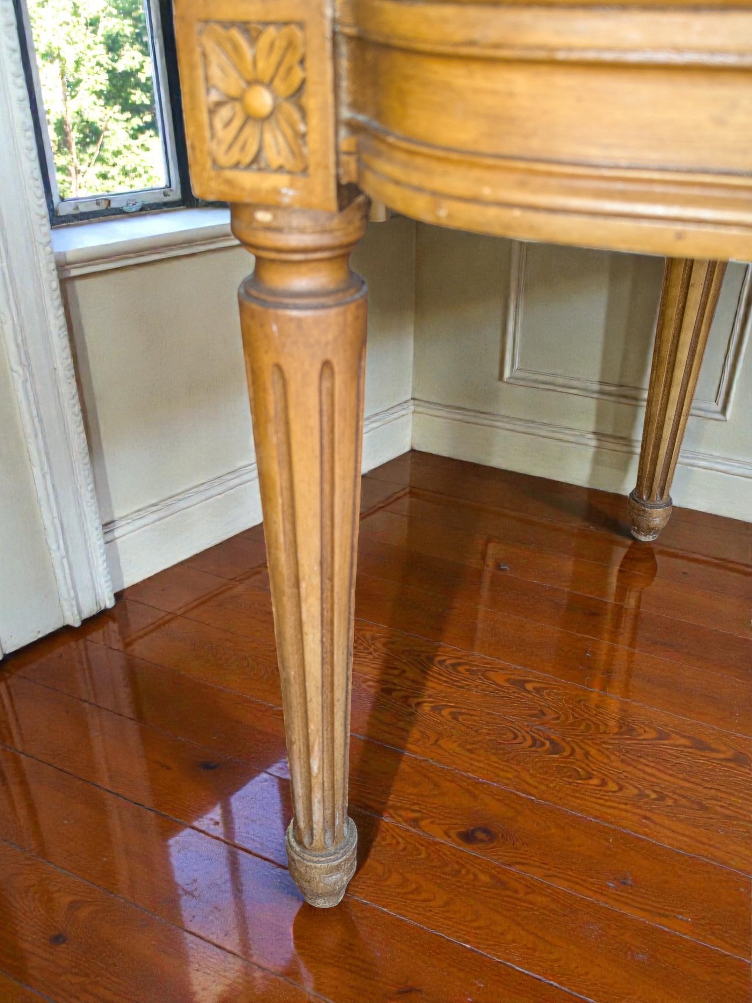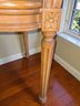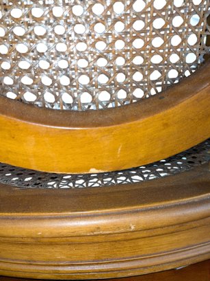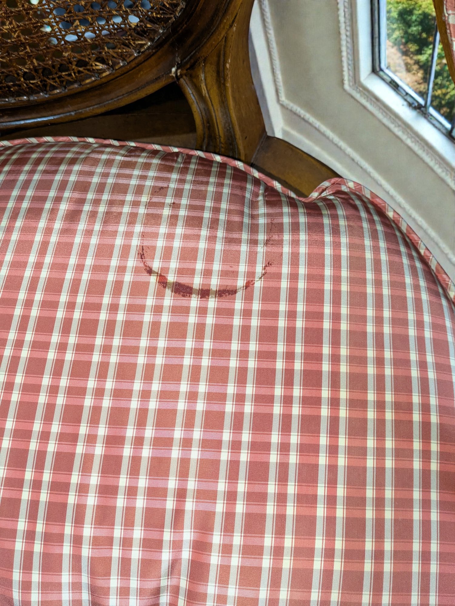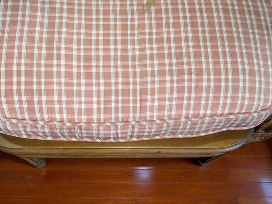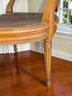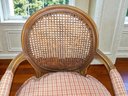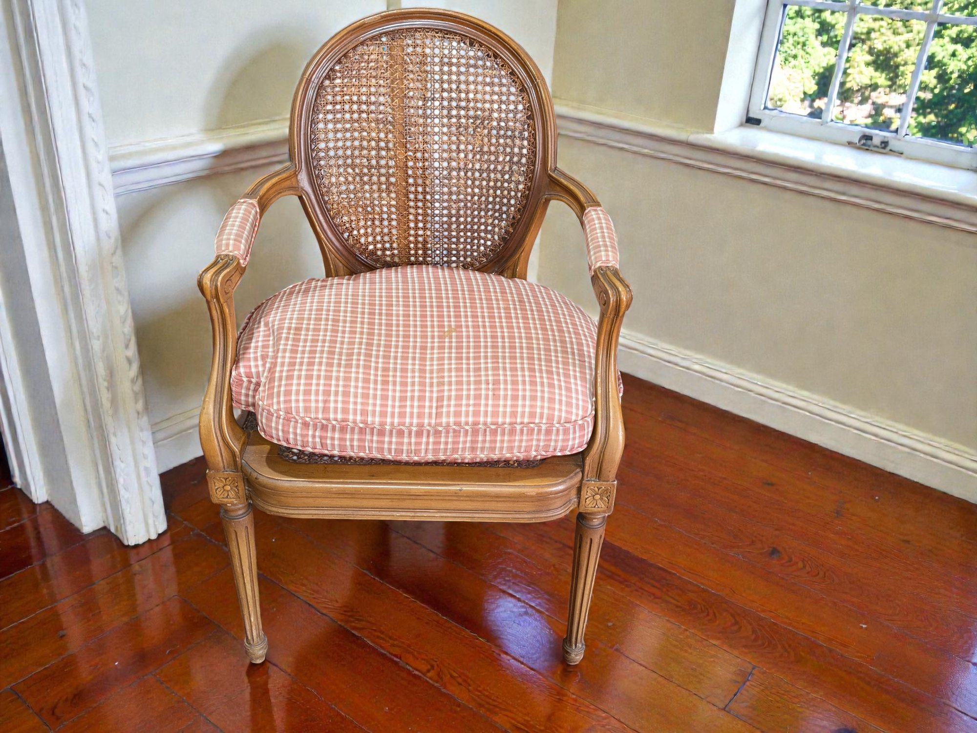 Features hand carved wood frame, walnut with a sculptured back, and padded armrests with a matching silk seat cushion and tapered fluted legs. Some wear to the cane, but no defects, and in very good vintage condition. There are some marks and wear to the frame, and the cushion has some stains. Overall, in Very Good Condition. Please see all photos as part of the description and condition. 23"W x 36.5"H x 23"D / Seat 21"H with the Cushion.