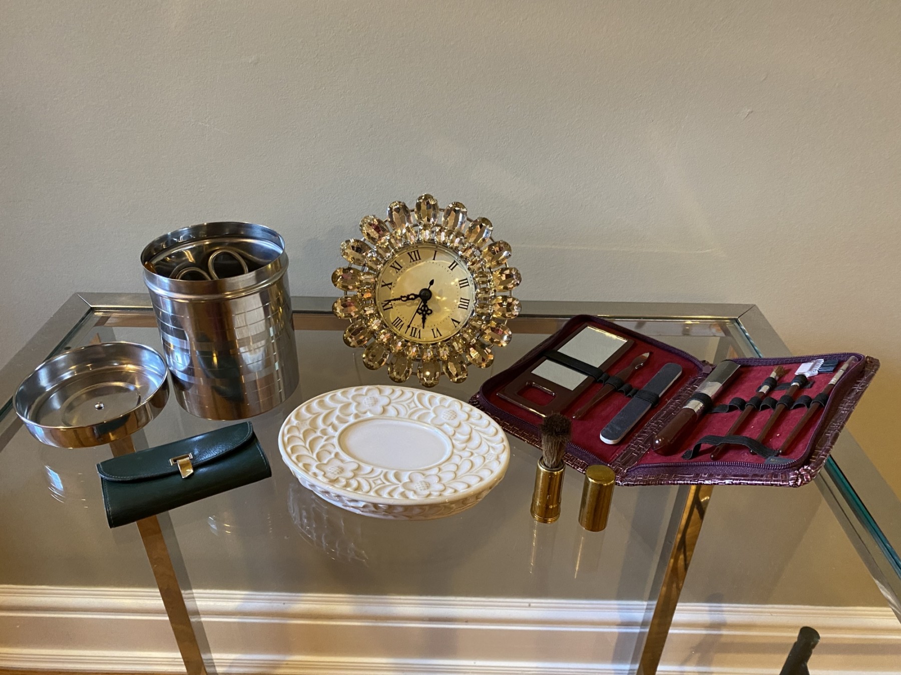 Decorative battery operated clock and ceramic dish are both in tact. All in new and or used condition, see all photos for details.