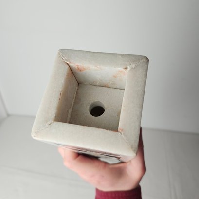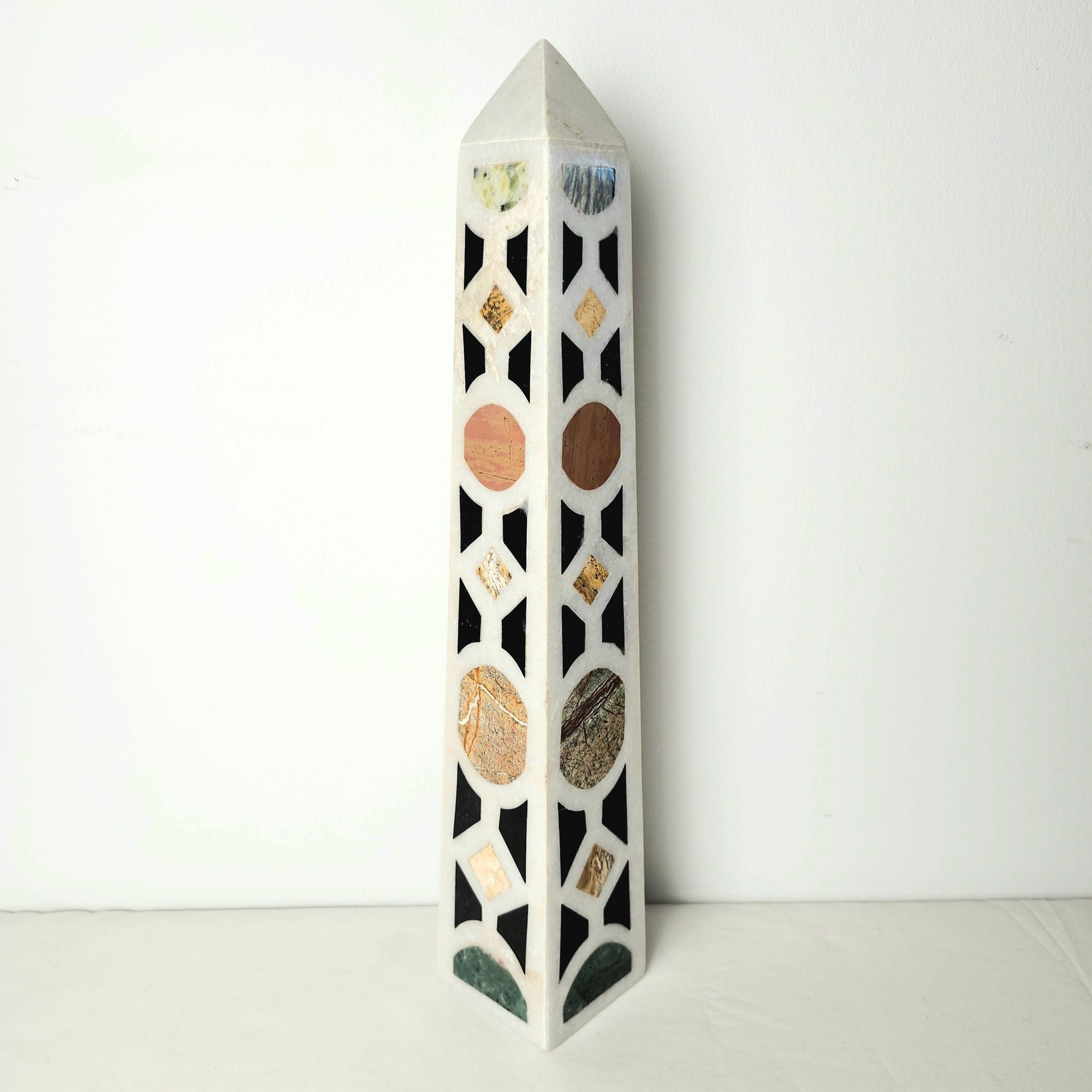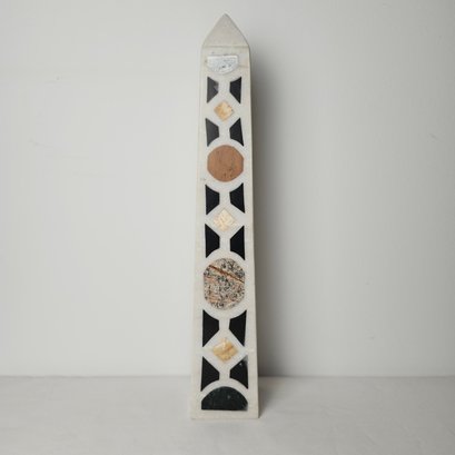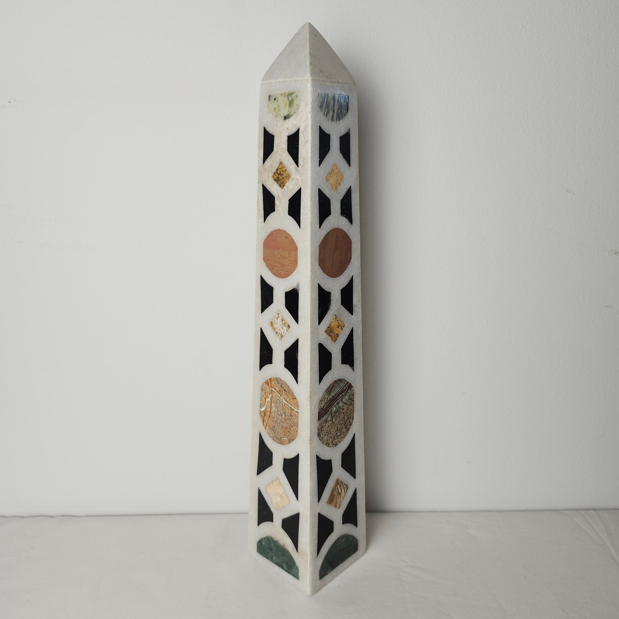 Lovely mixed stone obelisk. Alabaster or marble obelisk with decorative hardstone inlay.