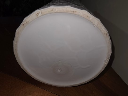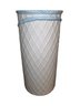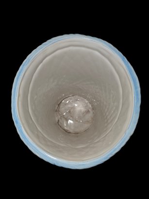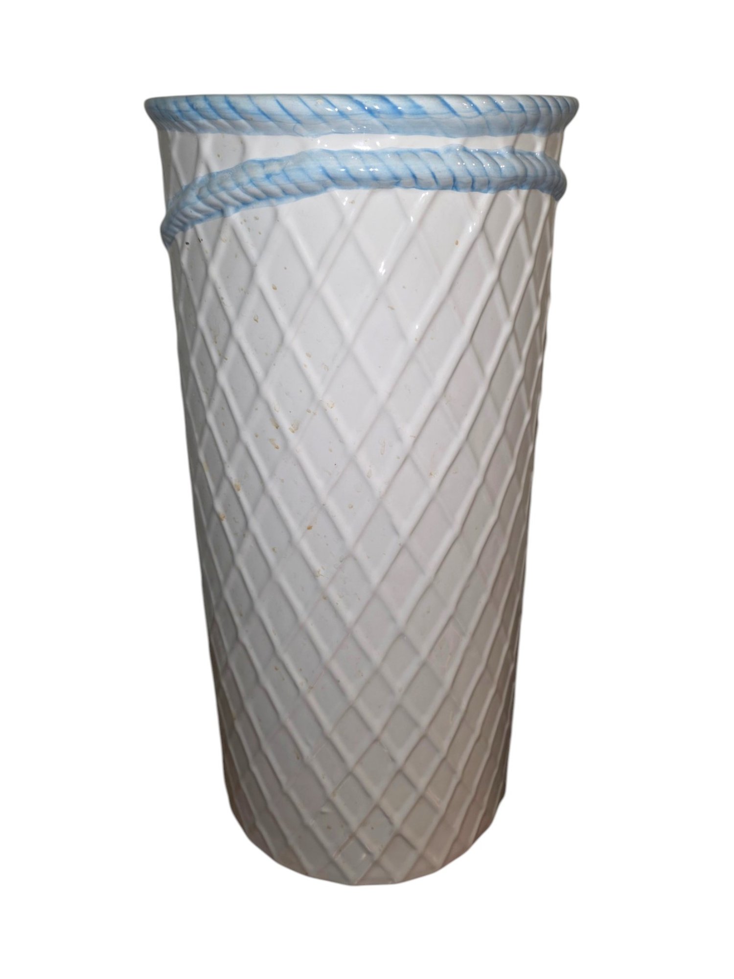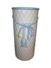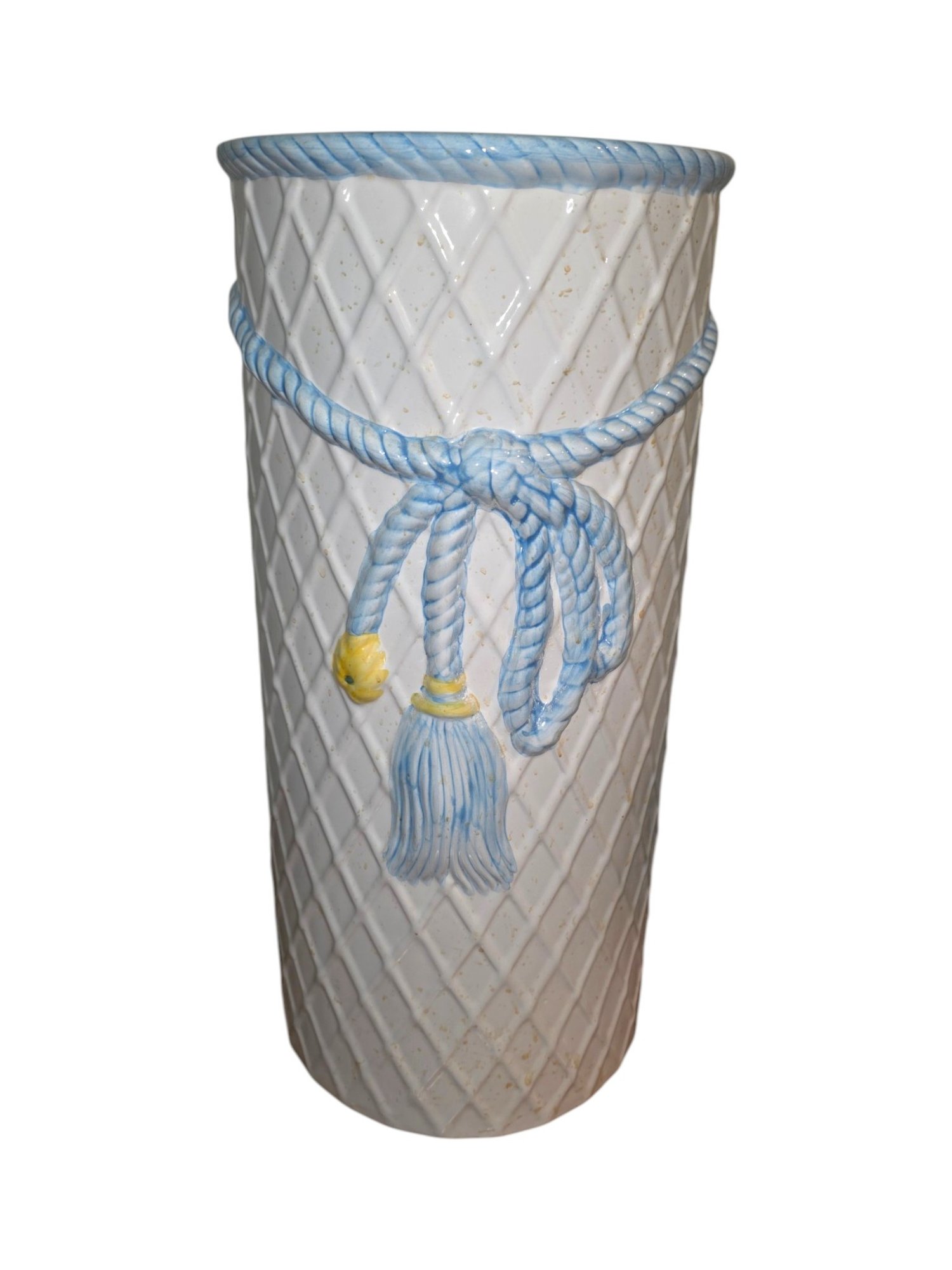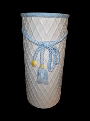 Vintage MCM Lane & Co. Tassel & Basketweave Umbrella Stand. White Ceramic Basketweave with Blue and Yellow Trompe L'oeil Design. Nice Piece for any Decor. (18" x 9").