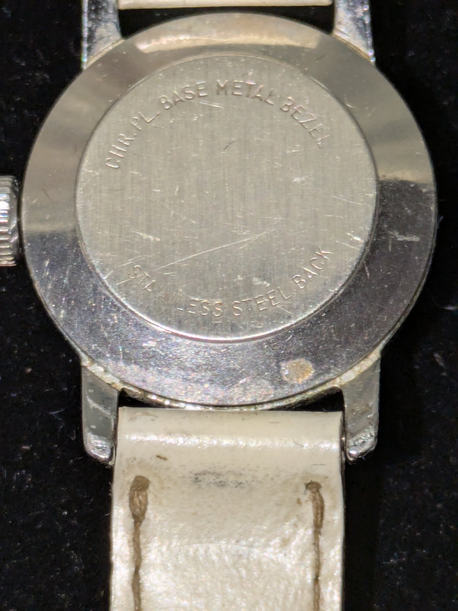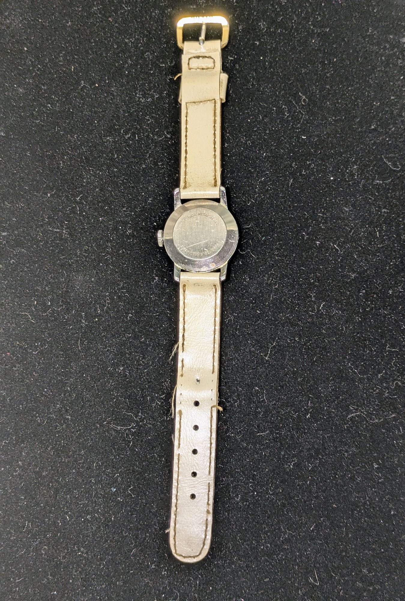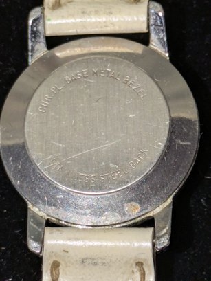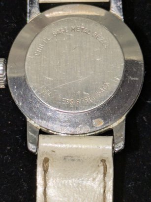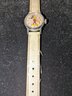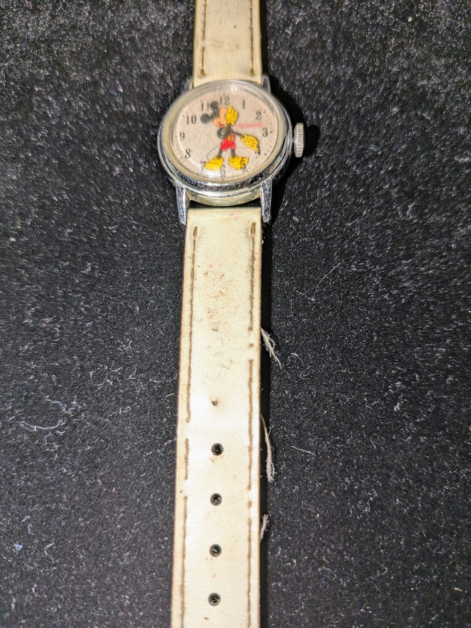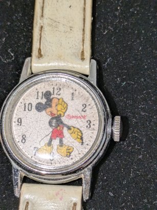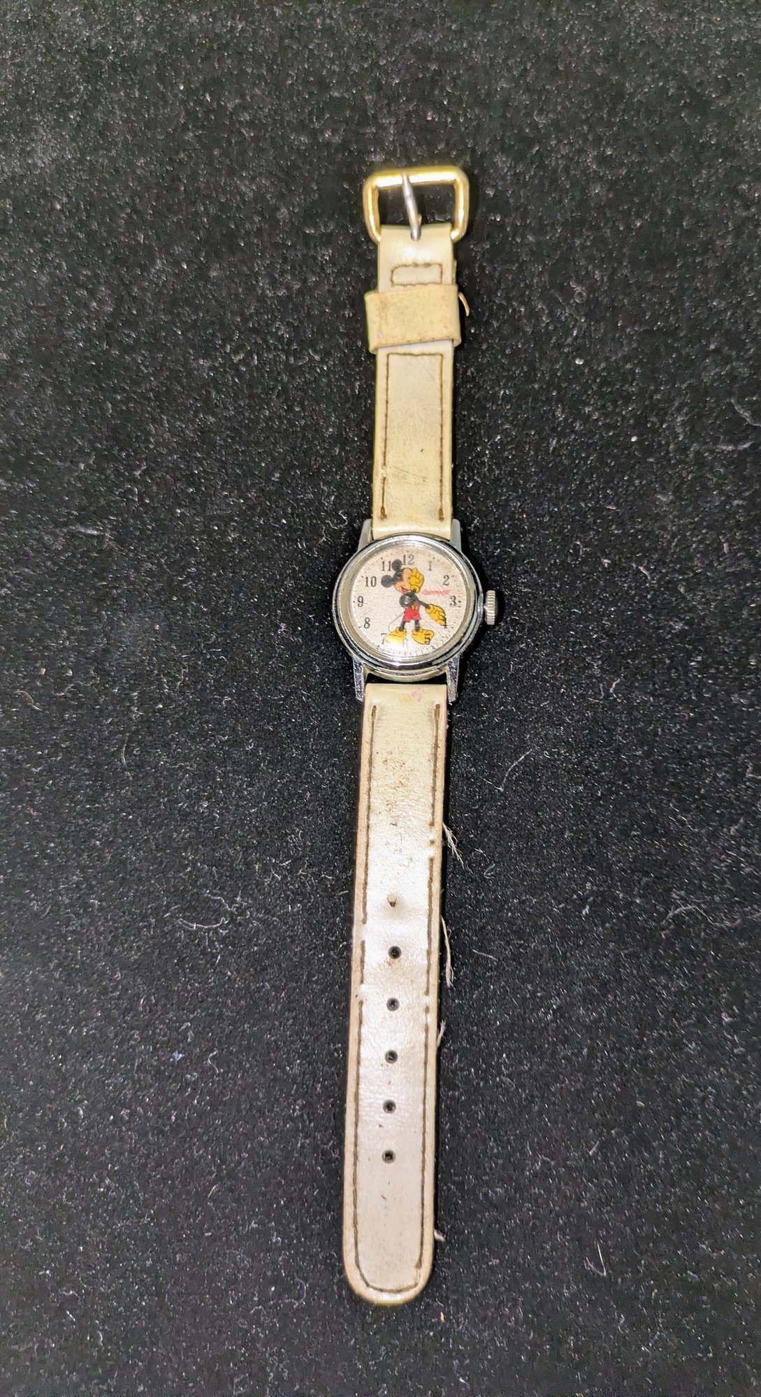 Features a leather strap and Mickey Mouse watch face design. The band and face both have marks and scratches, consistent with age and use. Please see all photos as part of the description and condition. 7"