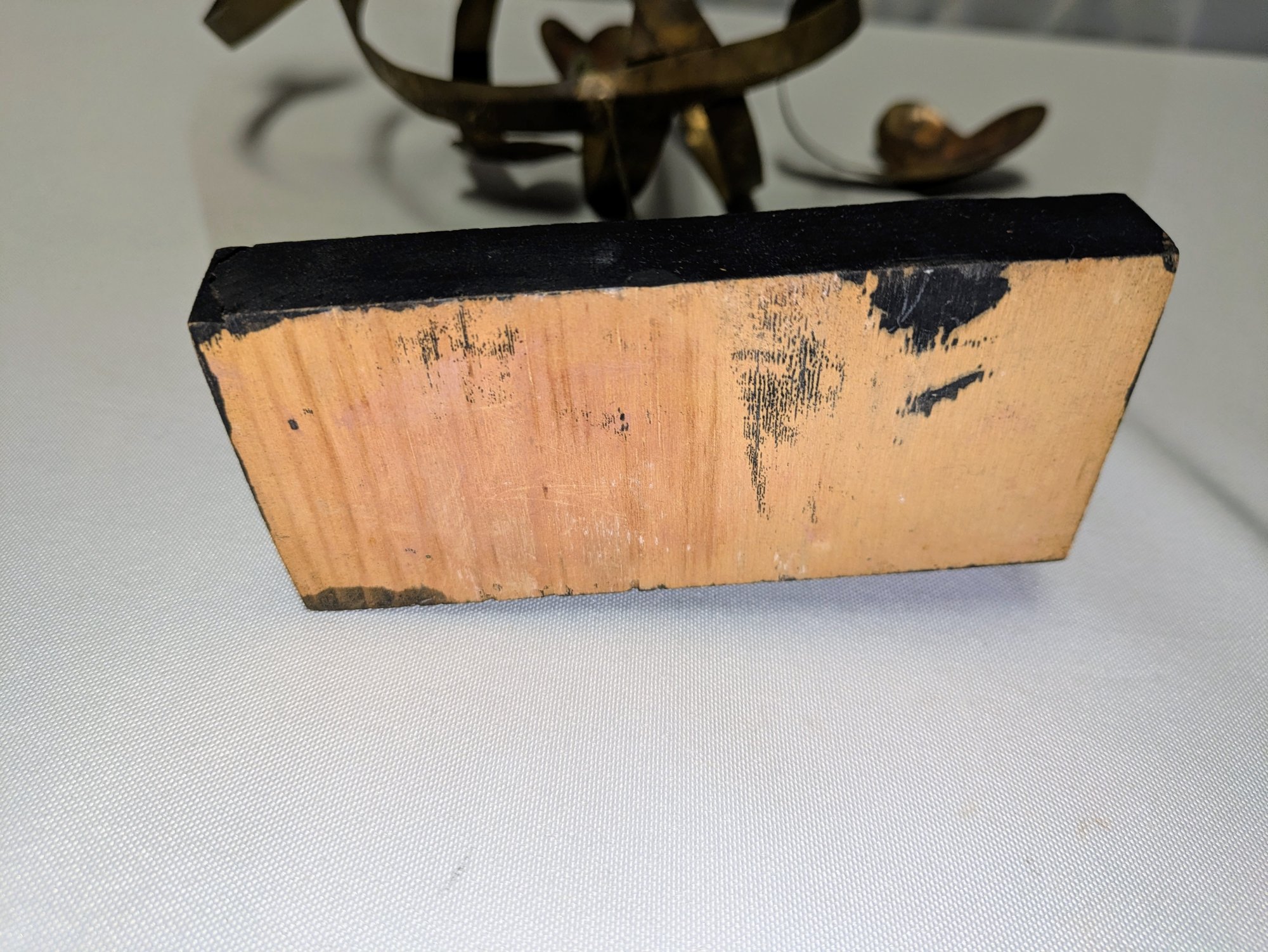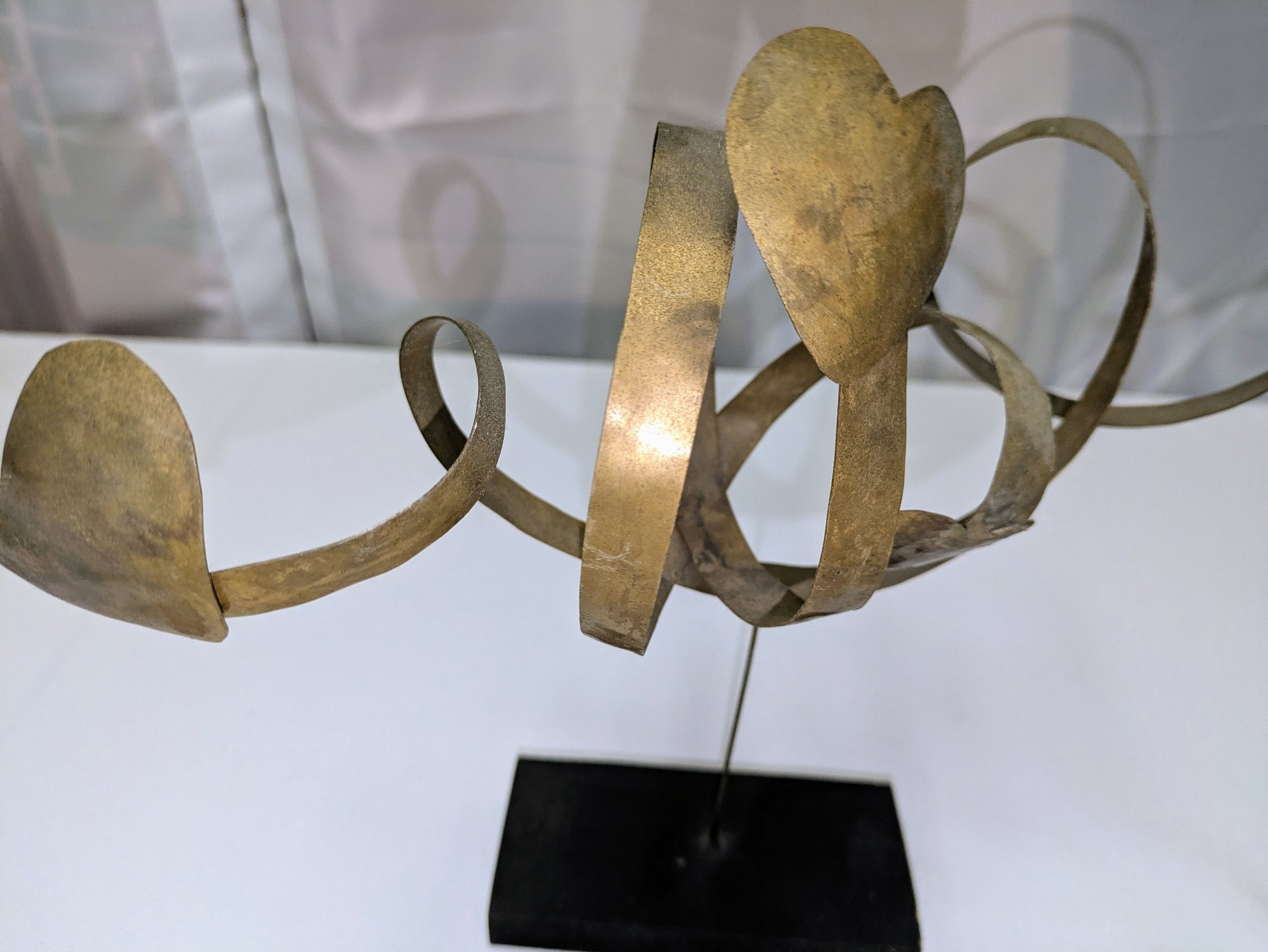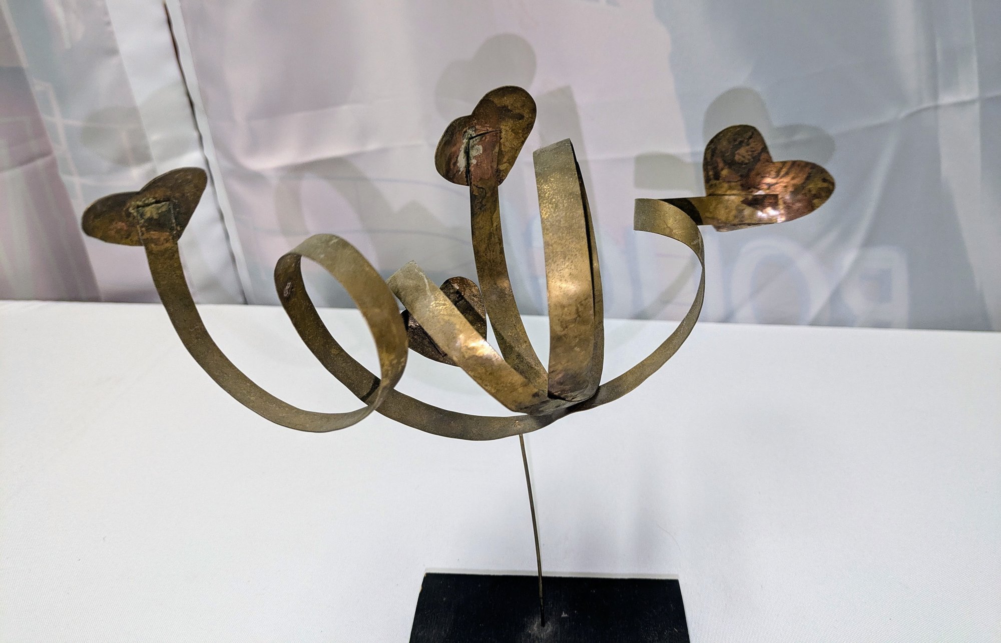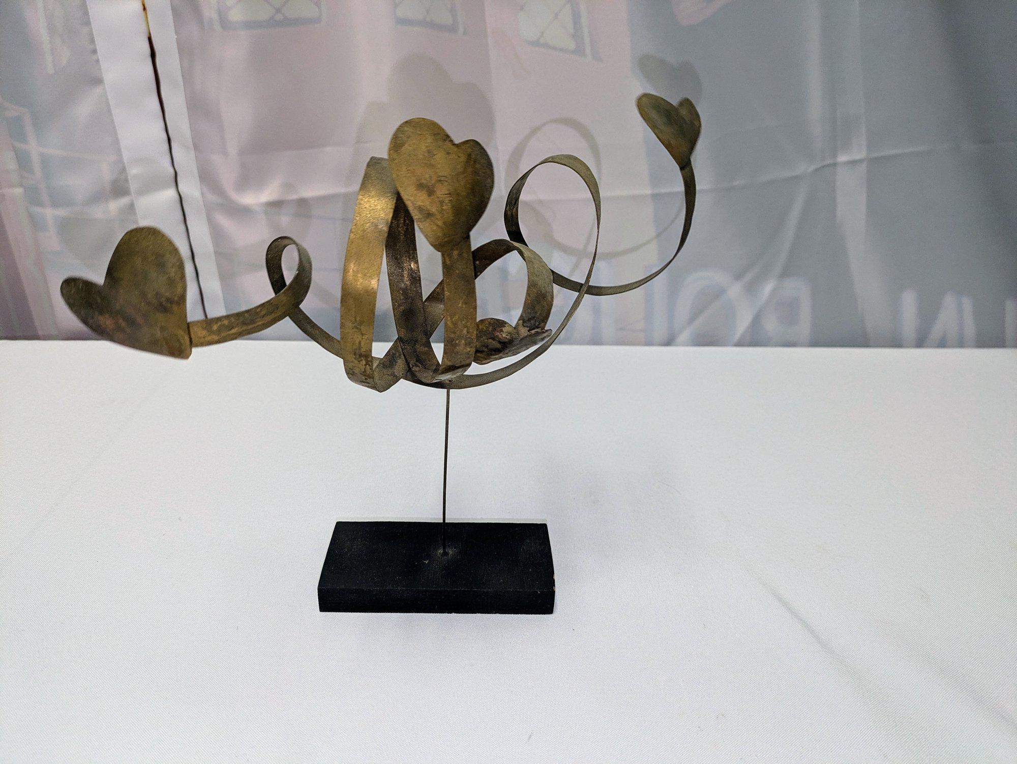 Beautiful Detail and Design, Features Hearts and Ribbon Design on a Thin Wire with a Black Painted Wood Base. Some light marks and slight paint wear on the base, consistent with age and movement. Overall, Very Good Condition. Please see all photos as part of the description and condition. 10.5"H x 11" / Base .75" x 2.5" x 5"