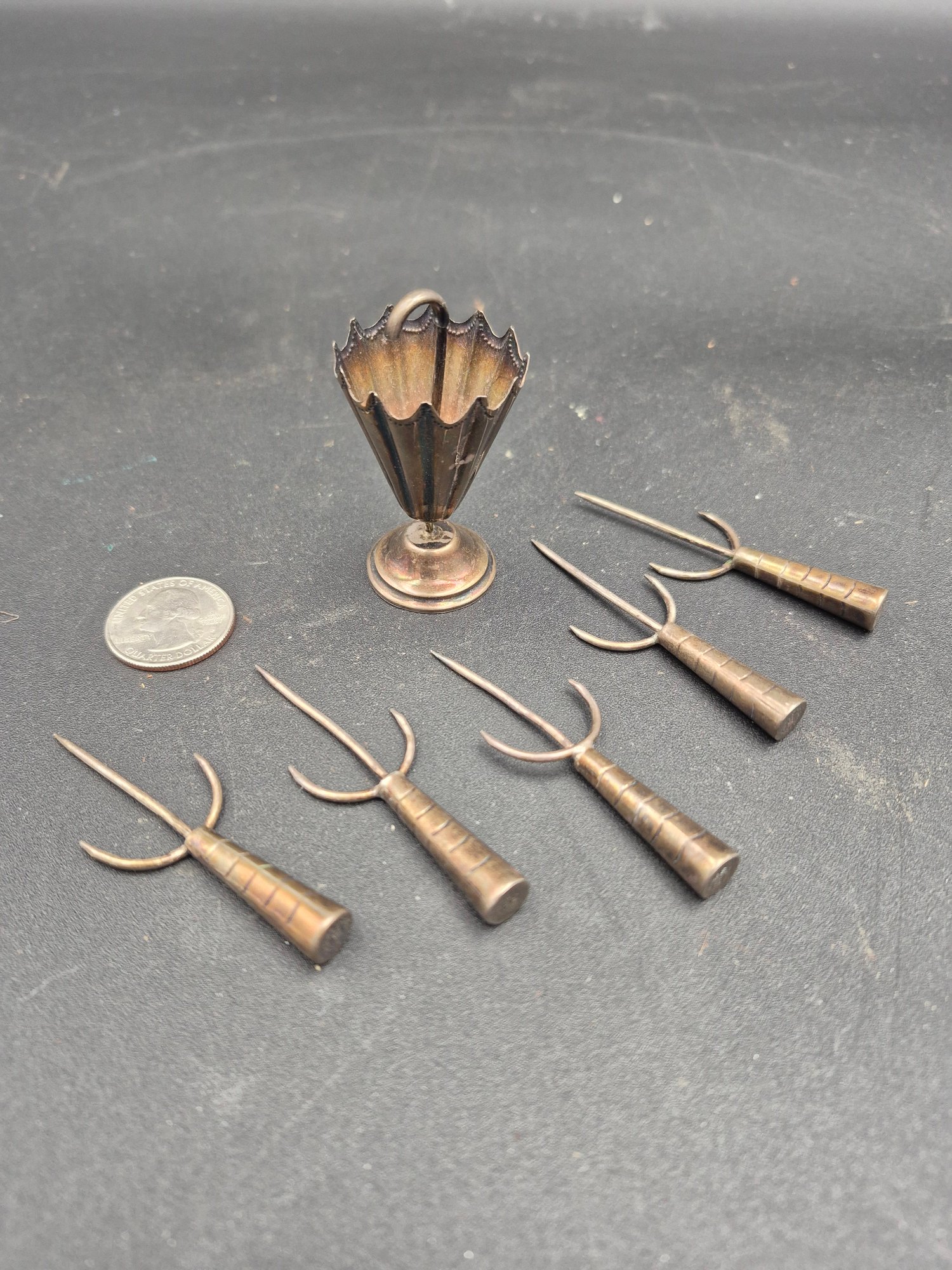 Marked 925 and sterling silver, Hecho en Mexico [made in Mexico], with silversmith maker's mark SG. In the shape of an umbrella on stand, with 5 trident picks. It has good age, likely made in the Taxco region.