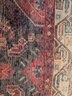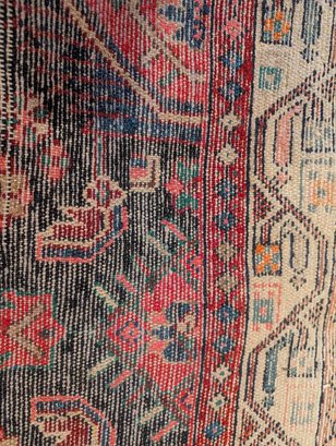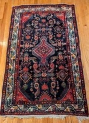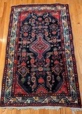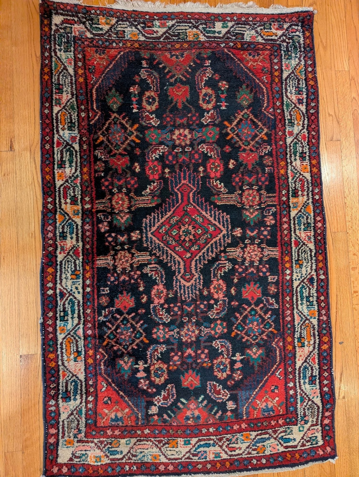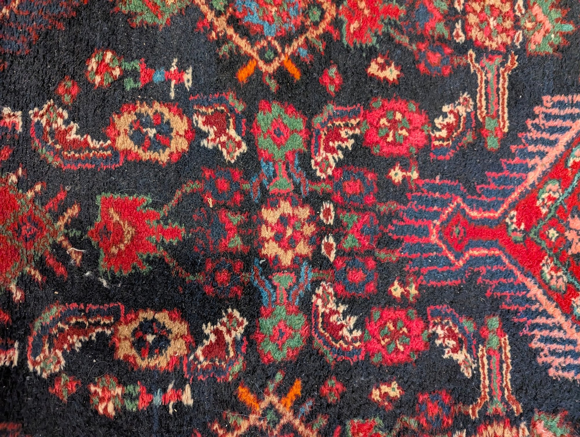 This specific rug likely was possibly made in the Hamadan area of Iran based on its distinct features that bear similarity to village-made pieces from Hamadan. These types of rugs are known for their geometric designs, often featuring a prominent central medallion on a field of deep navy/"night blue" or indigo, framed by intricate floral or tribal borders in vibrant red and ivory with "Boteh" (paisley-like/floral) motifs.