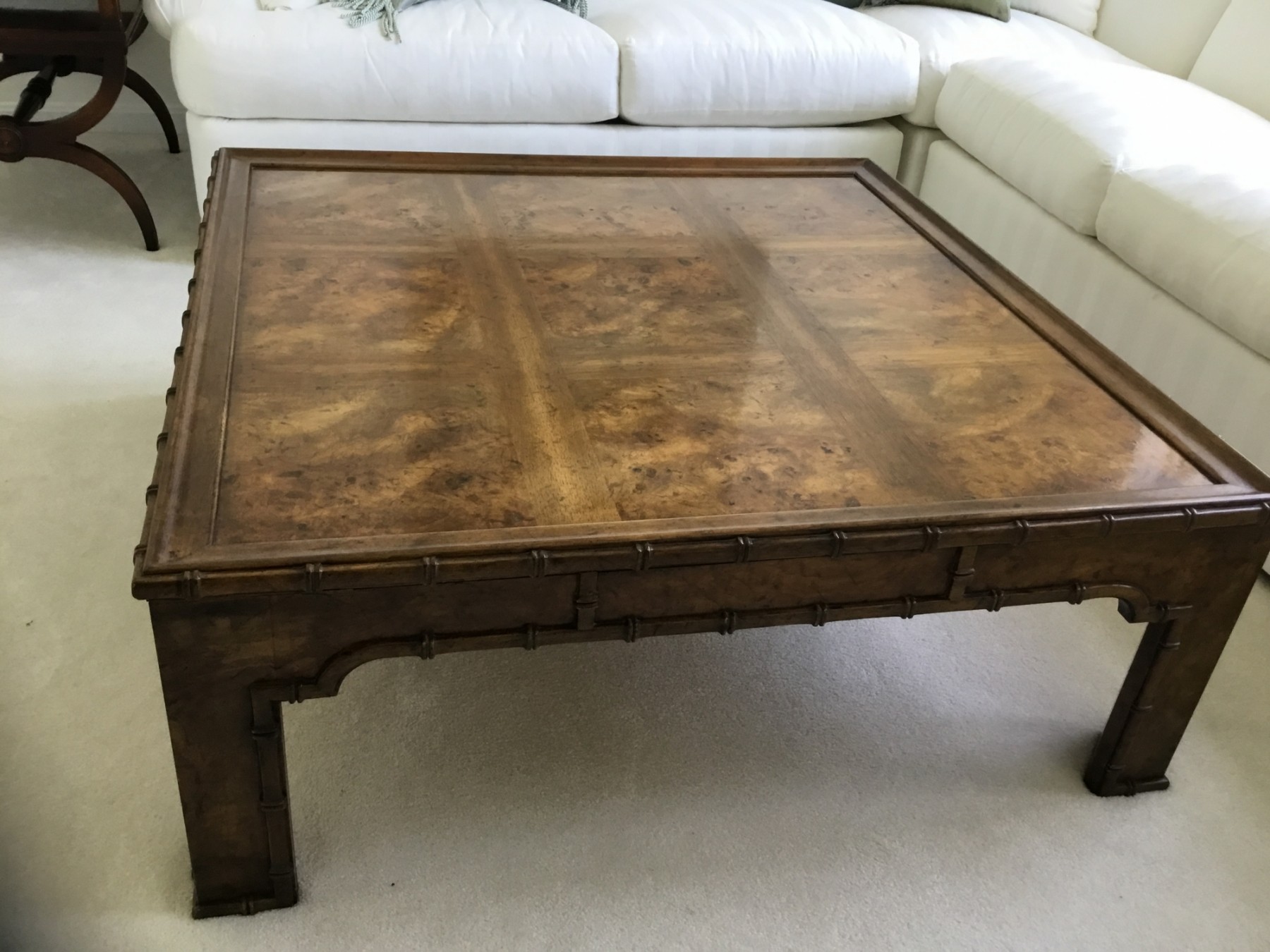 Features a mix of Brown Burl wood, carved solid wood and faux bamboo details. In great condition. Table is 43 in. Square