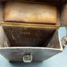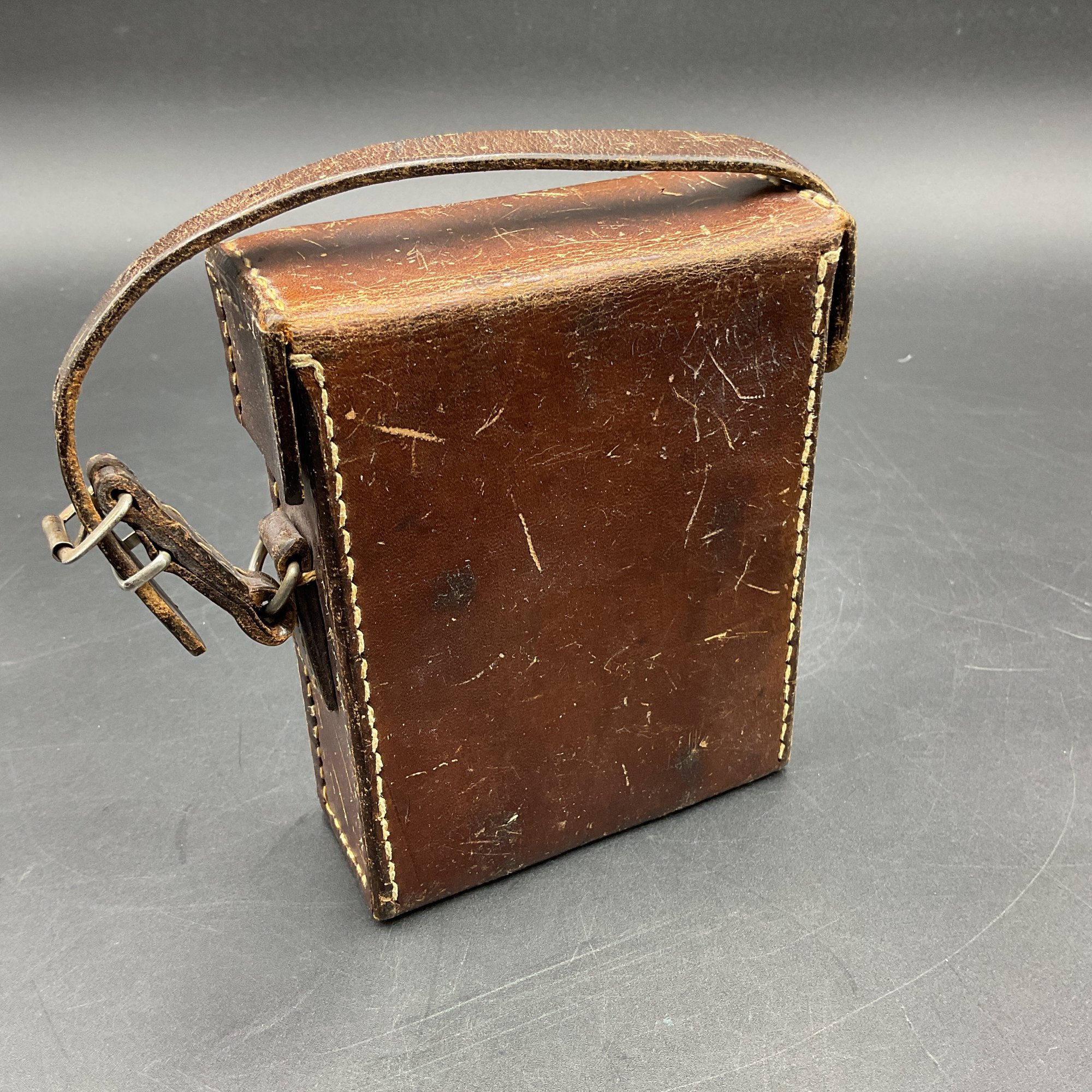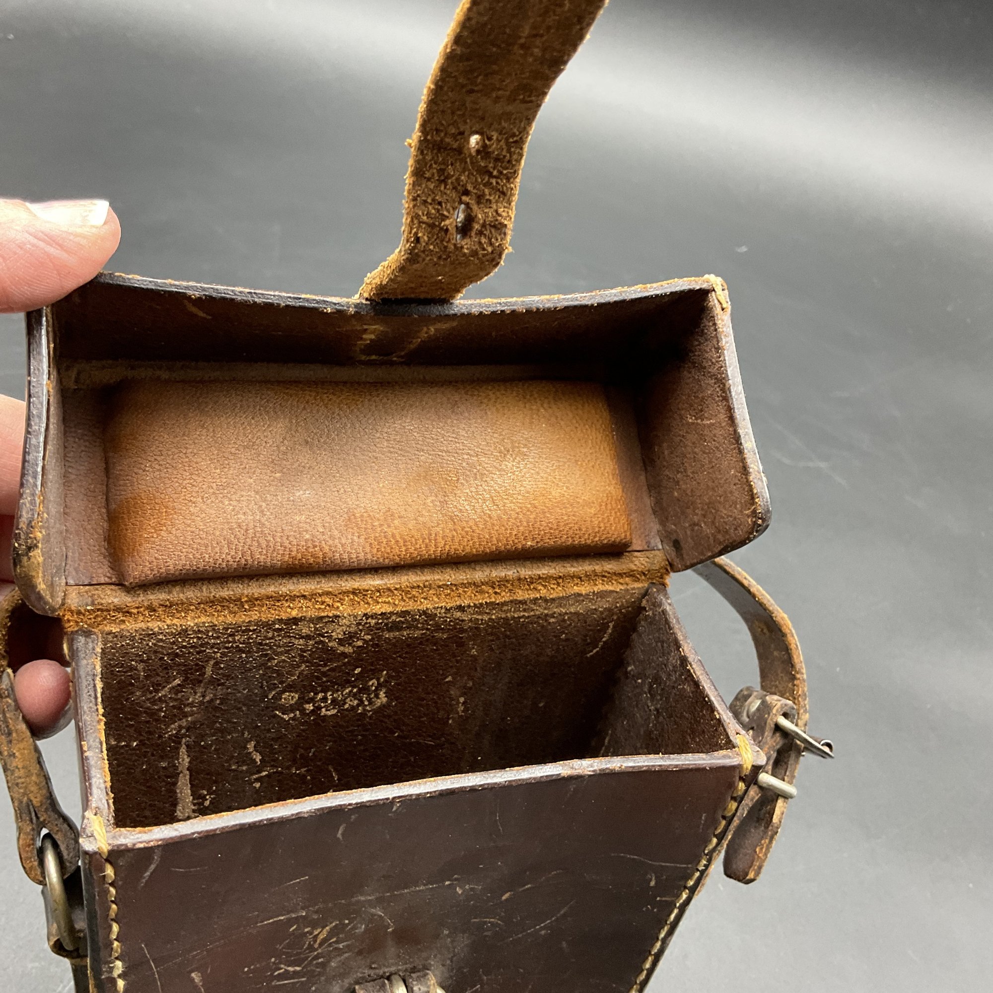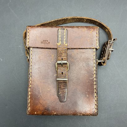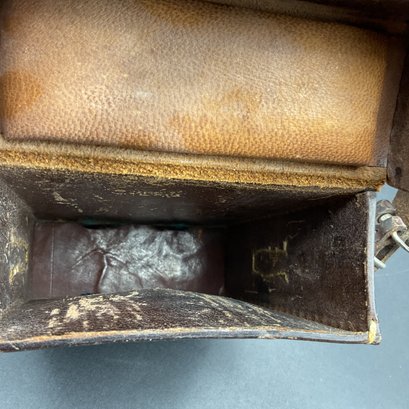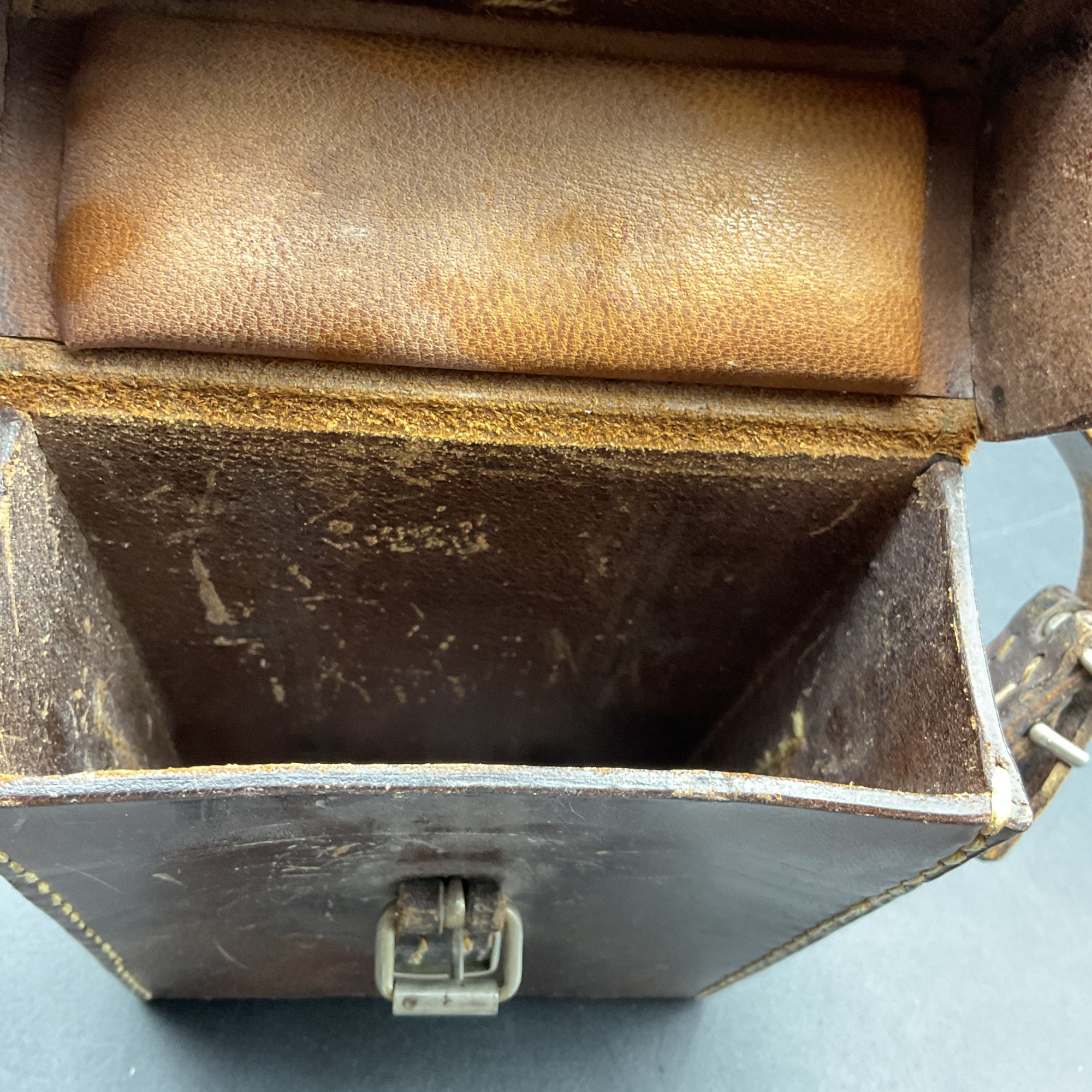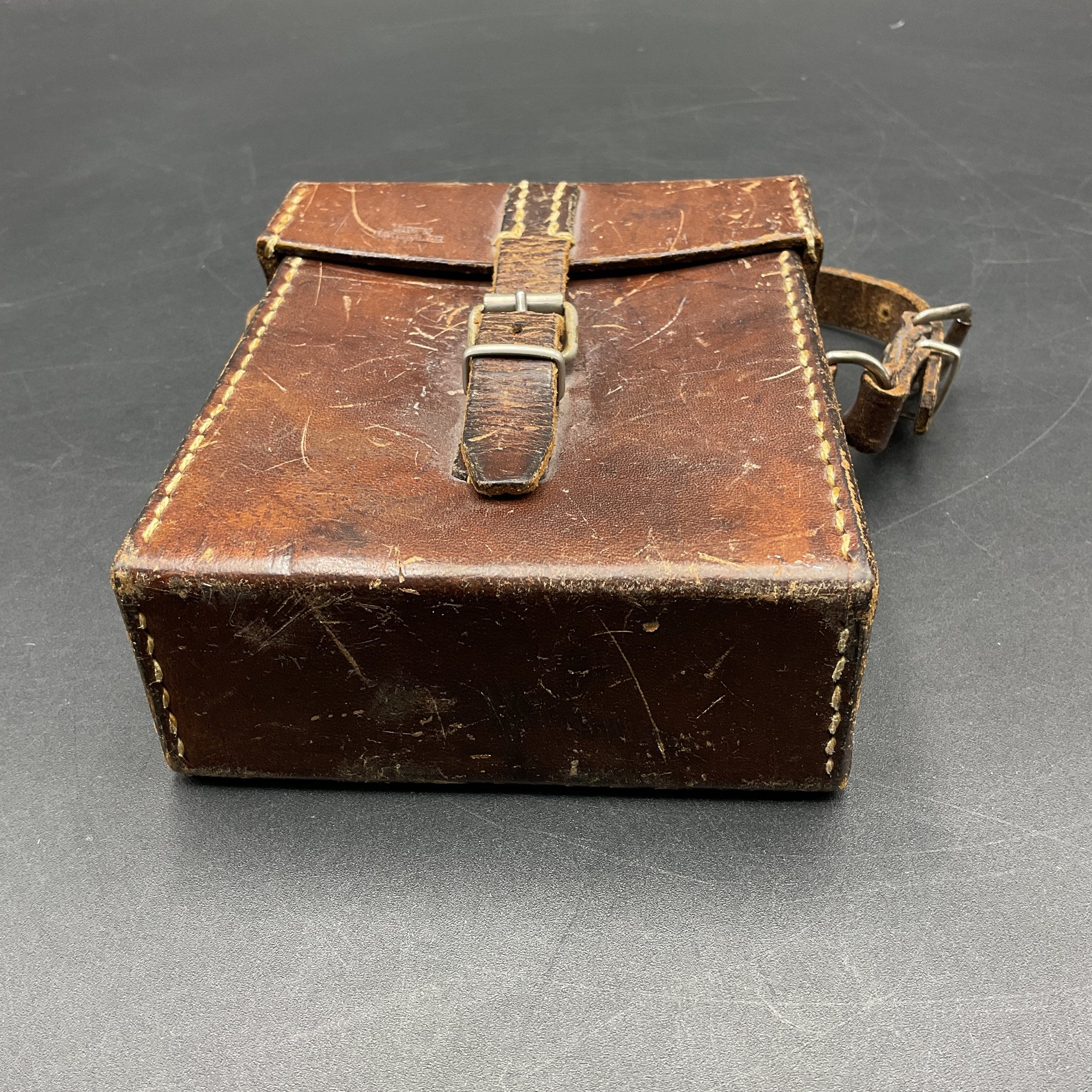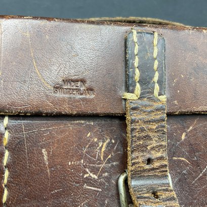 Marked Made in Switzerland, this is a small storage pouch made from thick saddle leather with short handle and buckle closure. Research indicates this may be a WWII era military pouch or possibly a vintage Swiss Army Medic bag. We originally thought it housed military binoculars but can't verify. We could not find anything exactly like it in our research, but similar bags sell for $150-200 online. Given its age, this is in outstanding condition. There are scuffs to the leather from age and use, but all stitching is intact as are the buckles and handle. The lid is also well attached with no separation of the leather and padded portion inside the lid looks great.