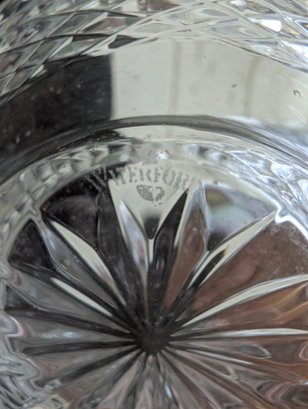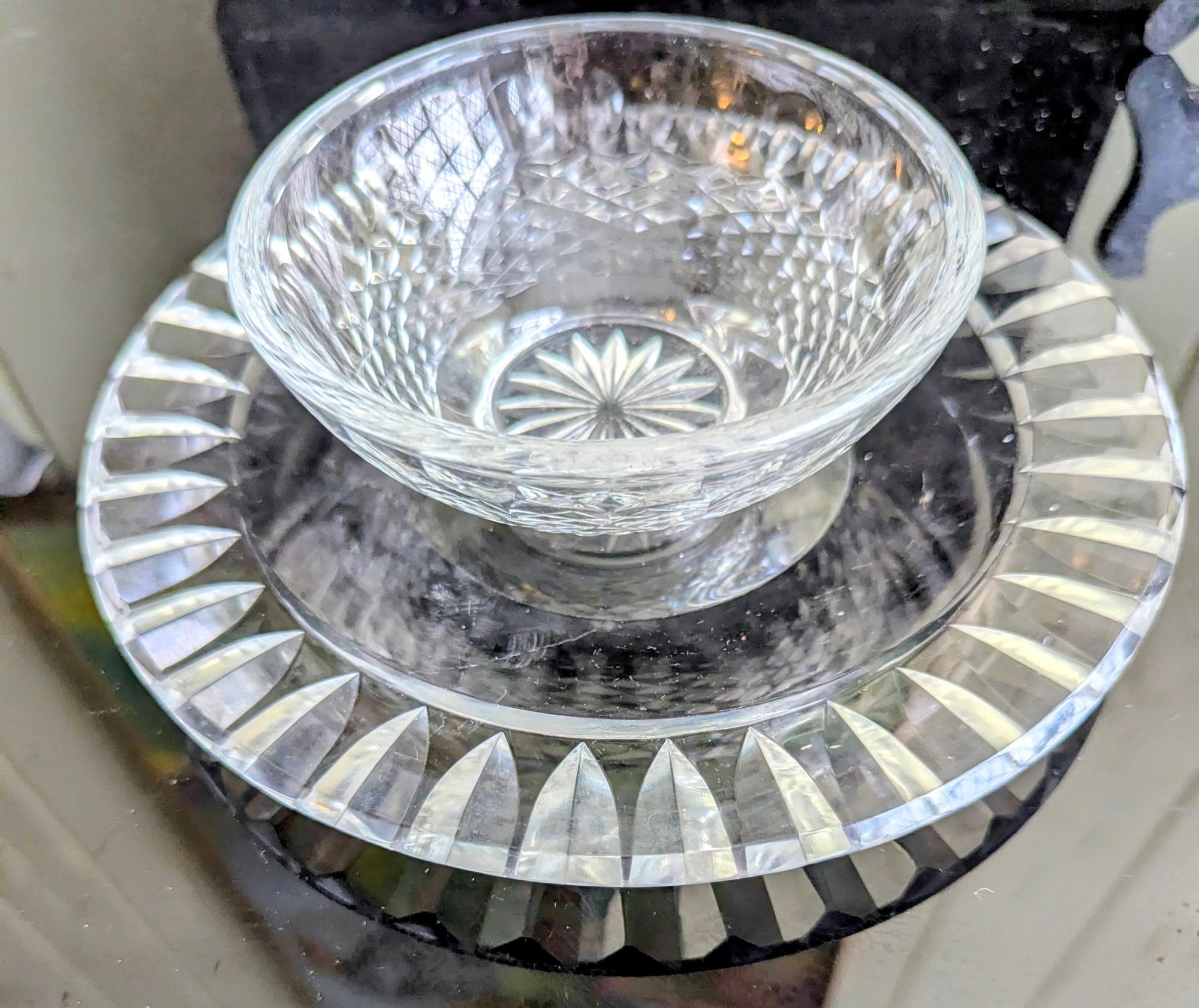The Bowl (Waterford): The small bowl features a classic, intricate diamond-and-wedge cut pattern (highly characteristic of the Waterford "Lismore" or a similar heritage pattern). The acid-etched "Waterford" mark on the bottom confirms its Irish origin. It is designed for serving desserts, berries, or finger sweets.
