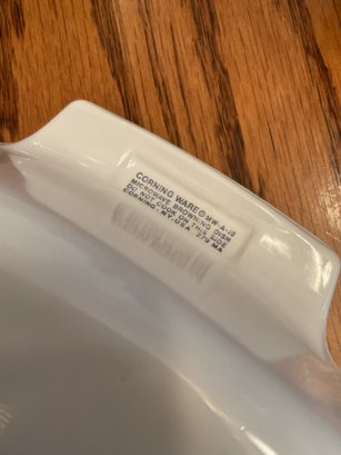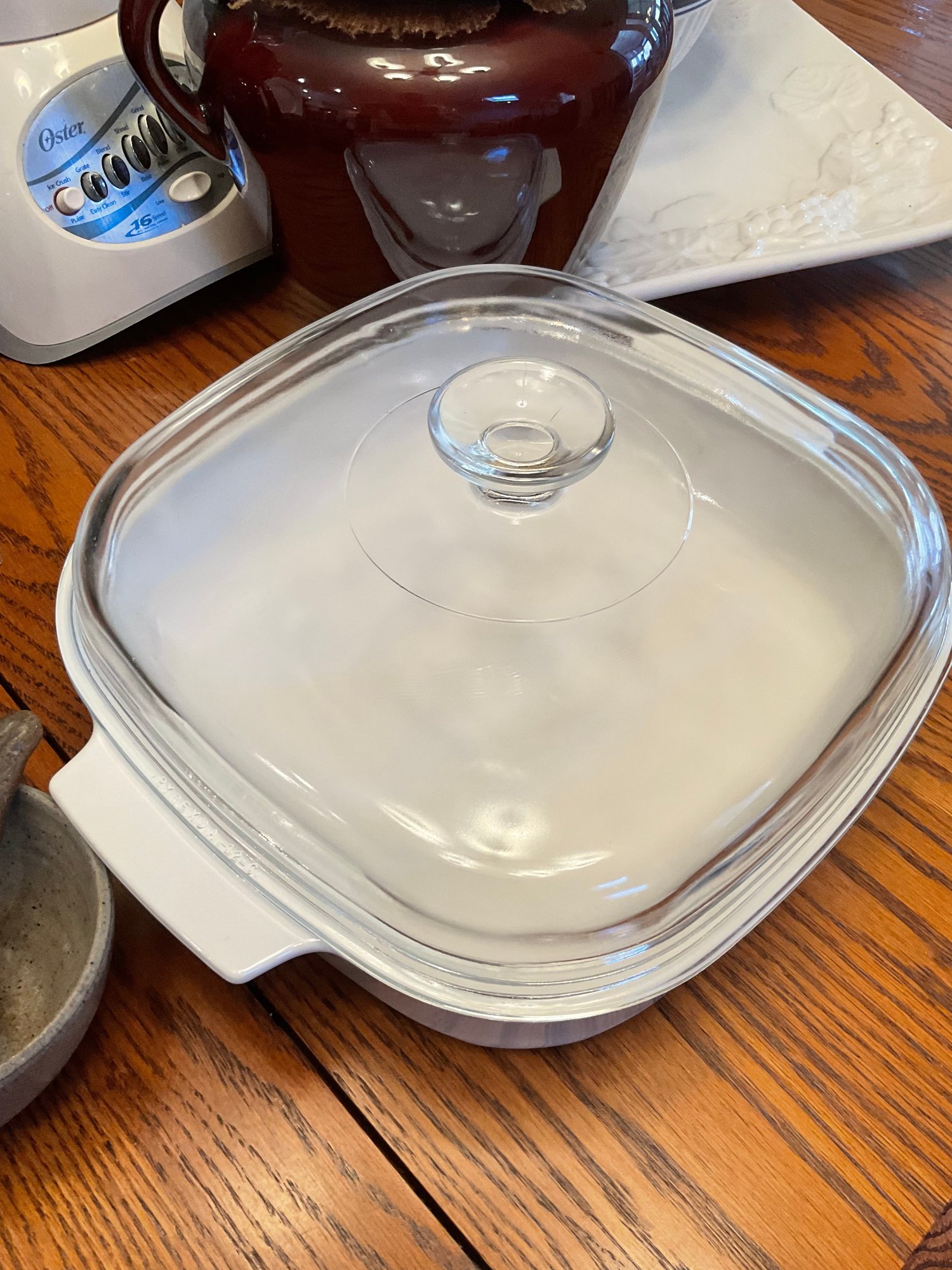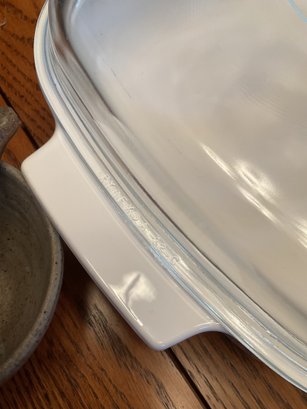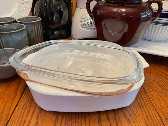 CorningWare Casserole Dish: Classic white square baker with a clear Pyrex lid.