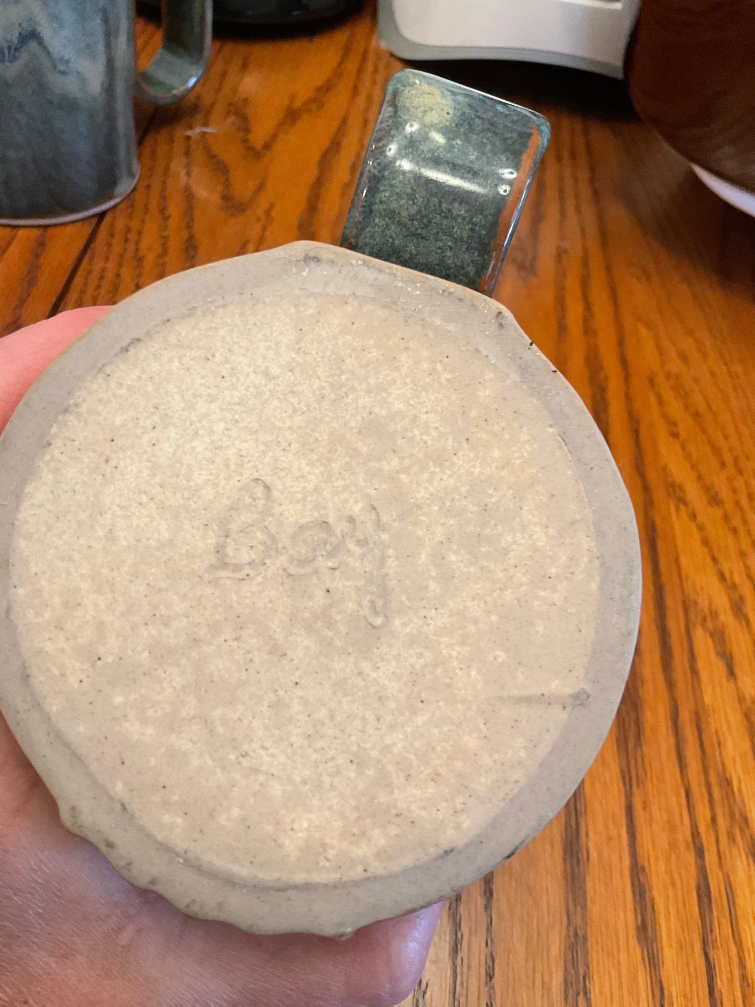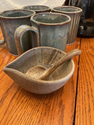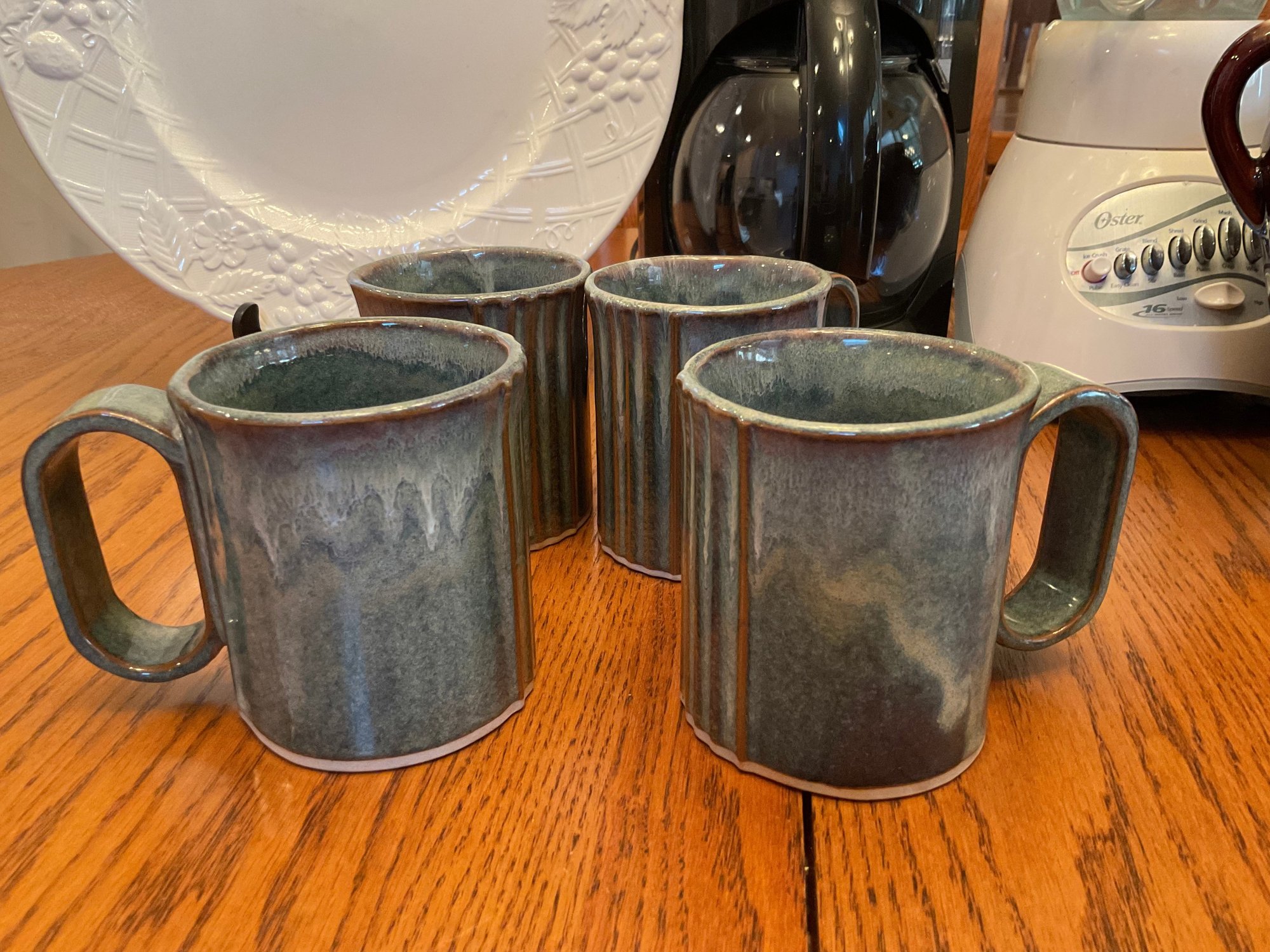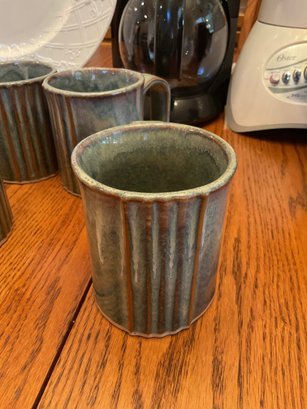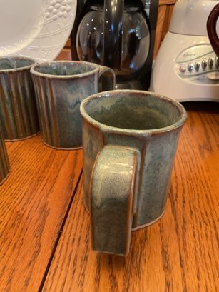 4 Pottery Glazed Mugs: Artisan-style green/brown drip glaze, marked "Bay" on the base.